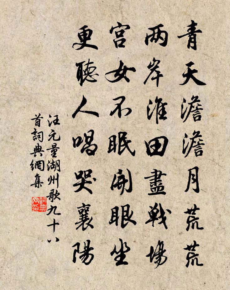 詩詞名句歷史字典書法欣賞書法字典國語詞典說文解字康熙字典古漢語字典標 題 作 者 詩 句 湖州歌九十八首作者:汪元量 朝代:宋代湖州歌九十八首原文青天澹澹月荒荒,兩岸淮田盡戰場。宮女不眠開眼坐,更聽人唱哭襄陽。詩詞問答問:湖州歌九十八首的作者是誰?答:汪元量問:湖州歌九十八首寫於哪個朝代?答:宋代問:汪元量的名句有哪些?答:汪元量名句大全汪元量湖州歌九十八首書法欣賞湖州歌九十八首書法作品詩詞推薦和晚菊三首廖行之〔宋代〕何事秋光老更清,故應有菊占秋榮。後來漢陛知薪積,晚出商山嘆翼成。三徑惟將松比操,東籬那為酒含英。紛紛和帥座勸農三首趙善括〔宋代〕光風駘蕩滿春亭,嶽麓雲開九疊屏。珍重元戎奉明詔,一犁膏雨曉痕青。同劉朔齋游白雲寺二首李昴英〔宋代〕沖暑登高人所憚,雲韓龍孟樂相從。眼窮溟海九萬里,身在蓬萊第一峰。潮長嶼低帆勢急,山迴路曲樹陰重。日斜雨後登西樓獨酌陸游〔宋代〕老覺人間無一欣,強尋高處看歸雲。天空列嶂開圖畫,水落寒江學篆文。四海道途行太半,百年光景近中分。交遊游龍門分題十五首伊川泛舟歐陽修〔宋代〕春雞漸生溜,演漾回舟小。沙禽獨避人,飛去青林杪。應化非真分第三十二釋印肅〔宋代〕說時不取相,相說卻成誑。不誑不謗時,如如真金像。送玉汝梅堯臣〔宋代〕談笑去拘忌,乃見相與深。風騷得往返,但見非知音。明日車馬北,豈不動離襟。春風蘼蕪綠,別恨生遙岑。又次韻謝子立之惠紅絲花晃沖之〔宋代〕老來嗜酒無賓主,我醉應眠不遣卿。如許此花同九日,為君采掇笑淵明。和道損喜雪梅堯臣〔宋代〕密雪已迎臘,隨風來拂巾。偏知寒夜屋,不管醉歸人。暗積空庭合,偷裝眾樹新。沃田將望歲,壓癘且忘貧。薄厚促纖嘆舒岳祥〔宋代〕刺刺重刺刺,唧唧復唧唧。只解促鬢絲,豈能催婦纖。纖亦何用催,有絲願成匹。今夏蠶薄收,巧手閒刀尺。昨下送鄭佶歸洛陽司空曙〔唐代〕蒼蒼楚色水雲間,一 * 送爾還。何處鄉心最堪羨,汝南初見洛陽山。佚老亭錢聞詩〔宋代〕膠膠朝路七書考,請紱星江恨不早。昔詫廬山心未然,今見廬山真是好。子卜子家廬山傍,龐眉鶴髮商山皓。老而宿天台石橋林季仲〔宋代〕今人議論只從多,簣土那能障大河。我有室廬亦方廣,歸途不向石橋過。次韻柳見答蘇轍〔宋代〕桂酒無人寄豫章,〈江西官釀,惟豫章最佳。〉羈愁牢落遣誰當。烹煎崖蜜真牽強,慚愧山蜂久蓄藏。江上會鱸酬盧十一過宿皇甫冉〔唐代〕乞還方未遂,日夕望雲林。況復逢春草,何勞問此心。閉門公務散,枉策故情深。遙夜他鄉酒,同君梁甫吟。景祐祀感生帝二首佚名〔宋代〕濬髮長源,奧惟始祖。五運協圖,萬靈來彷。官捕虎行滕岑〔宋代〕世無壯士力扼虎,群虎食人人莫御。上官付之無奈何,懸賞謾令招獵戶。獵戶徒腎逐麕麂,初非法中虎匠比。心膽趙南康可齋築屋武康孟保園池喬木極有思致東董嗣杲〔宋代〕東遊英溪英,妙寄寒苦詩。里社今有井,誰構亭覆之。想彼異代賢,孤標奪葳蕤。可齋出帝胄,結廬探幽奇。分符陸務觀赴闕經從留飲韓元吉〔宋代〕溪岩風高霜作棱,杯盤草草對青燈。已甘鹽菜待梁柳,況有酒漿延杜陵。歲晚鬢毛紛似雪,天寒門巷冷於冰。春風西江月蘇瓊〔宋代〕韓愈文章蓋世,謝安情性風流。良辰美景在西樓。敢勸一卮芳酒。記得南宮高第,弟兄爭占鰲頭。金爐玉殿瑞煙浮名句推薦嘆息此人去,蕭條徐泗空李白《經下邳圯橋懷張子房》 何處征帆木末去,有時野鳥沙邊落。吳潛《滿江紅·豫章滕王閣》 酒賤常愁客少,月明多被雲妨。蘇軾《西江月·世事一場大夢》 金柳搖風樹樹,系彩舫龍舟遙岸。柳永《破陣樂·露花倒影》 山氣日夕佳,飛鳥相與還。陶淵明《飲酒·其五》 日落謝家池館,柳絲金縷斷。韋莊《歸國遙·春欲晚》 佳辰強飲食猶寒,隱几蕭條戴鶡冠。杜甫《小寒食舟中作》 初驚河漢落,半灑雲天裡。李白《望廬山瀑布水二首》 到家應是,童稚牽衣,笑我華顛。吳激《訴衷情·夜寒茅店不成眠》 亂碧萋萋,雨後江天曉。梅堯臣《蘇幕遮·草》