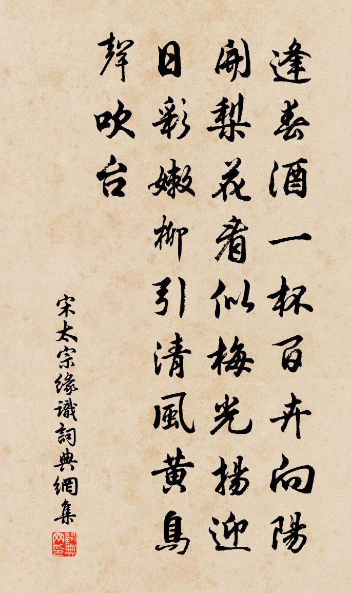 詩詞名句歷史字典書法欣賞書法字典國語詞典說文解字康熙字典古漢語字典標 題 作 者 詩 句 緣識作者:宋太宗 朝代:宋代緣識原文逢春酒一杯,百卉向陽開。梨花看似梅,光揚迎日彩。嫩柳引清風,黃鳥聲吹台。詩詞問答問:緣識的作者是誰?答:宋太宗問:緣識寫於哪個朝代?答:宋代宋太宗緣識書法欣賞緣識書法作品詩詞推薦酬談少府李白〔唐代〕一尉居倏忽,梅生有仙骨。三事或可羞,匈奴哂千秋。壯心屈黃綬,浪跡寄滄洲。昨觀荊峴作,如從雲漢游。老夫南歌子王吉昌〔元代〕燭點心光吐,雲收性月輝。一壺冰瑩振風威。萬象參羅,魁斗斡璇璣。造化無為理,恢恢道化巍。冥冥杳杳契天機雪十二韻可止〔唐代〕落處鹹過尺,翛然物象淒。瑞凝金殿上,寒甚玉關西。潤比江河普,明將日月齊。凌雲花頂膩,鎖徑竹梢低。出谷野草花釋文珦〔宋代〕心愛無名草,閒花取次開。自能追造化,渾不假栽培。姚魏傷攀折,楩柟因剪裁。只因非世用,長得保根荄。豫章上游生米市前江中洲上至德觀側柏樹甚老曾豐〔宋代〕何命之薄彼載柏,豈無生處生於石。老去根猶強自爭,春來石豈能相戹。蛟龍拔入盤重淵,雪霜放出參九天。至大獻元載書生〔唐代〕城東城西舊居處,城裡飛花亂如絮。海燕銜泥欲下來,屋裡無人卻飛去。樂飲王洋〔宋代〕何意親杯杓,初期樂性真。若教狂勝德,多被酒忘身。談笑交情密,氤氳酒力醇。勸酬如錯雜,莫過兩三巡。范至能游靈石錄示詩仙留題雲李洪〔宋代〕勝概風生步武,山靈景從歸雲。塵世欲尋飈馭,藤陰萬個蒼筠。贈道者朱慶餘〔唐代〕自識來清瘦,尋常語論真。藥成休伏火,符驗不傳人。獨有年過鶴,曾無病到身。潛教問弟子,居處與誰鄰。致政龍圖給事吳公輓詞二首韓元吉〔宋代〕風采儀三院,循良著六州。譽高青瑣闥,名動紫雲樓。經世余閎議,興邦閟遠猷。君王問黃髮,柱石可能留。贈王弘遠曹攄〔魏晉〕爾樂伊何。志逸樂深。太府堂堂。閒房愔愔。旱不厭日。水不患霖。入歡卓氏。出玩秦針。寵妻懷目。嬖子娛心。詩一首王軫〔宋代〕南篇司馬青衫濕,北句郎官白髮生。堪與江黃永傳唱,離騷經外此歌聲。晚出劉克莊〔宋代〕晚出別村乾,夜深徒步歸。飯猶懸早稼,衣尚在鄰機。關塞秋防急,田園歲入微。喟然投耒嘆,事事與心違。次韻方教采芹亭方岳〔宋代〕客懷老去向誰開,白雪莖莖不用栽。只有愛書余習在,持攜殘藁過溪來。張祜佚名〔唐代〕上水船,風大急。帆下人,須好立。(令狐綯)上水船,船底破。好看客,莫倚柁。(張祜)客游旅懷姚合〔唐代〕客行無定止,終日路岐間。馬為賒來貴,僮緣借得頑。詩書愁觸雨,店舍喜逢山。舊業嵩陽下,三年未得還。寄歐陽詹太原妓〔唐代〕自從別後減容光,半是思郎半恨郎。欲識舊來雲髻樣,為奴開取縷金箱。卜運算元(茉莉)劉克莊〔宋代〕老圃獻花來,異域移根至。相對炎官火傘中,便有清涼意。淡薄古梳妝,嫻雅仙標緻。欲起涪翁再品花,壓了山礬貴妃閣端午帖子許應龍〔宋代〕淑德儀宮閫,天教受祉繁。艾人暨桃印,奚用更懸門。題石磧明因院因李端叔韻王之道〔宋代〕楚漢干戈地,巋然見此山。艱難思帝業,牢落漫禪關。野鳥驚人散,江湖到岸邊。明朝又東去,空羨阿師閒。名句推薦及時當勉勵,歲月不待人。陶淵明《雜詩·人生無根蒂》 草木雖無情,因依尚可生李白《樹中草》 悵然孤嘯,青山故國,喬木蒼苔。倪瓚《人月圓·傷心莫問前朝事》 惜分長怕君先去,直待醉時休。賀鑄《眼兒媚·蕭蕭江上荻花秋》 賈傅松醪酒,秋來美更香。杜牧《送薛種游湖南》 飛絮濛濛。垂柳闌乾盡日風。歐陽修《採桑子·群芳過後西湖好》 豆雨聲來,中間夾帶風聲。蔣捷《聲聲慢·秋聲》 冠必正,紐必結。襪與履,俱緊切。李毓秀《弟子規·謹》 丈夫志四海,萬里猶比鄰。曹植《贈白馬王彪·並序》 枯藤老樹昏鴉,小橋流水人家,古道西風瘦馬。馬致遠《天淨沙·秋思》