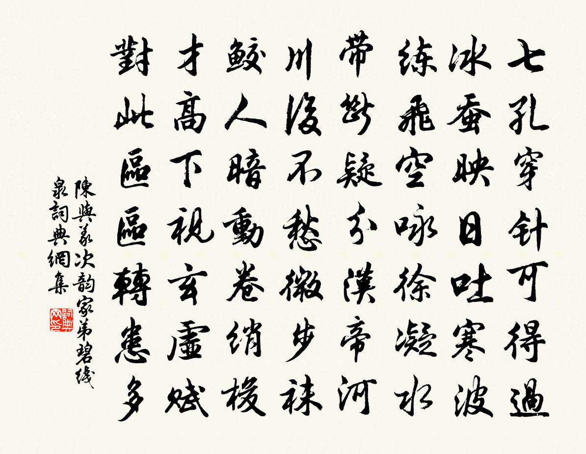 詩詞名句歷史字典書法欣賞書法字典國語詞典說文解字康熙字典古漢語字典標 題 作 者 詩 句 次韻家弟碧線泉作者:陳與義 朝代:宋代次韻家弟碧線泉原文七孔穿針可得過,冰蠶映日吐寒波。練飛空詠徐凝水,帶斷疑分漢帝河。川後不愁微步襪,鮫人暗動卷綃梭。才高下視玄虛賦,對此區區轉患多。詩詞問答問:次韻家弟碧線泉的作者是誰?答:陳與義問:次韻家弟碧線泉寫於哪個朝代?答:宋代問:陳與義的名句有哪些?答:陳與義名句大全陳與義次韻家弟碧線泉書法欣賞次韻家弟碧線泉書法作品詩詞推薦見尹公亮新詩,偶贈絕句白居易〔唐代〕袖裡新詩十首餘,吟看句句是瓊琚。如何持此將乾謁,不及公卿一字書。再和二首劉克莊〔宋代〕滎陽相昔獨當朝,曾忝弓旌第一招。無力不能救房琯,有書安敢托洪喬。如聞徒步輕千駟,未覺堂廚勝一瓢。鄧禹醉蓬萊楊無咎〔宋代〕見恩榮故里。□著賢關,特然超詣。滿腹詩書,洗膏粱餘味。羞挽烏號,換將藍綬,向廣庭親試。磊落胸襟,雍容喜遷鶯王哲〔元代〕門開悟。此去難為,雙眸回顧。得雲*,怡然穩駕,飈外樂聲堪*。他舊朋霞友,舞袖前來談吐。中素。知余唯有送竇十九叔向赴京皇甫冉〔唐代〕冰結楊柳津,從吳去入秦。徒雲還上國,誰為作中人。驛樹同霜霰,漁舟伴苦辛。相如求一謁,詞賦遠隨身。和傅侍郎至臨漳感舊十詠陳淳〔宋代〕郡圃森森幾閱春,一番太守一番新。何如今日同行樂,彩袖恭陪紫橐人。游水陸院李流謙〔宋代〕深央毒歊煩,沸鼎游群魚。金涼念何許,頗欲膏吾車。行行有佳處,舍南得精廬。方塘水冷冷,嘉樹陰疎疎。寒光南歌子陳克〔宋代〕愛日烘晴書,輕寒護曉霜。小春庭院繞天香。仙風珊珊來自、五雲鄉。庭下芝蘭秀,壺中日月長。要看發綠與瞳方興京陪祭福陵納蘭性德〔清代〕龍盤鳳翥氣佳哉,東指齋宮玉輦來。影入松楸仙仗遠,香升俎豆曉雲開。盛儀備處千官肅,神貺乘時萬馬回。豹尾滿庭芳(酬趙泉)洪适〔宋代〕春入花畦,雪迷筠塢,柳梢未肯低眉。泥深路滑,車馬往來稀。平地瓊琚盈尺,冰凍解、檐水如池。皇華喜,增添子瞻尚書惠涵星硯月石風林屏作歌以送之賦十范祖禹〔宋代〕端溪千仞涵明星,虢山木古藏陰靈。蘇公贈我此二寶,使我坐臥瞻雲屏。我觀天地間,有物皆流形。或從清空入幽子清弟赴丹陽賦古調餞之李洪〔宋代〕酌君以烏程若下之酒,贈君以魯山於蒍之聲。酒以惜在原兄弟之別,歌以見愛民父母之情。大江襟喉城鐵甕,萬旅秋日登滕王閣彭孫遹〔清代〕客路逢秋思易傷,江天煙景正蒼涼。依然極浦生秋水,終古寒潮送夕陽。高士幾回亭草綠?梅仙一去嶺雲荒。臨風貧作負恩人為何宏甫作戴復古〔宋代〕九陌塵中事,三生石上身。狂為好詩客,貧作負恩人。十載江村別,扁舟淦水濱。音書久不至,得夢往來頻。侍郎宅泛池徐凝〔唐代〕蓮子花邊回竹岸,雞頭葉上盪蘭舟。誰知洛北朱門裡,便到江南綠水游。經舊遊釋行海〔宋代〕望望東西草色新,杖藜曾逐少年身。風煙半是親題處,泉石多非舊主人。黃鳥有情頻喚侶,野花無語自傷春。閒心華胥引(黃鐘秋思)周邦彥〔宋代〕川原澄映,煙月冥濛,去舟如葉。岸足沙平,蒲根水冷留雁唼。別有孤角吟秋,對曉風鳴軋。紅日三竿,醉頭扶起漁家傲歐陽玄〔元代〕九月都城秋日亢。馬頭白露迎朝爽。曾向西山觀蒼莽。川原廣。千林紅葉同春賞。一本黃花金十鏹。富家菊譜簽銀和樓樞密過洛陽感舊二絕鄭剛中〔宋代〕十年滓穢已澄清,訪舊寧須得便行。早辟關中奉高租,重興禮樂定章程。寄逍遙子鄭玠〔宋代〕自從夫子仙山去,聞說山中分外清。半夜洞天松月白,野猿吟和讀書聲。名句推薦壯心未與年俱老,死去猶能作鬼雄。陸游《書憤五首·其二》 詩言志,歌永言佚名《尚書·虞書·舜典》 正身直行,眾邪自息。劉安及其門客《淮南子·繆稱訓》 我有一罇酒,欲以贈遠人。佚名《舊題蘇武詩 / 別詩四首·其一》 贈人以言,重於金石珠玉;觀人以言,美於黼黻、文章;聽人以言,樂於鐘鼓琴瑟。荀子《荀子·非相》 江上陰雲鎖夢魂,江邊深夜舞劉琨。譚用之《秋宿湘江遇雨》 西門秦氏女,秀色如瓊花。李白《秦女休行》 傷心秦漢,生民塗炭,讀書人一聲長嘆。張可久《賣花聲·懷古》 十年磨一劍,霜刃未曾試。賈島《劍客 / 述劍》 因思杜陵夢,鳧雁滿回塘。溫庭筠《商山早行》