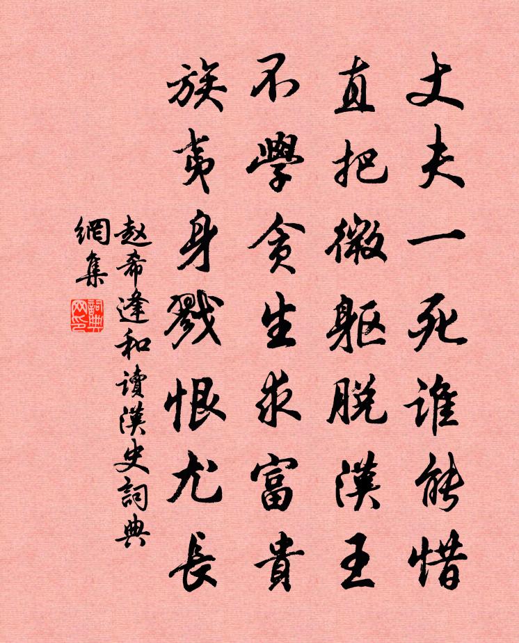 詩詞名句歷史字典書法欣賞書法字典國語詞典說文解字康熙字典古漢語字典標 題 作 者 詩 句 和讀漢史作者:趙希逢 朝代:宋代和讀漢史原文丈夫一死誰能惜,直把微軀脫漢王。不學貪生求富貴,族夷身戮恨尤長。詩詞問答問:和讀漢史的作者是誰?答:趙希逢問:和讀漢史寫於哪個朝代?答:宋代趙希逢和讀漢史書法欣賞和讀漢史書法作品詩詞推薦耕圖二十一首登場樓璹〔宋代〕禾黍已登場,稍覺農事優。黃雲滿高架,白水空西疇。用此可卒歲,願言免防秋。太平本無象,村舍炊煙浮。枕上作陸游〔宋代〕蕭蕭白髮臥扁舟,死盡中朝舊輩流。萬里關河孤枕夢,五更風雨四山秋。鄭虔自笑窮耽酒,李廣何妨老不侯。猶有楊子直秘書以一詩送小兒歸省又一絕及平園花周必大〔宋代〕栽花種竹滿平園,人道安閒似樂天。自笑鉛黃消永日,何如蠻素樂華年。入蜀赴舉秋夜與先生話別崔塗〔唐代〕欲愴峨嵋別,中宵寢不能。聽殘池上雨,吟盡枕前燈。失計方期隱,修心未到僧。雲門一萬里,應笑又擔簦。雪李石〔宋代〕大地纖毫色色空,寥天望極一鴻蒙。夜凝冷浸梅魂月,朝拂輕回縞帶風。身世密移塵境外,乾坤收入玉壺中。虛堂次韻周畏知問訊城東梅塢七首張栻〔宋代〕城東幽事如許,一見定勝百聞。苦雨斜風無柰,斷橋流水余芬。送雲上人釋普度〔宋代〕楖{左木右栗}杖頭懸日月,草鞋跟底帶山川。逢人問著吾家事,靈鷲峰前是冷泉。二月九日訪仰之聞德茂與婿鄧叔厚蚤作逍遙溪王洋〔宋代〕貪閒心不受囂塵,六十年餘自在身。愛水愛山三益友,如冰如玉兩閒人。言無拘畏詩多健,酒借豪華力有神。聞說劉禪奴彈琵琶歌(感相國韓公夢)顧況〔唐代〕樂府只傳橫吹好,琵琶寫出關山道。羈雁出塞繞黃雲,邊馬仰天嘶白草。明妃愁中漢使回,蔡琰愁處胡笳哀。鬼神即事孫應時〔宋代〕江梅玉立故清妍,心友猗蘭弟水仙。終日相看靜無語,一時風味也堪憐。峴山懷古陳子昂〔唐代〕秣馬臨荒甸。登高覽舊都。猶悲墜淚碣。尚想臥龍圖。城邑遙分楚。山川半入吳。丘陵徒自出。賢聖幾凋枯。野樹蔡郎中請贊釋宗杲〔宋代〕賦性暴,舉止傲,說甚道。有個沒意智獃郎,隨例妄想顛倒。蔡郎中還見麽,若也當面諱卻,便是監主自盜。念奴嬌·春情李清照〔宋代〕蕭條庭院,又斜風細雨,重門須閉。寵柳嬌花寒食近,種種惱人天氣。險韻詩成,扶頭酒醒,別是閒滋味。征鴻過遣興李流謙〔宋代〕小窗日影轉悠悠,卷盡殘書卻到頭。香茗半甌輕列鼎,好詩千首勝封侯。朱弦無復人三嘆,白璧空慚我屢投。酒好漸漸之石佚名〔先秦〕漸漸之石,維其高矣。山川悠遠,維其勞矣。武人東征,不遑朝矣。漸漸之石,維其卒矣。山川悠遠,曷其沒矣?示鄰曲陸游〔宋代〕北陌東阡好弟兄,耄年幸復主齊盟。同嘗春韭秋菘味,共聽朝猿夜鶴聲。百世不忘耕稼業,一壼時敘里閭情。諸孫四松杜甫〔唐代〕四松初移時,大抵三尺強。別來忽三載,離立如人長。會看根不拔,莫計枝凋傷。幽色幸秀髮,疏柯亦昂藏。所插萬事王安石〔宋代〕萬事黃粱欲熟時,世間談笑漫追隨。雞蟲得失何須算,鵬鶡逍遙各自知。答燕侍郎謝與端明李學士見過之什宋祁〔宋代〕方外仙鄉岸幅巾,三竿紅日照霜晨。當關不用驚騶唱,共是揚家載酒人。頌古釋道顏〔宋代〕舉手攀南斗,翻身倚北辰。出頭天外看,誰是我般人。名句推薦獨倚危欄,神遊無際,天地猶嫌隘。朱栴《念奴嬌·雪霽夜月中登樓望賀蘭山作》 道在不可見,用在不可知。韓非及後人《韓非子·主道》 風雨牢愁無著處,那更寒蛩四壁。文天祥《酹江月·和友驛中言別》 問渠那得清如許?為有源頭活水來。朱熹《觀書有感二首·其一》 凡百事之成也,必在敬之;其敗也,必在慢之。荀子《荀子·議兵》 停船暫借問,或恐是同鄉。崔顥《長干行·君家何處住》 願得此身長報國,何鬚生入玉門關。戴叔倫《塞上曲二首·其二》 馬上離魂衣上淚,各自個、供憔悴程垓《酷相思·月掛霜林寒欲墜》 無可奈何花落去,似曾相識燕歸來。晏殊《浣溪沙·一曲新詞酒一杯》 漸老多憂百事忙,天寒日短更心傷。李覯《秋晚悲懷》