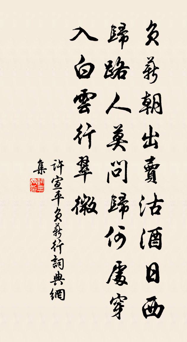 詩詞名句歷史字典書法欣賞書法字典國語詞典說文解字康熙字典古漢語字典標 題 作 者 詩 句 負薪行作者:許宣平 朝代:唐代負薪行原文負薪朝出賣,沽酒日西歸。路人莫問歸何處,穿入白雲行翠微。詩詞問答問:負薪行的作者是誰?答:許宣平問:負薪行寫於哪個朝代?答:唐代問:負薪行是什麼體裁?答:雜言許宣平負薪行書法欣賞負薪行書法作品注釋全唐詩:卷860-4詩詞推薦送相里郎中赴江西獨孤及〔唐代〕君把一尺詔,南遊濟滄浪。受恩忘險艱,不道歧路長。戎狄方構患,休牛殊未遑。三秦千倉空,戰卒如餓狼。委輸夏夜會同人劉得仁〔唐代〕沈沈清暑夕,星斗儼虛空。岸幘棲禽下,烹茶玉漏中。形骸忘已久,偃仰趣無窮。日汲泉來漱,微開密筱風。繡鸞鳳花犯·賦水仙周密〔宋代〕楚江湄,湘娥乍見,無言灑清淚。淡然春意。空獨倚東風,芳思誰寄。凌波路冷秋無際。香雲隨步起。謾記得,漢題許仙師院韋莊〔唐代〕地古多喬木,遊人到且吟。院開金鎖澀,門映綠篁深。山色不離眼,鶴聲長在琴。往來誰與熟,乳鹿住前林。造橋道者並諸化土寫求釋慧空〔宋代〕去一得三,添六成四。有口無舌,有眼無鼻。寫得十成,以何為是。掛在大目溪頭,恰似守橋土寺。十報恩 文登縣黃醮,贈道眾馬鈺〔元代〕崑崙三髻馬風歌。得遇修仙厭事多。我處無為酬本願,人求追薦苦相魔。加持助醮居環堵,救拔亡靈上大羅。滯魄春日懷詹梁蘇泂〔宋代〕陳雷箭去不遺鏃,後世人情手翻覆。我生二十少知己,更覺恩怨生骨肉。塵沙蹤跡窘吳越,波浪賓士走巴蜀。痴年送陳同父張鎡〔宋代〕事因前定漫驅馳,諳盡人間合似痴。萬卷經綸大儒業,一生忠憤上天知。長安又見垂楊老,淮甸將興故因悲。雞彘喜晴曾協〔宋代〕詩翁高興動新晴,未踏湖山句已清。領略風光初入眼,指麾泉石欲旴衡。屢傳黼扆方圖舊,應有鋒車便趣行。莫向次韻和丁學士途中偶作王禹偁〔宋代〕淮海豐登接帝畿,家家耕破舊荒陂。乳牛引犢精神健,野叟攜孫鬢髮衰。河市妓翻輕蒨袖,社筵人插小紅旗。憑誰上元二首王洋〔宋代〕火樹銀花起夜煙,驂驔朱幰競駢闐。一千戶外開金鎖,十二里中然玉蓮。何日行宮祠太一,誰從摩詰問諸天。歌台餞光祿兩張卿退居呂溱〔宋代〕江上築台遺世塵,堂上虛白見天真。丹心許國平生事,皓道還家自在身。水樹芬馨憐茝蕙,雪軒顏色愛松筠。清時楚觀歌趙汝鐩〔宋代〕吾聞楚鄉江山多勝處,今之楚觀尤得江山趣。萬象排拶索應酬,丹青閣筆無所措。大則湘水小臨蒸,眾流合派銀河題劉翔卿蔚然樓二首楊萬里〔宋代〕誠叟顛狂與醉題,艮翁珍重灑環詞。山稜莫學詩肩瘦,月寫雲描總是詩。祭侯辭先秦無名〔先秦〕嗟爾不寧侯。為爾不朝於王所。故亢而射女。強食爾食。曾孫侯氏百福。武擔東台晚望陸游〔宋代〕憔悴西窗已一翁,登高意氣尚豪雄。關河霸國興亡後,風月詩人醉醒中。病起頓驚雙鬢改,春歸一掃萬花空。欄邊將之京國贈薛員外李群玉〔唐代〕黃葉下空館,寂寥寒雨愁。平居歲華晏,絡緯啼林幽。節物凋壯志,咄嗟不能休。空懷趙鞅嘆,變化良無由。所思送張舍人從軍汪元量〔宋代〕大笑出門去,誰能筆硯囚。十年渾不調,萬里欲先侯。衰爾吾將老,飛揚子未休。他年身退遁,肯伴赤松游。謁金門(暮春)趙長卿〔宋代〕風又雨。滿地殘紅無數。花不能言鶯解語。曉來啼更苦。把酒東皋日暮。抵死留春春去。擬倩楊花尋去處。楊花無偈頌一百二十三首釋普度〔宋代〕花簇簇,錦簇簇。吟不足,詠不足。的的無弦琴上曲。名句推薦擾擾馬足車塵,被歲月無情,暗消年少。元好問《玉漏遲·詠杯》 父兮生我,母兮鞠我。佚名《蓼莪》 亂雲低薄暮,急雪舞迴風。杜甫《對雪》 溫故而知新,可以為師矣。孔子弟子《論語·為政篇》 先生名利比塵灰,綠竹青鬆手自栽。王汝舟《詠歸堂隱鱗洞》 丈夫非無淚,不灑離別間。陸龜蒙《別離》 至人天隱,其次地隱,其次名隱。王通《中說·卷四·事君篇》 軍合力不齊,躊躇而雁行。曹操《蒿里行》 雪似梅花,梅花似雪。似和不似都奇絕。呂本中《踏莎行·雪似梅花》 何意更觴昌歜酒,為君擊節一長歌。趙蕃《端午三首》
