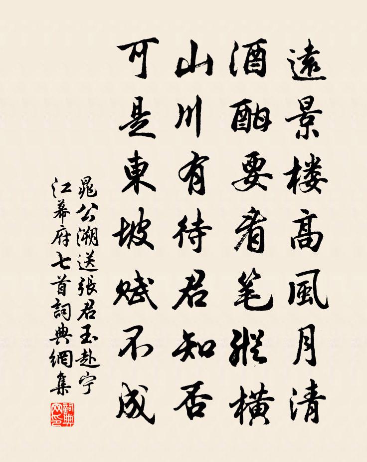 詩詞名句歷史字典書法欣賞書法字典國語詞典說文解字康熙字典古漢語字典標 題 作 者 詩 句 送張君玉赴寧江幕府七首作者:晁公溯 朝代:宋代送張君玉赴寧江幕府七首原文遠景樓高風月清,酒酣要看筆縱橫。山川有待君知否,可是東坡賦不成。詩詞問答問:送張君玉赴寧江幕府七首的作者是誰?答:晁公溯問:送張君玉赴寧江幕府七首寫於哪個朝代?答:宋代晁公溯送張君玉赴寧江幕府七首書法欣賞送張君玉赴寧江幕府七首書法作品詩詞推薦選官圖邵雍〔宋代〕虛名虛利太無端,自方□□寸進難。大抵人生只如此,采來誰不做高官。次韻三首曾幾〔宋代〕御冬無過酒,得酒政應難。可愛惟晴日,相依度歲寒。雖非挾纊坐,且作擁爐看。飢亦何堪忍,斜陽掛食單。開平汪元量〔宋代〕冷霰撒行車,呻吟獨搔首。須臾大如席,風卷半空走。母子鼻酸辛,依依自相守。書生倒行囊,沽來一樽酒。暫時憶仙姿/如夢令洪皓〔宋代〕小憩書齋胡處。閒取響泉調去。是事不關心,自得曲中深趣。無語。無語。回首暮雲飛絮。聞徹上人亡寄侍郎楊丈柳宗元〔唐代〕東越高僧還姓湯,幾時瓊佩觸鳴璫。空花一散不知處,誰採金英與侍郎。次喻景山韻陳宓〔宋代〕晨起尋閒共話難,夜深相對菊花寒。如何風雨多才思,故作扁舟上下灘。和鄧慎思詩呈同院諸公三首耿南仲〔宋代〕秋日同文館,褎然觀國光。泗濱何限磬,岱麓易求梁。劍氣頻沖斗,錐鋒定出囊。於余慚拙匠,操尺預量長。妙庭觀曾表勛〔宋代〕小溪一曲繞山綠,虎繞龍蟠記丹熟。空想雲軿佩玉鳴,夜深屋角風吹竹。和朱給事上元早雪李復〔宋代〕玉花清曉作余寒,雲暗重城晻靄間。初逐細風飛寂寂,旋隨小雨潤斑斑。萬家燈火方行樂,九陌輪蹄肯放閒。向晚鵲橋仙(七夕)謝懋〔宋代〕鉤簾借月,染云為幌,花面玉枝交映。涼生河漢一天秋,問此會、今宵孰勝。銅壺尚滴,燭龍已駕,淚浥西風不盡記牡丹事二首劉克莊〔宋代〕暴骸獨柳冤誰雪,藁葬青山過者悲。甘露殿中空誦賦,沉香亭畔更無詩。龜父國賓二周丈同游谷簾三首王阮〔宋代〕偶然得意挹珍流,二妙欣然共勝游。怪得坐間無俗語,谷簾泉水建茶甌。懷友人釋智圓〔宋代〕憶向荒原別,殘陽雪霽初。幾宵成去夢,經閏絕來書。處世慵難減,眠雲癖未除。幽懷向誰說,昨夜對蟾蜍。讀王摩詰詩愛其散發晚未簪道書行尚把之句因陸游〔宋代〕二十游名場,最號才智下。蹭蹬六十年,亦有茆一把。典衣租黃犢,乘雨耕綠野,西成得一飽,敢計泥沒踝。住久和阮亭《秋柳》詩原韻冒襄〔清代〕紅閨紫塞晝飛霜,顧影羞窺白玉塘。近日心情惟短笛,當年花絮已空箱。夢殘舞榭還歌榭,淚落岐王與薛王。回首飛鳴蘇泂〔宋代〕飛鳴一雁帶秋回,寂歷黃花傍節開。草木不逃天地役,禽魚常罹網羅災。中年衣食憂妻子,道遠舟車倦往來。未了自贊釋可湘〔宋代〕沖開碧落,攧碎斷崖。個般標緻,其誰與偕。咦。佳雪應時呈司土使君三首朱長文〔唐代〕千里江山入郡樓,憑欄乍喜密雲浮。冷光交映天峰色,余潤遙隨笠澤流。民疊褥襦看不厭,客叢簪履賞應留。野人次韻謝子高讀淵明傳黃庭堅〔宋代〕枯木嵌空微暗淡,古器雖在無古弦。袖中正有南風手,誰為聽之誰為傳。風流豈落正始後,甲子不數義熙前。一軒贈張均員外盧象〔唐代〕公門世緒昌,才子冠裴王。出自平津邸,還為吏部郎。神仙餘氣色,列宿動輝光。夜直南宮靜,朝趨北禁長。時人名句推薦君子愛財,取之有道。佚名《增廣賢文·上集》 以其行理也。行理性於染當。墨子《墨子·03章 所染》 黃雞白酒,君去村社一番秋。辛棄疾《水調歌頭·送楊民瞻》 勝敗兵家事不期,包羞忍恥是男兒。杜牧《題烏江亭》 風雨替花愁。風雨罷,花也應休。趙秉文《青杏兒·風雨替花愁》 為有書來與我期,便從蘭杜惹相思。莊棫《定風波·為有書來與我期》 君思潁水綠,忽復歸嵩岑。李白《送裴十八圖南歸嵩山二首》 千步虹橋,參差雁齒,直趨水殿。柳永《破陣樂·露花倒影》 宴爾新婚,以我御窮。佚名《谷風》 為其所難者,必得其所欲焉;未聞為其所欲,而免其所惡者也。墨子《墨子·01章 親士》
