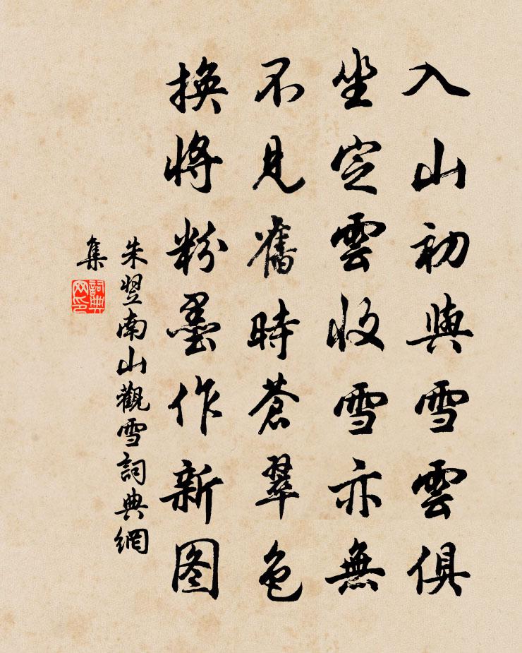 詩詞名句歷史字典書法欣賞書法字典國語詞典說文解字康熙字典古漢語字典標 題 作 者 詩 句 南山觀雪作者:朱翌 朝代:宋代南山觀雪原文入山初與雪雲俱,坐定雲收雪亦無。不見舊時蒼翠色,換將粉墨作新圖。詩詞問答問:南山觀雪的作者是誰?答:朱翌問:南山觀雪寫於哪個朝代?答:宋代朱翌南山觀雪書法欣賞南山觀雪書法作品詩詞推薦道間苦熱李曾伯〔宋代〕火傘漾中漾,炎風撼葉舟。熱幾堪炙手,矮莫可抬頭。晝困杯為卻,宵蚊扇不休。清涼一榻地,得此足優遊。秋蝶二首羅鄴〔唐代〕秦樓花發時,秦女笑相隨。及到秋風日,飛來欲問誰。似厭棲寒菊,翩翩占晚陽。愁人如見此,應下淚千行。梁寺汪遵〔唐代〕立國從來為戰功,一朝何事卻談空。台城兵匝無人敵,閒臥高僧滿梵宮。頌古四十五首釋慧遠〔宋代〕家常侍客勸三杯,鴆酒不消吃一盞。當時裂破夜叉頭,頂門突出醯羅眼。武康主簿吳輓詩魏了翁〔宋代〕羯末夸群從,凝徽肖一之。風花搖切夢,梅雪照詩脾。日短烏聲急,天寒雁影悲。廣輪高隱地,千古一漣洏。離相院暫憩丘葵〔宋代〕一別已五載,重來得舊朋。秋風多改葉,童行半為僧。暫憩亦云好,長游愧未能。前山久相識,為我碧崚嶒。蘄春聽琵琶五首孔武仲〔宋代〕銀燭交光桂釀清,親朋相見苦多情。春宵萬籟俱澄絕,初試鵾弦驟雨聲。偈頌七十六首釋子益〔宋代〕春已過半,百花競芳。有些佛法,如何商量。千言萬語無人會,又逐流鶯過短牆。過台城感舊沈青箱〔唐代〕六代舊山川,興亡幾百年。繁華今寂寞,朝市昔喧闐。夜月琉璃水,春風卵色天。傷時與懷古,垂淚國門前。赴桐廬郡淮上遇風三首范仲淹〔宋代〕聖宋非強楚,清淮異汨羅。平生仗忠信,盡室任風波。舟楫顛危甚,蛟黿出沒多。斜陽幸無事,沽酒聽漁歌。浣溪沙趙汝茪〔宋代〕笑摘青梅傍綺疏。數枝花影漾前除。太湖石畔看金魚。筍指曉寒慵出袖,翠鬟春懶不成梳。為君縫狹繡羅襦。紅蕉徐凝〔唐代〕紅蕉曾到嶺南看,校小芭蕉幾一般。差是斜刀剪紅絹,捲來開去葉中安。首尾吟邵雍〔宋代〕堯夫非是愛吟詩,詩是堯夫信腳時。高祖宅前花似錦,魏王堤畔柳如絲。因閒看水行來遠,就便遊園歸去遲。每遇登郡寄京師諸季、淮南子弟韋應物〔唐代〕始罷永陽守,復臥潯陽樓。懸檻飄寒雨,危堞侵江流。迨茲聞雁夜,重憶別離秋。徒有盈樽酒,鎮此百端憂。至家利登〔宋代〕明時射策難為合,塵世求名本是浮。整頓書籤還夜課,增添酒翁與寒謀。羞逢山友長低面,悔把漁竽不到頭。盡日蕈子楊萬里〔宋代〕空山一雨山溜急,漂流桂子松花汁。土膏松暖都滲入,蒸出蕈花團戢戢。戴穿落葉忽起立,撥開落葉百數十。蠟面始平公以光得免使北以詩謹依韻酬和司馬光〔宋代〕皇華將命得入難,專對非才輒自言。倖免驅車涉沙漠,尚容載筆待宣溫。不惟羞屈穹廬膝,無奈常游魏闕魂。袞職偈五首釋道行〔宋代〕雲籠岳頂,百鳥無聲。月隱寒潭,龍珠自耀。直得石樑忽然大悟,石洞頓爾心休。虛空開口作證,溪北石僧點頭。江神子(金山會飲)韓元吉〔宋代〕金銀樓閣認蓬萊。曉煙開。上崔嵬。風引孤帆,誰道卻船回。鵬翼倚天鰲背穩,驚浪起,雪成堆。翩翩黃鶴為誰來自嘲陸游〔宋代〕華子中年百事忘,嵇生仍坐嬾為妨。病於榮宦冥心久,老向端閒得味長。對客欲談還憒憒,讀書才過已茫茫。青縑名句推薦夫知人之性,莫難察焉。諸葛亮《將苑·卷一·知人性》 料黛眉重鎖隋堤,芳心還動梁苑。盧祖皋《宴清都·初春》 一朵芙蕖,開過尚盈盈。蘇軾《江神子·江景》 今朝此為別,何處還相遇。韋應物《初發揚子寄元大校書》 金槳木蘭船,戲采江南蓮。劉孝威《採蓮曲·金槳木蘭船》 機關算盡太聰明,反算了卿卿性命。曹雪芹《紅樓夢·第五回》 折花逢驛使,寄與隴頭人。陸凱《贈范曄詩》 大鵬飛兮振八裔,中天摧兮力不濟。李白《臨路歌》 露從今夜白,月是故鄉明。杜甫《月夜憶舍弟》 晚雲都變露,新月初學扇,塞鴻一字來如線。周德清《塞鴻秋·潯陽即景》