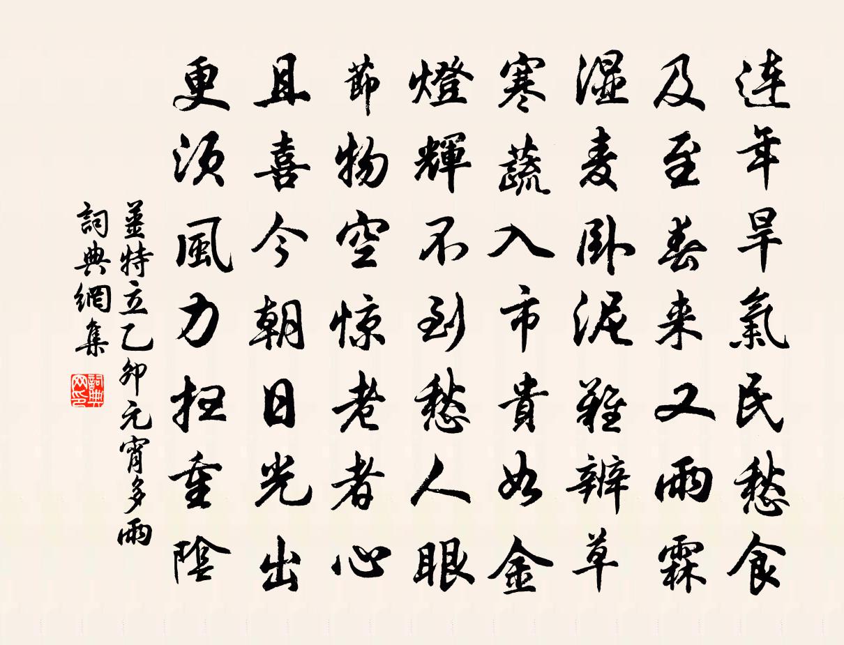 詩詞名句歷史字典書法欣賞書法字典國語詞典說文解字康熙字典古漢語字典標 題 作 者 詩 句 乙卯元宵多雨作者:姜特立 朝代:宋代乙卯元宵多雨原文連年旱氣民愁食,及至春來又雨霖。濕麥臥泥難辨草,寒蔬入市貴如金。燈輝不到愁人眼,節物空驚老者心。且喜今朝日光出,更須風力掃重陰。詩詞問答問:乙卯元宵多雨的作者是誰?答:姜特立問:乙卯元宵多雨寫於哪個朝代?答:宋代姜特立乙卯元宵多雨書法欣賞乙卯元宵多雨書法作品詩詞推薦詠梅五十首呈史尚書釋紹嵩〔宋代〕洛陽三十六峰西,曾為梅花醉似泥。今日偶題題似著,屋檐斜入一枝低。題友人《聽雨舟》馮班〔清代〕篷窗偏稱掛魚蓑,荻葉聲中愛雨過。莫道陸居原是屋,如今平地有風波。資聖庵陳岩〔宋代〕朝暮相依五老仙,鳥啼花落幾何年。塵勞不到山深處,窗外日高人尚眠。張氏靜居院王安石〔宋代〕動者利進為,靜者樂止居。物性有偏得,惟賢時卷舒。張侯始出仕,所至多名譽。老矣歸偃休,買地斸荒蕪。屋成秋興寇準〔宋代〕窮秋九月西風高,疏林木落聲蕭騷。出門長望無所適,唯見空江生暮濤。履道西門二首白居易〔唐代〕履道西門有弊居,池塘竹樹繞君廬。豪華肥壯雖無分,飽暖安閒即有餘。行灶朝香炊早飯,小園春暖掇新蔬。夷齊水調歌頭(喜歸)劉克莊〔宋代〕遣作嶺頭使,似戍玉門關。來時送者,舉酒珍重祝身安。街畔小兒拍笑,馬上是翁矍鑠,頭與璧俱還。何處得仙訣瑞金東明觀蘇軾〔宋代〕浮金最好溪南景,古木樓台畫不成。天籟遠兼流水韻,雲璈常聽步虛聲。青鸞白鶴蟠空下,翠草玄芝匝地生。咫尺贈賈島張籍〔唐代〕籬落荒涼僮僕飢,樂遊原上住多時。蹇驢放飽騎將出,秋卷裝成寄與誰。拄杖傍田尋野菜,封書乞米趁時炊。姓名古陵橋徐璣〔宋代〕西橋西岸柳成絲,春去春來歲歲同。偶被東風吹落絮,又隨流水過橋東。送糟蟹遺制幕李曾伯〔宋代〕江鄉霜後飽珍餚,萬里持來僅帶糟。雖惜橫戈酣白蟻,尚知解甲護紅膏。開樽祗覺牽歸興,作賦猶當繼老饕。油幕贈程山人方回〔宋代〕青囊遺論究幾深,屋宅為陽墓宅陰。元出易中後天卦,更憑心上指南針。故知形勝從來有,難必榮華此處尋。周洛夜讀翁逢龍〔宋代〕官事歸來夜雪埋,兒曹燈火小茅齋。人家不必問貧富,但有讀書聲便佳。王復秀才所居雙檜二首蘇軾〔宋代〕凜然相對敢相欺,直乾凌空未要奇。根到九泉無曲處,世間惟有蟄龍知。江上對酒作陸游〔宋代〕把酒不能飲,苦淚滴酒觴,醉酒蜀江中,和淚下荊揚。樓櫓壓湓口,山川蟠武昌。石頭與鍾阜,南望郁蒼蒼。戈船贈夷中師釋智圓〔宋代〕澹泊背時態,悠然塵外心。靜吟霜月盡,歸夢海雲深。室冷苔生榻,窗閒鳥覷琴。幽棲共得趣,乘興幾相尋。句王欽若〔宋代〕九重天闕夢掉臂,黃雞白酒鄰舍恩。登城歌張鎡〔宋代〕二月二十八,花開滿林鶯恰恰。春光誰遣插翅飛,雪 * 知添鬢髮。暄風隨我登古城,遠樹如簇山如縈。一川渺瀰秋波媚/眼兒媚陸游〔宋代〕曾散天花蕊珠宮。一念墮塵中。鉛華洗盡,珠璣不御,道骨仙風。東遊我醉騎鯨去,君駕素鸞從。垂虹看月,天台夕宴房主簿舍張說〔唐代〕歲晏關雍空,風急河渭冰。薄游羈物役,微尚愜遠憑。旅館月宿永,閉扃雲思興。伊人美修夜,朋酒惠來稱。交談名句推薦瑕不掩瑜、瑜不掩瑕戴聖《禮記·聘義》 中年親友難別,絲竹緩離愁。蘇軾《水調歌頭·安石在東海》 國家將興,必有禎祥;國家將亡,必有妖孽。子思《中庸·第二十四章》 憐君片雲思,一棹去瀟湘。杜牧《送薛種游湖南》 九月九日望鄉台,他席他鄉送客杯。王勃《蜀中九日 / 九日登高》 何似當筵虎士,揮手弦聲響處,雙雁落遙空。葉夢得《水調歌頭·九月望日與客習射西園余偶病不能射》 兵者兇器,將者危任,是以器剛則缺,任重則危。諸葛亮《將苑·卷一·將志》 名無細而不聞,行無隱而不彰。劉向《列女傳·節義傳·周主忠妾》 水流濕,火就燥。雲從龍,風從虎。佚名《易傳·文言傳·乾文言》 遊人不管春將老,來往亭前踏落花。歐陽修《豐樂亭遊春·其三》