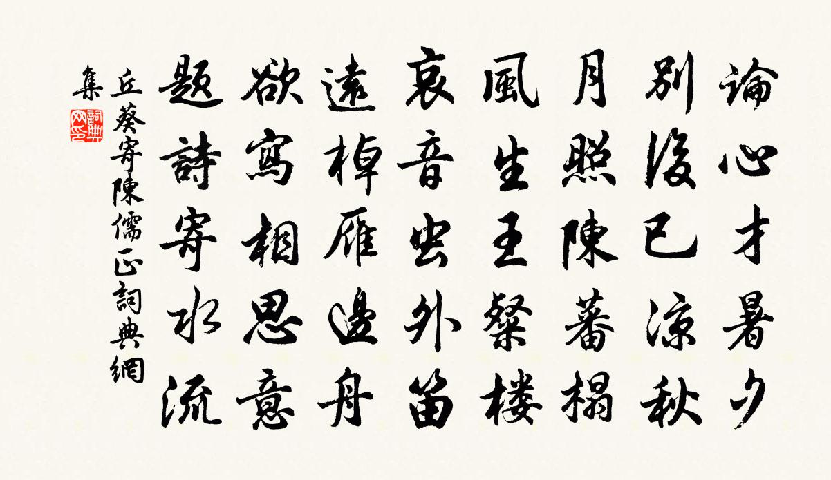 詩詞名句歷史字典書法欣賞書法字典國語詞典說文解字康熙字典古漢語字典標 題 作 者 詩 句 寄陳儒正作者:丘葵 朝代:宋代寄陳儒正原文論心才暑夕,別後已涼秋。月照陳蕃榻,風生王粲樓。哀音蟲外笛,遠棹雁邊舟。欲寫相思意,題詩寄水流。詩詞問答問:寄陳儒正的作者是誰?答:丘葵問:寄陳儒正寫於哪個朝代?答:宋代丘葵寄陳儒正書法欣賞寄陳儒正書法作品詩詞推薦【雙調】落梅風_天寶補遺姮張可久〔元代〕天寶補遺姮娥面,天寶年,鬧漁陽鼓聲一片。馬嵬坡襪兒得了看錢,太真妃死而無怨。西湖湖光靜,山影孤,載斜紅雲閣楊蟠〔宋代〕重重風日透,花氣滿地塘。誰把紅雲此,紅雲無此香。西歸七首次韻和泗州十五叔父一晁補之〔宋代〕潔腹不受污,昔人因食薇薇亦周土生,悲哉懷永飢武王與周公,聖德天動威奈此二子何,猶嘆安適歸客思陸游〔宋代〕裘馬平生喜遠遊,暮年憔悴向南州。文書與睡中分日,衰病和愁總怕秋。無復雪郊看射虎,但思煙浦聽呼牛。還家送孟六歸襄陽(一作張子容詩)王維〔唐代〕杜門不復出,久與世情疏。以此為良策,勸君歸舊廬。醉歌田舍酒,笑讀古人書。好是一生事,無勞獻子虛。春日雜題陸游〔宋代〕野水如棋枰,所至各成村。炊煙出茆屋,碓聲隔柴門。樹陰同戲兒,多已長子孫。安居無暴歛,何以報國恩?寄鄭良佐陳造〔宋代〕書生著書貪日課,文士賣文救窮餓。青樓歌酒屬富兒,不意此名君乃荷。風波平地自誰始,一但從知百人和。東魯和襲美木蘭後池三詠浮萍陸龜蒙〔唐代〕晚來風約半池明,重疊侵沙綠罽成。不用臨池更相笑,最無根蒂是浮名。亮禪人持缽求頌釋正覺〔宋代〕家林一錫飛,炊處青煙微。嚴默起禪板,虛通轉化機。溪寒秋染色,月冷夜流輝。莫學西山亮,此行宜早歸。偈頌五十一首釋道沖〔宋代〕一徑直,二周遮。遼天射飛鶚,平地摝魚蝦。堪笑秘魔岩不會,見人一味只警叉。續鄭郊吟佚名〔唐代〕冢上兩竿竹,風吹常裊裊。 ——鄭郊下有長乾寺同劉宮苑浴張舜民〔宋代〕未知何處是吾廬,南北悠悠意所如。不愛渭川千畝竹,與君江上卜新居。山中夜坐寄故里友生李鹹用〔唐代〕展轉檐前睡不成,一床山月竹風清。蟲聲促促催鄉夢,桂影高高掛旅情。禍福既能知倚伏,行藏爭不要分明。可憐東綠翁叔祖得園池之勝於萬山深處將拔宅而居徐瑞〔宋代〕兩僮自足負琴書,載具何勞遠借車。客至未妨投轄飲,地荒正好帶經鉏。欲從隱者歸盤谷,尚念先人有敝廬,擇勝廣陵寒食夜李中〔唐代〕廣陵寒食夜,豪貴足佳期。紫陌人歸後,紅樓月上時。綺羅香未歇,絲竹韻猶遲。明日踏青興,輸他輕薄兒。明堂觀禮雜詠十三首車駕回太廟王同祖〔宋代〕瑞靄祥雲傍曉開,九重法駕太宮回。一聲靜蹕千官肅,衛士傳呼御座來。早春宋祁〔宋代〕鵾雪鎖平苑,烏風裊迥竿。暖容侵柳動,寒意向梅殘。雲薄來無定,天晴望更寬。杯霞莫辭醉,朝野日多歡。重疊金(除日立春)黃升〔宋代〕銀幡彩勝參差剪。東風吹上釵頭燕。一笑繞花身。小桃先報春。新春今日是。明日新年至。擘繭莫探官。人間行路賀新郎(月夜)游次公〔宋代〕斗柄回秋律。素蟾飛、冰霜萬里,滿川金碧。得月偏多何處是,惟有橋南第一。正野迥、西風寒寂。丹桂婆娑疏影好事近·七月十三日夜登萬花川谷望月作楊萬里〔宋代〕月未到誠齋,先到萬花川谷。不是誠齋無月,隔一林修竹。如今才是十三夜,月色已如玉。未是秋光奇絕,看十五名句推薦崑山玉碎鳳凰叫,芙蓉泣露香蘭笑。李賀《李憑箜篌引》 曲終漏盡嚴具陳,月沒星稀天下旦。佚名《雞鳴歌》 勿以身貴而賤人,勿以獨見而違眾。姜子牙《六韜·龍韜·立將》 高處鶯啼低蝶舞。何況日長,燕子能言語。劉鉉《蝶戀花·送春》 漢甲連胡兵,沙塵暗雲海。李白《經亂離後天恩流夜郎憶舊遊書懷贈江夏韋太守良宰》 蟬噪林逾靜,鳥鳴山更幽。王籍《入若耶溪》 天地有正氣,雜然賦流形。文天祥《正氣歌》 離心何以贈,自有玉壺冰。駱賓王《送別》 情共天涯秋黯,朱橋鎖深巷。吳文英《解蹀躞·醉雲又兼醒雨》 安詳是處事第一法,謙退是保身第一法,涵容是處人第一法,灑脫是養心第一法。陳繼儒《小窗幽記·集醒篇》