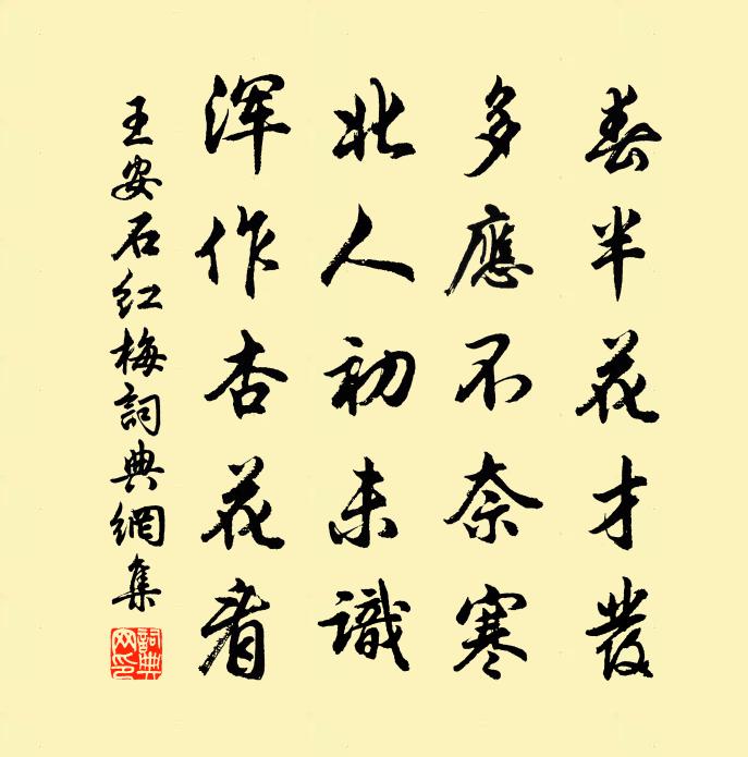 詩詞名句歷史字典書法欣賞書法字典國語詞典說文解字康熙字典古漢語字典標 題 作 者 詩 句 紅梅作者:王安石 朝代:宋代紅梅原文春半花才發,多應不奈寒。北人初未識,渾作杏花看。詩詞問答問:紅梅的作者是誰?答:王安石問:紅梅寫於哪個朝代?答:宋代問:王安石的名句有哪些?答:王安石名句大全王安石紅梅書法欣賞紅梅書法作品詩詞推薦因事晁說之〔宋代〕風雨連宵疾病增,幽憂到此果何勝。弟兄分散兩三處,圖史尋求萬一能。魯酒齊歌元不惡,吳酸楚酪乍須稱。東皇村樂黃敏求〔宋代〕刈盡稻雲蕎再雪,搗空粒玉粟仍金。已償一飽知無欠,圍坐青燈語夜深。偶題陳宓〔宋代〕向長不願富,折像患不貧。奇禍伏所慕,藏身有餘珍。向來東陵侯,豈似種瓜人。茫茫宇宙間,不得自由身。潘夫人挽章姜特立〔宋代〕登堂曾拜太夫人,秀偉端方迥不群。為子求官因白屋,有孫擢第自青雲。身兼富壽人應少,眼見為玄世罕聞。已被野狐泉羅隱〔唐代〕潏潏寒光濺路塵,相傳妖物此潛身。又應改換皮毛後,何處人間作好人。寄張功父楊萬里〔宋代〕問訊子張子,詩狂除未除。年時一健步,寄我數行書。舊矣喔招隱,誰歟誦子虛。江湖隔京洛,不是愛相疏。叔父生日項安世〔宋代〕黃塵赤日萬家團,中有金莖露一盤。酒氣薰天心獨醒,市聲搖屋鼻方鼾。長生只用仁為藥,至樂惟將靜作歡。嘉慶仁宗皇帝輓詞七首蔡襄〔宋代〕攢宮開七月,隧路閉千秋。地帶三川拆,天含萬國愁。鳥雲知聖沒,龍駕想神遊。厚祿將無報,慚恩更白頭。蝶戀花(柳)楊 * 〔宋代〕臘盡江南梅發後。萬點黃金,嬌眼初窺牖。曾見渭城人勸酒。嫩條輕拂傳杯手。料峭東風寒欲透。暗點輕煙,便覺次韻王仲行尚書宿直兩絕句周必大〔宋代〕紫禁同依日月輝,蒼顏獨愧羽毛奇。水如明鏡雖堪俯,笑汝星星誰肯嬉。琵琶行戴復古〔宋代〕潯陽江頭秋月明,黃蘆葉底秋風聲。銀龍行酒送歸客,丈夫不為兒女情。隔船琵琶自愁思,何預江州司馬事。為渠訣別偈湯道亨〔宋代〕八十一年饒舌,終日化緣不歇。重陽時節歸家,一路清風明月。浣溪沙(同昌甫飲南池)韓淲〔宋代〕屋上青山列晚雲。水邊紅袂映斜曛。柳陰荷氣簟湘紋。酒以歌長誰樂事,詩成杯灩我離群。香消涼意有南薰。和閻運使以詩見獎吏隱宜春郡詩祖無擇〔宋代〕狂吟何足話風騷,和寡甘降郢唱高。敢望與言同子夏,競推多可似山濤。九成豈後虞韶美,一字終虛魯史褒。自笑以青飠迅飯分送襲美魯望因成一絕張賁〔唐代〕誰屑瓊瑤事青飠迅,舊傳名品出華陽。應宜仙子胡麻拌,因送劉郎與阮郎。和漁具十絕牟巘五〔宋代〕買得五瀉舟,江硝落我手。呼兒下笥去,此事渠能了。呈謝資深縣丞源趙蕃〔宋代〕平生夢寐臨川郡,故在溪堂竹友齋。句法已看行世集,風聲猶得起人懷。有孫住著園依水,薄宦舊來松儼槐。縱是句暨氏女〔宋代〕多情樵牧頻簪髻,無主蜂鶯任宿房。酬綿州於中丞使君見寄許渾〔唐代〕故人書信越褒斜,新意雖多舊約賒。皆就一麾先去國,共謀三徑未還家,荊巫夜隔巴西月,鄢郢春連漢上花。半月邢君才舊宅三怪詩破笛〔唐代〕當時得意氣填心,一曲君前直萬金。今日不如庭下竹,風來猶得學龍吟。名句推薦二十四橋仍在,波心蕩、冷月無聲。姜夔《揚州慢·淮左名都》 言則稱於湯文,行則譬於狗豨。墨子《墨子·46章 耕柱》 筆落驚風雨,詩成泣鬼神杜甫《寄李十二白二十韻》 戍鼓斷人行,邊秋一雁聲。杜甫《月夜憶舍弟》 位卑未敢忘憂國,事定猶須待闔棺。陸游《病起書懷》 倚杖柴門外,臨風聽暮蟬。王維《輞川閒居贈裴秀才迪》 想翠竹、碧梧風采,舊遊何處。張寧《滿江紅·題碧梧翠竹送李陽春》 北風夜卷赤亭口,一夜天山雪更厚。岑參《天山雪歌送蕭治歸京》 使能,國之利也。左丘明《左傳·文公·文公六年》 讀書無論資性高低,但能勤學好問,凡事思一個所以然,自有義理貫通之日王永彬《圍爐夜話·第十七則》