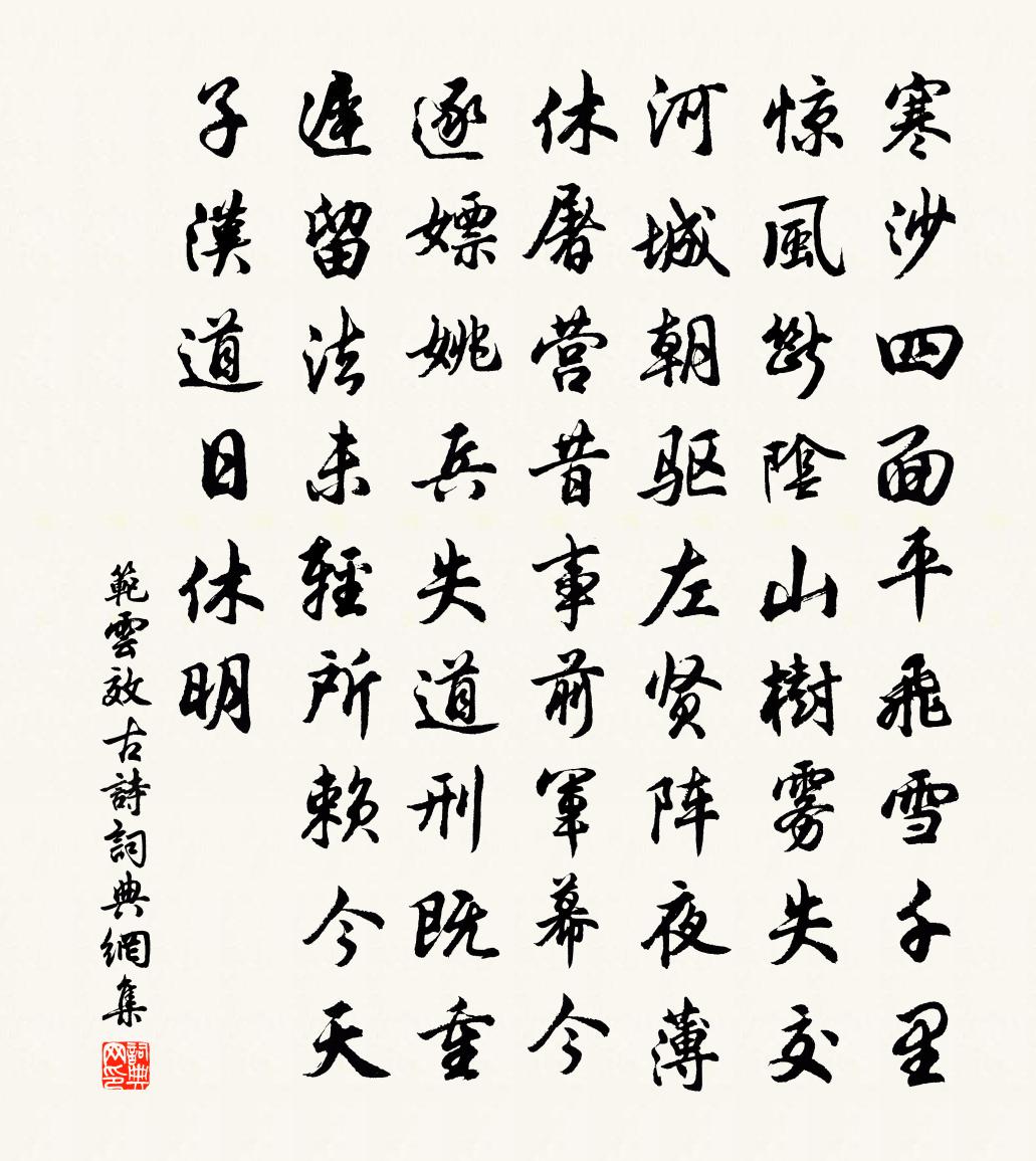 “效古詩”名為“效古”,詩中其實總有詩人自己的身影在。范雲身為齊梁詩人,寫的雖為漢代古事,但因為用了第一人稱,在時序上又故意倒“古”為“今”(“今逐”、“今天子”),便在詩中造成了一種古今錯綜、彼我交融的奇特效果。出現在詩中的主人公,看似漢代士卒,卻又融入了詩人的感情。恍惚之中,似乎不是詩人回到了漢代,倒似當年的李廣、霍去病,穿過六百年的時空,奇蹟般地出現在南朝,正率領著詩人,仰對瀚漠的朔雪、狂風,轉戰於陰山、交河。而讀者呢,也恍惚與詩人一起,參加了“朝驅左賢陣,夜薄休屠營”的戰役,為勝利的突圍而歡呼,為“失道”名將的隕身而墮淚。這是一種錯覺,但它的奇特效果,正是由范雲這首《效古詩》的獨特表現方式所造成的。