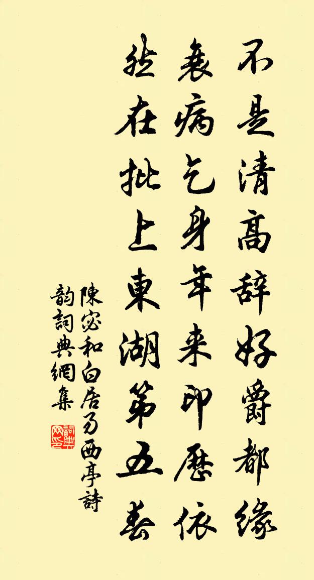 詩詞名句歷史字典書法欣賞書法字典國語詞典說文解字康熙字典古漢語字典標 題 作 者 詩 句 和白居易西亭詩韻作者:陳宓 朝代:宋代和白居易西亭詩韻原文不是清高辭好爵,都緣衰病乞身。年來印歷依然在,批上東湖第五春。詩詞問答問:和白居易西亭詩韻的作者是誰?答:陳宓問:和白居易西亭詩韻寫於哪個朝代?答:宋代陳宓和白居易西亭詩韻書法欣賞和白居易西亭詩韻書法作品詩詞推薦上丞相壽戴栩〔宋代〕赤墀黃閣自從容,人詠元和第一功。萬象曉歸仁壽鏡,旌旗初下玉關東。郴江百詠並序東山寺阮閱〔宋代〕竹外長橋過水西,林中鐘磬舊禪扉。筇迎殘月僧包去,帆背斜陽客艇歸。菩薩蠻·南園滿地堆輕絮溫庭筠〔唐代〕南園滿地堆輕絮,愁聞一霎清明雨。雨後卻斜陽,杏花零落香。無言勻睡臉,枕上屏山掩。時節慾黃昏,無□獨倚次韻趙帥四首陳造〔宋代〕舟子喧呼解纜忙,駝裘答颯冷禁霜。行分槁項新岐路,心屬毛錐舊戰場。談笑慣陪北海酒,馥膏擬炷後山香。詩筒家釀新熟每嘗輒醉妻侄等勸令少飲因成長句以白居易〔唐代〕君應怪我朝朝飲,不說向君君不知。身上幸無疼痛處,瓮頭正是撇嘗時。劉妻勸諫夫休醉,王侄分疏叔不痴。六十出都來陳,所乘船上有題小詩八首,不知何人蘇軾〔宋代〕潁水非漢水,亦作蒲萄綠。恨無襄陽兒,令唱銅鞮曲。過羊腸嶺華岳〔宋代〕拂面東風吹夕陽,路蟠千折過羊腸。山疑隨馬回回見,花欲撩人故故香。世路與誰分曲直,人情於我自炎涼。何當瓜洲驛奉餞張侍御公拜膳部郎中卻復憲台充賀…淮南幕府劉長卿〔唐代〕太華高標峻,青陽淑氣盤。屬辭傾渤澥,稱價掩琅玕。楊葉頻推中,芸香早拜官。後來慚轍跡,先達仰門闌。佐劇書河上亭壁寇準〔宋代〕岸闊檣稀波渺茫,獨憑危檻思何長。蕭蕭遠樹疏林外,一半秋山帶夕陽。失調名仲殊〔宋代〕椒觴獻壽瑤觴滿。采幡兒、輕輕剪。讀杜詩文天祥〔宋代〕平生蹤跡只奔波,偏是文章被折磨。耳想杜鵑心事苦,眼看胡馬淚痕多。千年夔峽有詩在,一夜耒江如酒何,黃土大雪登越州城樓劉過〔宋代〕北風吹雪天盡頭,蘇州未了來越州。越人夜乘剡溪舟,烏喙還念棲山不。吳人哉酒登虎丘,窈窕萬舞雜沮謳。迤儷上知府大同王太尉六首魏野〔宋代〕子細曾看九老圖,科名官職盡難如。更思呂望同君歲,猶自磻溪坐釣魚。菩薩蠻盧祖皋〔宋代〕燭房花幌參差見。疏簾鎮日縈愁眼。巫峽小山屏。夢雲猶未成。帶霜邊雁落。雙字宮羅薄。二十四闌乾。夜來相對金縷曲·姜西溟言別賦此贈之納蘭性德〔清代〕誰復留君住。嘆人生、幾翻離合,便成遲暮。最憶西窗同剪燭,卻話家山夜雨。不道只、暫時相聚。袞袞長江蕭蕭朝中措 張允濟子滿啐蒲道源〔元代〕熊罷佳兆應神簽。何必夢中占。看取隆顱犀角,不愁長守齊鹽。今朝滿*,諸般排比,筆墨先拈。休道添丁無用,惜竹孔武仲〔宋代〕老蘚牆陰夕照間,何人折我翠琅玕。即茲綠葉隨塵化,猶有低枝帶露殘。不放雲梢侵霰雪,因嗟世故足波瀾。故園和沈次韓歷陽歸來見寄王之道〔宋代〕臘近梅爭白,冬溫柳漸黃。強吟詩思澀,幽步野情步。別去嗟何闊,歸來肯遽忘。開緘得佳句,和氣溢寒鄉。貢舉人謁先師聞雅樂呂炅〔唐代〕禮聖來群彥,觀光在此時。聞歌音乍遠,合樂和還遲。調朗能諧竹,聲微又契絲。輕泠流簨簴,繚繞動纓緌。九變夜思陸游〔宋代〕露泣啼螿草,潮聲宿雁汀。經年寄孤舫,終夜托丘亭。楚澤無窮白,巴山何處青?四方男子事,不敢恨飄零。名句推薦一味學吃虧,是處事良方。王永彬《圍爐夜話·第五四則》 山中一夜雨,樹杪百重泉。王維《送梓州李使君》 千呼萬喚始出來,猶抱琵琶半遮面。白居易《琵琶行 / 琵琶引》 垂下簾櫳。雙燕歸來細雨中。歐陽修《採桑子·群芳過後西湖好》 影孤憐夜永。永夜憐孤影。蘇軾《菩薩蠻·回文秋閨怨》 才有淺深,無有古今;文有偽真,無有故新。王充《論衡·卷二十九·案書篇》 瑤池阿母綺窗開,黃竹歌聲動地哀李商隱《瑤池》 日下壁而沉彩,月上軒而飛光。江淹《別賦》 浮生只合尊前老。雪滿長安道。舒亶《虞美人·寄公度》 只在此山中,雲深不知處。賈島《尋隱者不遇 / 孫革訪羊尊師詩》
