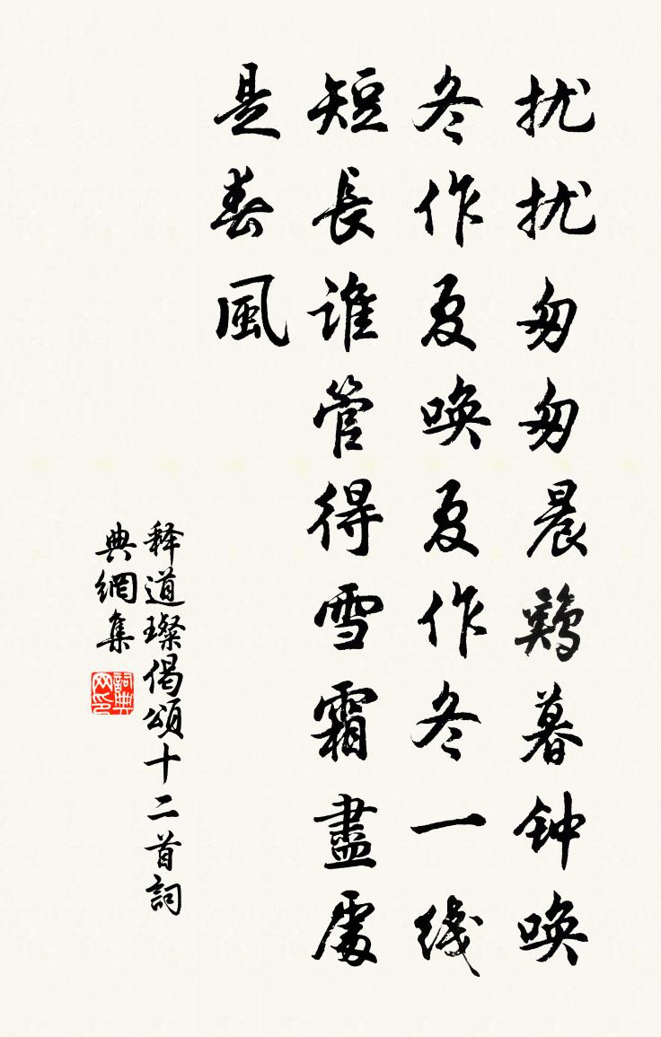 詩詞名句歷史字典書法欣賞書法字典國語詞典說文解字康熙字典古漢語字典標 題 作 者 詩 句 偈頌十二首作者:釋道璨 朝代:宋代偈頌十二首原文擾擾匆匆,晨雞暮鍾。喚冬作夏,喚夏作冬。一線短長誰管得,雪霜盡處是春風。詩詞問答問:偈頌十二首的作者是誰?答:釋道璨問:偈頌十二首寫於哪個朝代?答:宋代釋道璨偈頌十二首書法欣賞偈頌十二首書法作品詩詞推薦題趙希賢所藏墨竹仇遠〔宋代〕謝家庭下玉,化此青琅玕。風標夐不俗,誰謂骨相寒。和張亨泉宴鹿鳴吳泳〔宋代〕平生湖海獨元龍,門作丹梯倚太空。還我蛾眉千頃月,借渠羊角一帆風。文隨腳跡機難活,學到源頭理自通。何代【雙調】賣花聲_雪兒嬌小歌徐再思〔元代〕雪兒嬌小歌《金縷》,老子婆娑倒玉壺,滿身花影倩人扶。昨宵不記,雕鞍歸去,問今朝酒醒何處? 碧桃紅杏歸義寺題震上人壁(寺即神堯皇帝讀書之所)錢起〔唐代〕入谷逢雨花,香綠引幽步。招提饒泉石,萬轉同一趣。向背森碧峰,淺深羅古樹。堯皇未登極,此地曾隱霧。秘讖安分歌白玉蟾〔宋代〕神仙底事君知否,君若知兮求不苟。先且回頭自揣量,須量瞞心方開口。神仙有術非不傳,也要儂家有夙緣。若也六日早途中見耕者趙蕃〔宋代〕夜雨未收腳,宿耕初起頭。聊茲一日力,慰此半年愁。長路厭策蹇,還家思借牛。未須論旨蓄,端爾待來牟。歸雲壁上人遊方歸薛嵎〔宋代〕亦是無心出,不如歸意閒。一身隨鐵錫,十載住金山。定石沾花雨,清廟帶病顏。常雲迷覺路,只在片言間。幽處釋文珦〔宋代〕惡圓難與俗浮沉,野處窮居歲月深。青嶂於予偏有分,白雲嫌道太無心。人間富貴皆塵物,世外風泉是好音。老去留山間種藝十絕劉克莊〔宋代〕春風滿面喜津津,縱有嗔拳不忍嗔。尚恐傍觀安註腳,笑他何事與何人。浣溪沙(次韻杜唐佐秋懷)侯置〔宋代〕春夢驚回謝氏塘。篋中消盡舊家香。休文多病怯秋光。空對金盤承瑞露,竟無玉杵碎玄霜。醉魂飛度月宮涼。叔父惠鉢三首陳師道〔宋代〕聲中得句已忘言,斷酒持齋郤自然。大有西來真的意,飢時著飯飽時懸。雨中晁說之〔宋代〕雨中新種竹,波上舊來鷗。客子何時樂,幽人未肯愁。晚風楊萬里〔宋代〕晚風不許鑒清漪,卻許重簾到地垂。平野無山遮落日,西窗紅到月來時。殘句:橫枝對菊開范成大〔宋代〕橫枝對菊開。興州東池鄭谷〔唐代〕南連乳郡流,闊碧浸晴樓。徹底千峰影,無風一片秋。垂楊拂蓮葉,返照媚漁舟。鑒貌還惆悵,難遮兩鬢羞。午憩堆錢嶺楊萬里〔宋代〕蠶作難為飯,前途又苦飢。塵勞正未了,眠食且隨宜。小憩那思去,追程得更遲。館人只冷眼,還為惜賓士。緣識宋太宗〔宋代〕緊峻焚修彼自知,天嗔不許亂施為。真心實行終歸德,善事緣多惡可悲。鷓鴣天(為老人壽)洪咨夔〔宋代〕天理從來屈有信。東風到處物皆春。門前驄馬權奇種,台上慈烏反哺心。花島屐,柳湖尊。好將長健傲長貧。諸孫大雲寺茶詩呂岩〔唐代〕玉蕊一槍稱絕品,僧家造法極功夫。兔毛甌淺香雲白,蝦眼湯翻細浪俱。斷送睡魔離幾席,增添清氣入肌膚。幽叢南海神祠高駢〔唐代〕滄溟八千里,今古畏波濤。此日征南將,安然渡萬艘。名句推薦不才明主棄,多病故人疏。孟浩然《歲暮歸南山 / 歸故園作 / 歸終南山》 短景歸秋,吟思又接愁邊。史達祖《玉蝴蝶·晚雨未摧宮樹》 巧媳婦煮不得沒米粥馮夢龍《警世通言·卷十二》 青苔滿階砌,白鳥故遲留。杜牧《題揚州禪智寺》 自勝之謂強。韓非及後人《韓非子·喻老》 至今窺牧馬,不敢過臨洮。西鄙人《哥舒歌》 信宿漁人還泛泛,清秋燕子故飛飛。杜甫《秋興八首》 善人同處,則日聞嘉訓;惡人從游,則日生邪情。范曄《後漢書·列傳·楊李翟應霍爰徐列傳》 何當載酒來,共醉重陽節。孟浩然《秋登蘭山寄張五》 寧為蘭摧玉折,不作蕭敷艾榮。劉義慶《世說新語·言語》