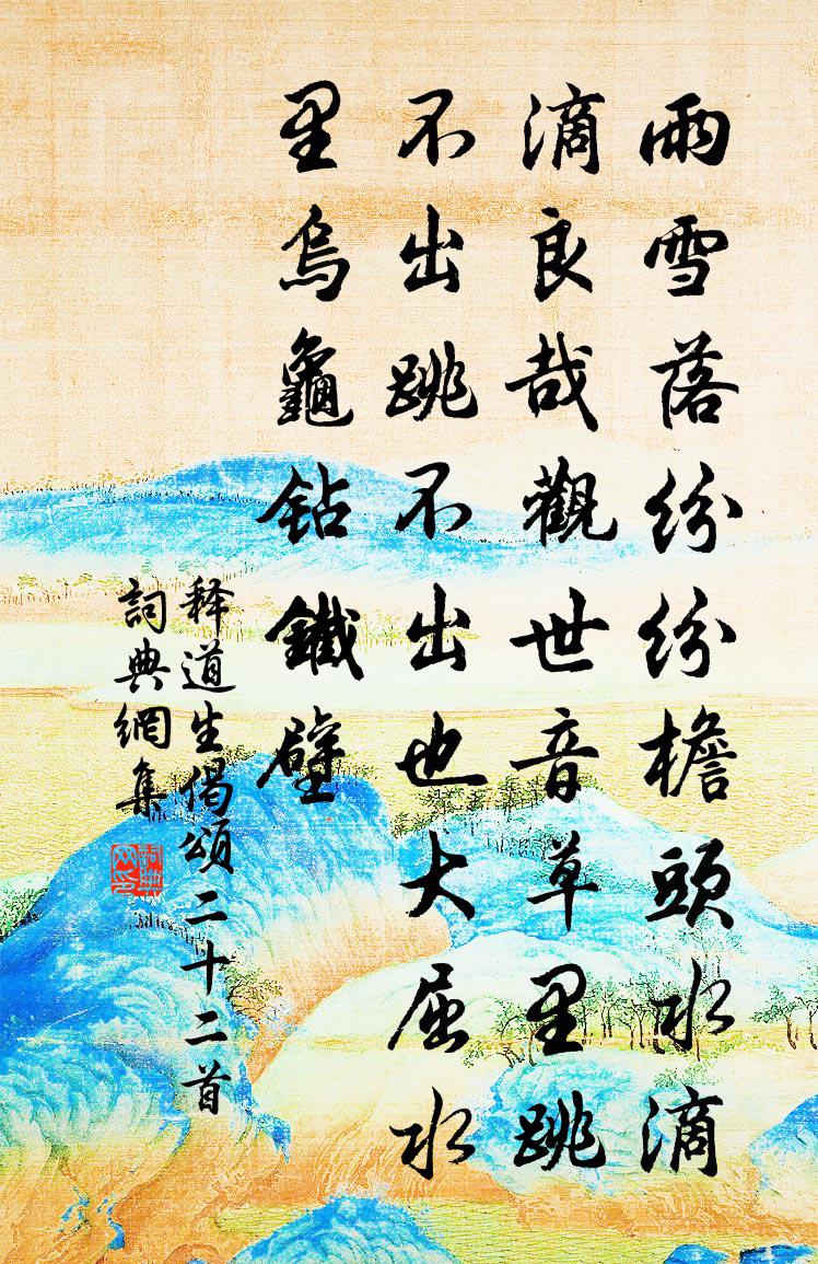 詩詞名句歷史字典書法欣賞書法字典國語詞典說文解字康熙字典古漢語字典標 題 作 者 詩 句 偈頌二十二首作者:釋道生 朝代:宋代偈頌二十二首原文雨雪落紛紛,檐頭水滴滴。良哉觀世音,草里跳不出。跳不出,也大屈,水裡烏龜鑽鐵壁。詩詞問答問:偈頌二十二首的作者是誰?答:釋道生問:偈頌二十二首寫於哪個朝代?答:宋代釋道生偈頌二十二首書法欣賞偈頌二十二首書法作品詩詞推薦千人座釋智愚〔宋代〕蒼崖險處坦然平,萬指曾不此聽經。若謂生公訊息遠,一聲啼鳥共誰聽。銅官山醉後絕句李白〔唐代〕我愛銅官樂,千年未擬還。應須回舞袖,拂盡五松山。(應須 一作:要)遺任子淵省元六首員興宗〔宋代〕我有二三子,文字粲彪炳。一說為波臣,或傳近華省。豈徒異榮寂,又墮生滅境。懸知群物攝,大類任毛穎。不如水仙初花方岳〔宋代〕叢叢低綠玉參差,抱瓮春畦手自冶。地暖乍離煙雨氣,歲寒不改雪霜姿。太真妃以香為骨,虢國人嫌粉涴眉。莫道雪中寄魏衍陳師道〔宋代〕薄薄初經眼,輝輝已映空。融泥還結凍,落木復沾叢。意在千山表,情生一念中。遙知吟榻上,不道絮因風。重題李德裕〔唐代〕晚日臨寒渚,微風發棹謳。鳳池波自闊,魚水運難留。亭古思宏棟,川長憶夜舟。想公高世志,只似冶城游。恭州報恩長老宣公以四偈見別用韻為謝晁公溯〔宋代〕甑中炊火釜烹鮮,莫道巴兒不解禪。日日扣門來乞火。箇中已有一燈傳。孝揚成父約須晴見過二首趙蕃〔宋代〕積雨能涼故自佳,候當秋早欲收畲。頻宵佳月連朝霧,霧破山空日已斜。苕溪草堂自大曆三年夏新營洎秋及春…四十三韻皎然〔唐代〕萬慮皆可遺,愛山情不易。自從東溪住,始與人群隔。應物非宿心,遺身是吾策。先民崆峒子,淪景事金液。綺里春晚吳龍翰〔宋代〕萬綠叢中春事闌,楊花如雪滿江乾。露沾花樹蝶衣重,雨著芹泥燕嘴寒。愁到吟腸詩綰斷,夢依棋局客敲殘。何時偈傾一百三十三首釋法薰〔宋代〕五祖鵓鳩啼,當機直下提。隔山尋蟻跡,能有幾人知。雜曲歌辭。桃花曲顧況〔唐代〕魏帝宮人舞鳳樓,隋家天子泛龍舟。君王夜醉春眠晏,不覺桃花逐水流。寄同志釋智圓〔宋代〕靜院無來客,相懷日又曛。數峰寒有雪,一榻靜眠雲。幾歡淳風喪,寧容俗態群。終期一相訪,對坐議新文。朝日梅堯臣〔宋代〕日色才出海,曉月無光彩。曉月在青空,不與日色同。誠知大君德,照耀無不通。和元遺山三首王奕〔宋代〕聖人與天游,擇地豈必巧。袤延十里林,老翠鎮盤繞。斧斤不可尋,兵劫不能燎。翁仲儼冠帶,麟虎峙強矯。書生贈算數汪生方岳〔宋代〕貂蟬勳業麒麟畫,自有夔龍向上人。數本不為吾輩設,風煙之句水雲身。中秋後二夕陪趙連州飲荷香亭次連州韻陳文蔚〔宋代〕使君今宵有高會,天為好事收滂沱。厭將歌舞競時好,只有風月為計魔。此際主勸客盡醉,何日弟和兄且歌。台高挽崔舍人趙彥中〔宋代〕仙院分宵直,書庭接翼翔。情忘海夫臭,語借令君香。壯發猶藏葆,生芻已奠觴。修文平日事,地下亦為郎。挽故知容州朝請陶公五首羅一龍〔宋代〕幕府當年譽四馳,諸公每恨識這遲。長材若肯為時用,世上何官不可為。九日登李明府北樓劉長卿〔唐代〕九日登高望,蒼蒼遠樹低。人煙湖草里,山翠縣樓西。霜降鴻聲切,秋深客思迷。無勞白衣酒,陶令自相攜。名句推薦飲馬渡秋水,水寒風似刀。王昌齡《塞下曲四首》 床空委清塵,室虛來悲風。潘安《悼亡詩三首》 雪後燕瑤池,人間第一枝。趙令畤《菩薩蠻·春風試手先梅蕊》 綠楊煙外曉寒輕,紅杏枝頭春意鬧。宋祁《玉樓春·春景》 待到山花爛漫時,她在叢中笑。 * 《卜運算元·詠梅》 今人不見古時月,今月曾經照古人。李白《把酒問月·故人賈淳令予問之》 其出不出,間不容髮。班固《漢書·傳·賈鄒枚路傳》 看雪飛、苹底蘆梢,未如鬢白。吳文英《瑞鶴仙·秋感》 十年舊夢無尋處,幾度新春不在家。吳文英《思佳客·癸卯除夜》 黃花深巷,紅葉低窗,淒涼一片秋聲。蔣捷《聲聲慢·秋聲》