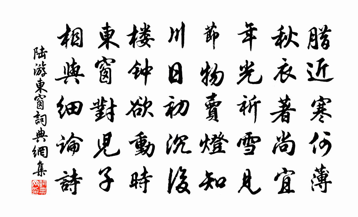 詩詞名句歷史字典書法欣賞書法字典國語詞典說文解字康熙字典古漢語字典標 題 作 者 詩 句 東窗作者:陸游 朝代:宋代東窗原文臘近寒何薄,秋衣著尚宜。年光祈雪見,節物賣燈知。川日初沉後,樓鍾欲動時。東窗對兒子,相與細論詩。詩詞問答問:東窗的作者是誰?答:陸游問:東窗寫於哪個朝代?答:宋代問:陸游的名句有哪些?答:陸游名句大全陸游東窗書法欣賞東窗書法作品詩詞推薦壬寅仲秋二十有五日哭東萊先生之墓徐暄〔宋代〕四海瞻依一偉人,丘封頁頁木森森。仰天慟哭悲風起,舉世中和孰嗣音。宇文袞臣吏部予在蜀日與之游至厚契闊死生二陸游〔宋代〕英姿爽氣宇邛州,雖古人中豈易求。六月長途將暍死,一天風雹起龍湫。題袁州邵錄三老圖王義山〔宋代〕不夸九老寫成圖,要似一家三老無。滿把壽觴拼一醉,父前母后子來扶。發閬中杜甫〔唐代〕前有毒蛇後猛虎,溪行盡日無村塢。江風蕭蕭雲拂地,山木慘慘天欲雨。女病妻憂歸意速,秋花錦石誰複數。別家念奴嬌(初見海棠花)程珌〔宋代〕嫣然一笑,向燭花光下,經年才見。欲語還羞如有恨,方得東君一盼。天意無情,更教微雨,香淚流丹臉。今朝霽西江月 時在天長,正當大暑,歸山後,恰值尹志平〔元代〕九夏天長暑熱,三秋山後清涼。一川禾黍正蒼蒼。了見西成有望。論甚天涯海角,盡他關外山荒。目前無事即仙鄉挽程子山侍講李流謙〔宋代〕我昔先君子,為公義林此。論儒摘寡要,太史固坐井。期公非敬知,力行福黎蠢。螭坳千載逢,鳳池一跬近。獨妍採蓮(搖捱遍)史浩〔宋代〕南鄰幄丹宮,赤伏顯符記。朱陵曜綺繡,箕翼炯、瑞光騰起。每歲秋分老人見,表皇家、襲慶迎祺。天子當膺,無重寄一首蘇軾〔宋代〕凜然高節照時人,不信微官解浼君。蔣濟謂能來阮籍,薛宣直欲吏朱雲。好詩衝口誰能擇,俗子疑人未遣聞。乞取舟中作偈釋楚圓〔宋代〕長江行不盡,帝里到何時。既得涼風便,休將艣棹施。哀王荊公張舜民〔宋代〕鄉閭匍匐苟相哀,得路青雲更肯來。若使風光解流轉,莫將桃李等閒栽。句歐陽鈇〔宋代〕擾擾征人相顧語,蕭蕭落木不勝秋。得樂謝竹溪一首劉克莊〔宋代〕不覺昏眵過十旬,謁之先聖禱之神。室生虛白稀來客,驛致空青累故人。病尚研尋書外意,耄猶貪愛夢中身。從前送應氏曹植〔魏晉〕清時難屢得,嘉會不可常。天地無終極,人命若朝霜。願得展嬿婉,我友之朔方。親昵並集送,置酒此河陽。中饋次韻子瞻系御史獄賦獄中榆槐竹柏竹蘇轍〔宋代〕故園今何有,猶有百竿竹。春雷起新萌,不放牛羊觸。雖無牛欄擁,不見紅塵辱。清風時一過,交戛響鳴玉。淵明題陳待制湖樓徐照〔宋代〕天游觀妙化,人世事皆輕。沆瀣藏仙境,津涯截海城。一身潛汗漫,品類仰高明。有道行藏小,無心視聽精。上疑次韻任信儒見過韓元吉〔宋代〕斗雀嗟窮巷,鳴騶枉故人。塵埃生破甑,風雨墊烏巾。別久情逾厚,詩來語更新。囊空得珠玉,此段不全貧。次劉子駒韻胡宏〔宋代〕心由天造方成性,逐物云為不是真。克得我身人慾去,清風吹散滿空雲。端正好杜安世〔宋代〕野禽林棲啾唧語。閒庭院、殘陽將暮。蘭堂靜悄珠簾窣。想玉人、歸何處。喜鵲幾回薄無據。愁都在、雙眉頭聚。玉樓春晏幾道〔宋代〕一尊相遇春風裡。詩好似君人有幾。吳姬十五語如弦,能唱當時樓下水。良辰易去如彈指。金盞十分須盡意。明朝名句推薦雨後輕寒猶未放。春愁酒病成惆悵。歐陽修《蝶戀花·面旋落花風蕩漾》 絳雪生涼,碧霞籠夜,小立中庭蕪地。吳文英《拜星月慢·林鐘羽姜石帚以盆蓮數十置中庭宴客其中》 半天涼月色,一笛酒人心。袁枚《夜過借園見主人坐月下吹笛》 借與門前磐石坐,柳陰亭午正風涼。范成大《夏日田園雜興》 人之生利也,然且猶尚有節;葬埋者,人之死利也,夫何獨無節於此乎。墨子《墨子·22章 節用(下)》 為問山翁何事,坐看流年輕度,拚卻鬢雙華。葉夢得《水調歌頭·秋色漸將晚》 時危見臣節,世亂識忠良。鮑照《代出自薊北門行》 酌酒會臨泉水,抱琴好倚長松。王維《田園樂七首·其七》 眇眇孤舟逝,綿綿歸思紆。陶淵明《始作鎮軍參軍經曲阿作》 日往菲薇,月來扶疏。左思《三都賦》