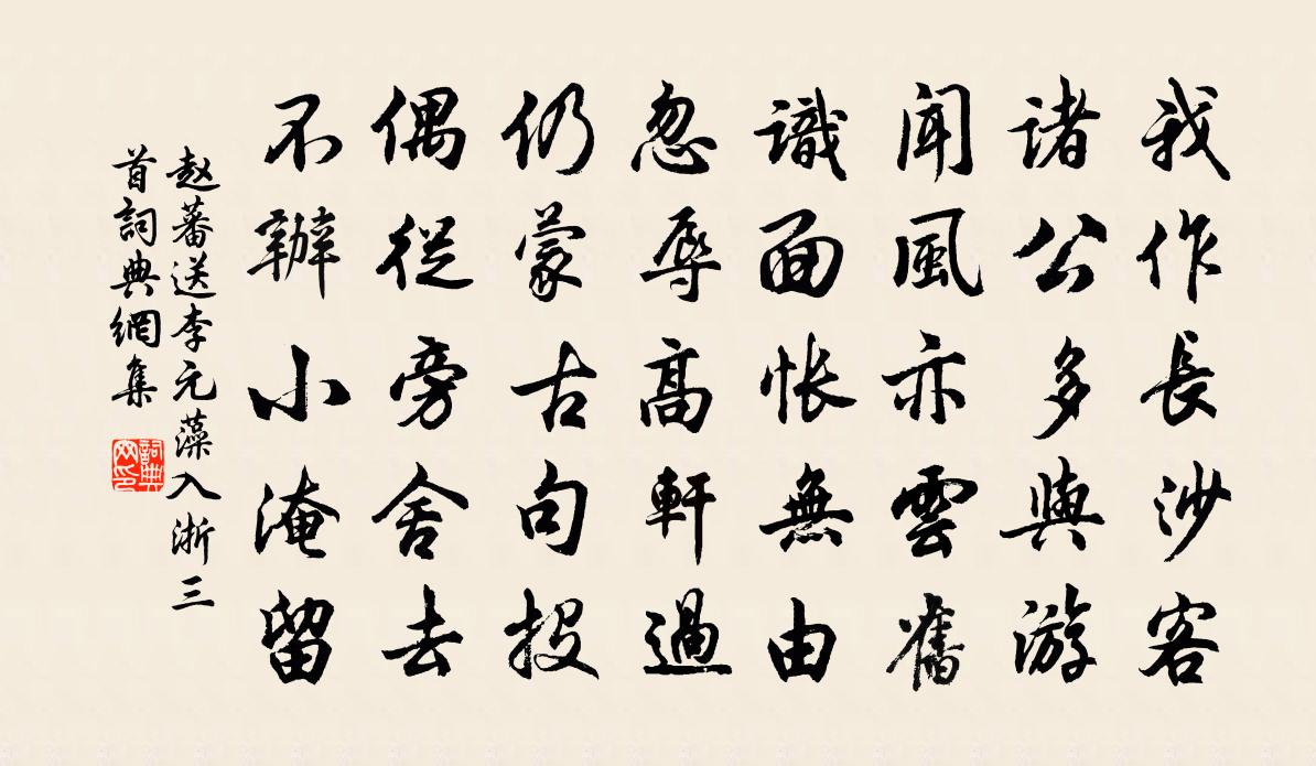 詩詞名句歷史字典書法欣賞書法字典國語詞典說文解字康熙字典古漢語字典標 題 作 者 詩 句 送李元藻入浙三首作者:趙蕃 朝代:宋代送李元藻入浙三首原文我作長沙客,諸公多與游。聞風亦云舊,識面悵無由。忽辱高軒過,仍蒙古句投。偶從旁捨去,不辦小淹留。詩詞問答問:送李元藻入浙三首的作者是誰?答:趙蕃問:送李元藻入浙三首寫於哪個朝代?答:宋代趙蕃送李元藻入浙三首書法欣賞送李元藻入浙三首書法作品詩詞推薦桐柏崇道觀太史章〔宋代〕神仟隱居尚深渺,徑迂不欲與世通。必求峭拔出林杪,俯視左右環群峰。飛泉不測源所自,瀑注一落千丈虹。步躋陳達獻菊花求頌釋印肅〔宋代〕滿地風光未足奇,霜前秋後吐金枝。靈山親舉唯迦葉,今日陳來眾共知。不獨陶生時節用,轉為華藏供阿彌。閒見晚菊史鑄〔宋代〕節過霜風袞袞來,菊花寂寞晚仍開。誰雲好晚保用好,為我殷勤送一杯。偈傾一百三十三首釋法薰〔宋代〕明如日,黑如漆。一犬吠虛,千猱啀寶。山僧有口,多時掛壁。卻煩拄杖子,與諸人通個訊息。東土衲子心粗,西至啟至學慚半古才不逮人雖酷好風騷而不成文李至〔宋代〕吾家何所有,別墅在城南。寒木葉如柿,春溝水似□。樹深鳴乳犢,室暗養新蠶。溫飫每來此,主人無限慚。天台徐德源許以谷應借陳著〔宋代〕枯淡生涯寄草萊,短供不給甑塵埃。吾徒例有絕糧事,世俗何從索米來。邂逅指囷如魯肅,分明流飯自天台。不將送呂道師還天台山王銍〔宋代〕結宇孤峰蘚徑危,身閒鷗鳥信忘機。水聲山色何今古,物態人情果是非。子踏白雲來問道,我垂華發自生輝。赤城別匡山李白〔唐代〕曉峰如畫參差碧,藤影風搖拂檻垂。野徑來多將犬伴,人間歸晚帶樵隨。看雲客倚啼猿樹,洗缽僧臨失鶴池。莫怪歸朝歡(對雪追和東坡詞)王之道〔宋代〕透雪敲窗風D466D466。坐見廣庭飛縞白。長安道上正騎驢,蔡州城裡誰堅壁。表表風塵物。瑤林瓊宇三豪同賦虎幀孔武仲〔宋代〕何事斑然虎,來依靜者堂。英姿猶讋物,畫手必殊常。快筆揮如雨,新縑洗似霜。淺山迎暮黯,業葦得秋黃。炳煥晚到東園陸游〔宋代〕岸幘尋青士,憑軒待素娥。官身苦日短,荒圃得秋多。醉眼輕浮世,羈懷激浩歌。功名從蹭蹬,詩酒且婆娑。寄霅川刁殿丞十二韻趙湘〔唐代〕柳渾曾吟郡,中間遇牧之。留連皆往日,寂寞偶多時。物象應無改,軒車自有期。憶山辭闕早,採藥上官遲。澤國劉文蔚久苦目眚昨日乘涼來過共談先天圖義一家鉉翁〔宋代〕心以靜而虛,眼以動而應。心如明月懸太空,眼如當戶掛清鏡。月光不受微雲乾,鏡光或為塵土暝。學問之道貴澄出門姜特立〔宋代〕出門誰與游,顧影惻我情。賴有木居士,作伴山中行。釋奠齋宿袁說友〔宋代〕雲高天白夜沉沉,牆外誰家送遠砧。有月林梢鳴翠羽,無風窗下落黃金。百年已老安仁鬢,三徑空懷靖節心。病眼達磨莖蘆贊釋慧開〔宋代〕腳下莖蘆,到岸也未。隨流入流,浮逼逼地。送僧洪邁〔宋代〕空中遊戲世界紛河遊戲沙,不知遊戲底處為天涯。乾坤百憶在指掌,觸處與子同一家。云何猶作去來想,千里一跌送密老位五峰黃庭堅〔宋代〕我穿高安過萍鄉,七十二渡遶羊腸。水邊林下逢衲子,南北東西古道場。五峰秀出雲雨上,中有寶坊如側掌。去與和李天麟秋懷五絕句楊萬里〔宋代〕小立南溪暮未還,略容老子照哀顏。頗驚瞑色來天外,未必秋聲在樹間。送鄭秀才歸寧張籍〔唐代〕桂楫彩為衣,行當令節歸。夕潮迷浦遠,晝雨見人稀。野芰到時熟,江鷗泊處飛。離琴一奏罷,山雨靄餘暉。名句推薦停車數行日,勸酒問回期。王建《送人游塞》 柳柔搖不定,草短綠應難。張惠言《風流子·出關見桃花》 明日近長安,客心愁未闌。納蘭性德《菩薩蠻·白日驚飈冬已半》 巨屨小屨同賈,人豈為之哉。孟子《孟子·滕文公章句上·第四節》 敗垣芳草,空廊落葉,深砌蒼苔。徐再思《人月圓·甘露懷古》 聞名不如見面,見面勝似聞名。施耐庵《水滸傳·第三回》 去年射虎南山秋,夜歸急雪滿貂裘。陸游《三月十七日夜醉中作》 誰家秋院無風入?何處秋窗無雨聲?曹雪芹《代別離·秋窗風雨夕》 天下皆知取之為取,而莫知與之為取。范曄《後漢書·列傳·桓譚馮衍列傳上》 千里之行,始於足下。老子《老子·德經·第六十四章》