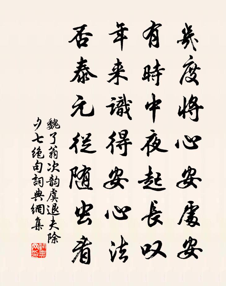 詩詞名句歷史字典書法欣賞書法字典國語詞典說文解字康熙字典古漢語字典標 題 作 者 詩 句 次韻虞退夫除夕七絕句作者:魏了翁 朝代:宋代次韻虞退夫除夕七絕句原文幾度將心安處安,有時中夜起長嘆。年來識得安心法,否泰元從隨蟲看。詩詞問答問:次韻虞退夫除夕七絕句的作者是誰?答:魏了翁問:次韻虞退夫除夕七絕句寫於哪個朝代?答:宋代魏了翁次韻虞退夫除夕七絕句書法欣賞次韻虞退夫除夕七絕句書法作品詩詞推薦題羅隱故居徐照〔宋代〕片水靜無塵,青山是四鄰。上天如有意,此地著詩人。吟得物俱盡,罰令生世貧。因來尋古蹟,只見石為麟。月夜遊孤山吳震〔清代〕松頂一聲鶴,露華滿徑流。靜聞空翠滴,間與片雲留。四面只通水,全山如在舟。明明樓閣夜,有客獨尋秋。過姚監故居(一作經陸補闕故居)方乾〔唐代〕不敢要君徵亦起,致君全得似唐虞。讜言昨嘆離天聽,新冢今聞入縣圖。琴鎖壞窗風自觸,鶴歸喬木月難呼。學書登高丘望無海李復〔宋代〕登高望遠海,冥冥濕天際。百川趨東南,奔騰卷厚地。自從開闢來,溶停不可計。浩浩無增虧,周流在一氣。怒風懷天如隱士王堯臣〔宋代〕先生高蹈晦岩扉,沐發晞陽遠帝暉。自是鸞皇終瑞世,莫同魚鳥便忘機。江鳧汎汎隨波遠,逆雁冥冥避戈歸。他日束擔羅與之〔宋代〕束擔出荊扉,征塵染敝衣。人憐雙鬢改,我悟半生非。抱璞今誰訴,知音古亦稀。尋思無一可,吾道欲安歸。和蛩栗齋豐翠蛟亭趙汝譡〔宋代〕眾峰抱蒼龍,蟠屈翠蛟水。放之兩崖閒,奔洶不得止。濤瀾生席上,雷雹轉石底。恍疑天柱搖,將拔險洞起。蘇公正月十九日孟享從駕洪咨夔〔宋代〕新將給事換前銜,班被真除法從挽。道是緊頭人不信,回看壓得兩緋衫。題王仲弓兄弟巽亭黃庭堅〔宋代〕大隗七聖迷,許田連城重。里中多佳樹,與世作梁棟。市門行清渠,潩水可抱瓮。翬飛城東南,隱几撫群動。人境榆溪道上歐陽玭〔唐代〕初日在斜溪,山雲片片低。鄉愁夢裡失,馬色望中迷。澗底淒泉氣,岩前遍綠荑。非關秦塞去,無事候晨雞。滿庭芳(答景盧遣懷)洪适〔宋代〕蝴蝶夢魂,芭蕉身世,幾人得到龐眉。十分如意,天賦古今稀。晝日猥叨三接,摩鵬翼、曾化鯤池。槐陰下,深慚偈頌一百四十一首釋師範〔宋代〕行不動塵,語不動唇。現成行貨,黃金白銀。君不見洞山老,問佛直答麻三斤。小重山(立春日欲雪)毛滂〔宋代〕誰勸東風臘里來。不知天待雪,惱江梅。東郊寒色尚徘徊。雙彩燕,飛傍鬢雲堆。玉冷曉妝檯。宜春金縷字,拂香和柳子玉紙帳蘇轍〔宋代〕夫子清貧不耐冬,書齋還費紙重重。窗明曉日從教入,帳厚霜飈定不容。京兆牛衣聊可藉,公孫布被旋須縫。吳綾恭謝侍讀仁皇訓典徹章御賜杜工部紫宸殿詩退杜范〔宋代〕丹地從容接細氈,豈徒口耳漫周旋。帝王家法由心法,典策言傳以道傳。章徹誦筵天意悅,恩隆賜典露華鮮。禮文入館蘇軾〔宋代〕黃省文書分道山,靜傳鐘鼓建章閒。天邊玉樹西風起,知有新秋到世間。湖上陸游〔宋代〕飄然世外更何求,終日橋邊弄釣舟。回視老身猶長物,縱無炊米莫閒愁。煙生墟落垂垂晚,雁下陂湖處處秋。欲覓宿岸道人精舍閻防〔唐代〕早歲參道風,放情入寥廓。重因息心侶,遂果岩下諾。斂跡辭人間,杜門守寂寞。秋風翦蘭蕙,霜氣冷淙壑。山牖聞微之江陵臥病,以大通中散、碧腴垂雲膏寄白居易〔唐代〕已題一帖紅消散,又封一合碧雲英。憑人寄向江陵去,道路迢迢一月程。未必能治江上瘴,且圖遙慰病中情。到時鳴山馬覺〔宋代〕我來方自噤,投宿寓鳴山。立仗占所戒,對山空厚顏。名句推薦勿貪意外之財,勿飲過量之酒。朱柏廬《朱子家訓·全文》 扁舟去作江南客,旅雁孤雲。朱敦儒《採桑子·彭浪磯》 行路難,不在水,不在山,只在人情反覆間。白居易《太行路》 戰戰慄栗,日慎一日,苟慎其道,天下可有。韓非及後人《韓非子·初見秦》 小娃撐小艇,偷采白蓮回。白居易《池上》 菀菀黃柳絲,濛濛雜花垂。常建《春詞二首》 燕歸花謝,早因循、又過清明。納蘭性德《紅窗月·燕歸花謝》 脅肩諂笑,病於夏畦。孟子《孟子·滕文公章句下·第七節》 壯歲從戎,曾是氣吞殘虜。陸游《謝池春·壯歲從戎》 不系雕鞍門前柳,玉容寂寞見花羞,冷風兒吹雨黃昏後。喬吉《春閨怨·不系雕鞍門前柳》