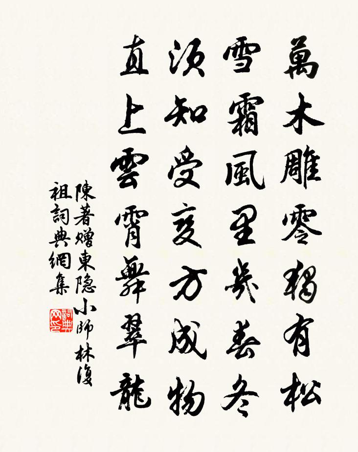 詩詞名句歷史字典書法欣賞書法字典國語詞典說文解字康熙字典古漢語字典標 題 作 者 詩 句 贈東隱小師林復祖作者:陳著 朝代:宋代贈東隱小師林復祖原文萬木雕零獨有松,雪霜風裡幾春冬。須知受變方成物,直上雲霄舞翠龍。詩詞問答問:贈東隱小師林復祖的作者是誰?答:陳著問:贈東隱小師林復祖寫於哪個朝代?答:宋代陳著贈東隱小師林復祖書法欣賞贈東隱小師林復祖書法作品詩詞推薦和遲田舍雜詩九首蘇轍〔宋代〕至人竟安在,陶鑄皆秕糠。世俗那得知,楚楚事冠裳。方醉狂正作,吾語未可莊。天定能勝人,更看熟黃粱。滿江紅(赴長沙幕府,別餞,送客)呂勝己〔宋代〕拍碎紅牙,一聲上、梁塵暗落。紈扇掩、雛鶯葉下,巧呈綽約。字字只愁郎幸淺,聲聲似怨年華薄。坐中人、相顧滿江紅(奉酬曾端伯使君,兼簡趙若虛監郡)向子諲〔宋代〕雁陣橫空,江楓戰、幾番風雨。天有意、作新秋令,欲鏖殘暑。籬菊岩花俱秀髮,清氛不斷來窗戶。共歡然、一醉有憶韓偓〔唐代〕晝漏迢迢夜漏遲,傾城訊息杳無期。愁腸泥酒人千里,淚眼倚樓天四垂。自笑計狂多獨語,誰憐夢好轉相思。何時挽吳尚書三首吳芾〔宋代〕公守東陽郡,於今已十年。人猶誦遺愛,政不愧前賢。清議當時重,休聲後代傳。我來叨郡佐,悵望隔重泉。醉歸敖陶孫〔宋代〕夜深霜月冷侵膚,醉飲歸來得自娛。霧氣水光同浩渺,誤看田野作江湖。錢塘聞子規艾性夫〔宋代〕汴水淒涼已百年,長因啼鳥一潸然。天津橋上無人聽,尚喜錢塘有杜鵑。偈頌一百二十三首釋崇岳〔宋代〕去卻一,拈卻七,佛祖玄關元不識。百尺竿頭掉臂行,笑指西方日頭出。透金圈,吞栗棘,明眼衲僧沒氣息。曹著與客謎佚名〔唐代〕一物坐也坐,臥也坐,行也坐(客)。(著應聲曰:“在官地,在私地。”)一物坐也臥,立也臥,行也臥,走也舟中懷稚子袁說友〔宋代〕遠浦三更月,春風一夜程。平生慣安靜,多病怯征行。急櫓夸先後,連山護送迎。關心小兒女,幽夢落東城。九日戲作晁說之〔宋代〕無高可登無節序,無菊與泛無酒樽。歸計知時凌海岳,傷心成醉迷乾坤。冥冥煙雨翻愁思,急急風霜若苦言。安得齊雩祭歌 黑帝 二謝朓〔南北朝〕聽嚴風。來不息。望玄雲。黝無色。曾冰烈。積羽幽。飛雪至。天山側。送張無夢歸天台查道〔宋代〕天台峻極橫海濱,金庭紫洞多真人。先生舍道心照鄰,上有羲軒為逸民。玉韞深山珠在水,圓折如虹難自晦。萬乘春意二首王建〔唐代〕去日丁寧別,情知寒食歸。緣逢好天氣,教熨看花衣。誰是杏園主,一枝臨古岐。從傷早春意,乞取欲開枝。讀親征詔楊冠卿〔宋代〕詔語沈醇告萬方,便知九鼎不勞扛。波巨奔走扶黃屋,約束風濤過大江。送仲連梅堯臣〔宋代〕別緒如亂絲,欲理還不可。卻悲嬌女詩,寧戀更效左。是時遠道懷,紛紛上歸舸。憐君正如此,豈任風雨俀。同清江師月夜聽堅正二上人為懷州轉法華經歌朱灣〔唐代〕若耶溪畔雲門僧,夜閒燕坐聽真乘。蓮花秘偈藥草喻,二師身住口不住。鑿井求泉會到源,閉門避火終迷路。前心蝶戀花趙崇嶓〔宋代〕一翦微寒禁翠袂。花下重開,舊燕添新壘。風旋落紅香幣地。海棠枝上鶯飛起。薄霧籠春天欲醉。碧草澄波,的的送李著作知柳州李覯〔宋代〕到官十五月,太半在他邦。惠術示施一,公心無與雙。剖符新使粵,盡室始浮江。地理將分嶺,行程即下瀧。旅愁和任宰元紹見寄十首以歸來問信湖山撫摩松菊吳芾〔宋代〕四圍山繞舍,一帶水平湖。遠近俱堪畫,登臨自足娛。名句推薦蘭溪三日桃花雨,半夜鯉魚來上灘。戴叔倫《蘭溪棹歌》 昨日鄰家乞新火,曉窗分與讀書燈。王禹偁《清明》 花意爭春,先出歲寒枝。辛棄疾《江神子·賦梅寄余叔良》 花開堪折直須折,莫待無花空折枝。杜秋娘《金縷衣》 田園寥落干戈後,骨肉流離道路中。白居易《望月有感》 小酌酒巡銷永夜,大開口笑送殘年。白居易《雪夜小飲贈夢得》 滿川風雨獨憑欄,綰結湘娥十二鬟。黃庭堅《雨中登岳陽樓望君山》 昨夜吳中雪,子猷佳興發。李白《答王十二寒夜獨酌有懷》 舟覆乃見善游,馬奔乃見良御。劉安及其門客《淮南子·說林訓》 謀無主則困,事無備則廢。管仲《管子·霸言》