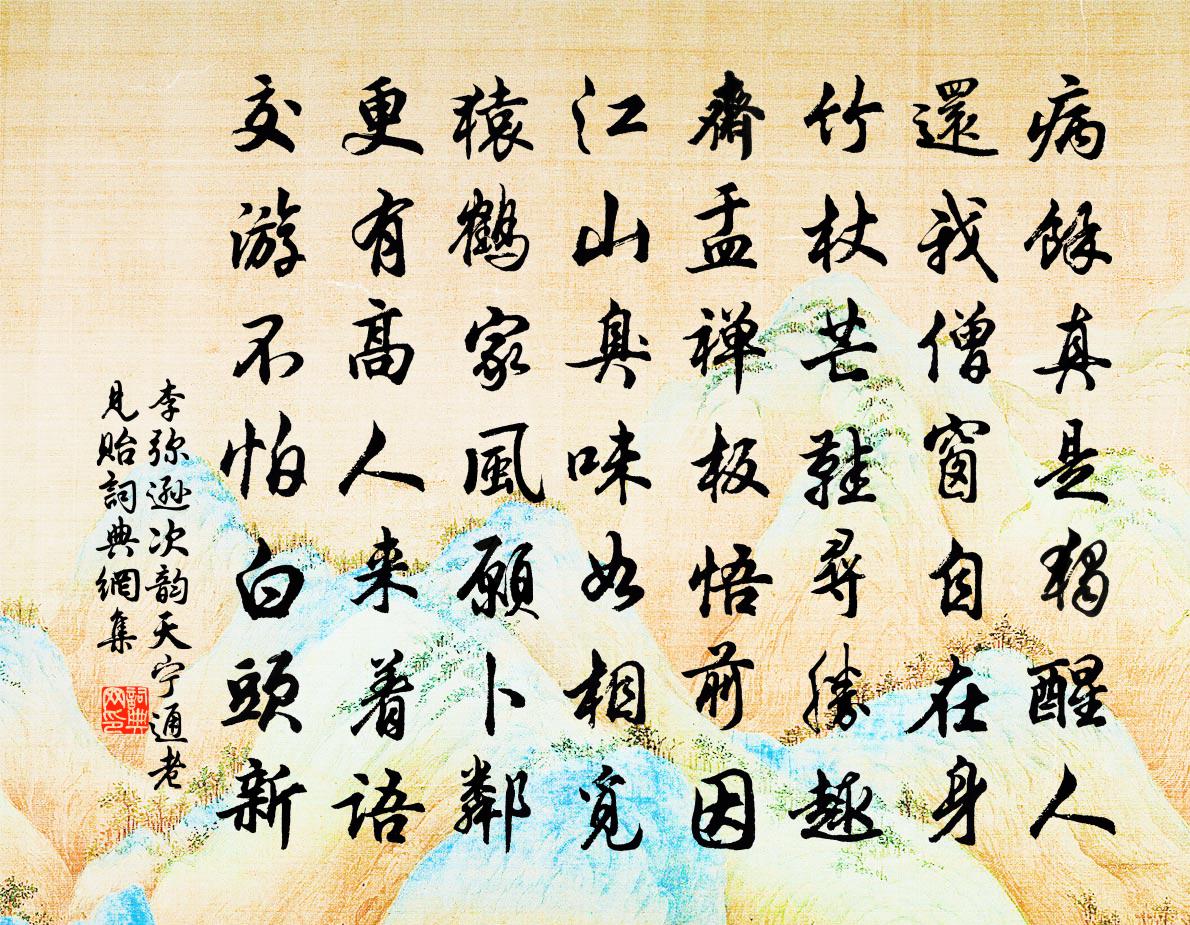 詩詞名句歷史字典書法欣賞書法字典國語詞典說文解字康熙字典古漢語字典標 題 作 者 詩 句 次韻天寧通老見貽作者:李彌遜 朝代:宋代次韻天寧通老見貽原文病餘真是獨醒人,還我僧窗自在身。竹杖芒鞋尋勝趣,齋盂禪板悟前因。江山臭味如相覓,猿鶴家風願卜鄰。更有高人來著語,交遊不怕白頭新。詩詞問答問:次韻天寧通老見貽的作者是誰?答:李彌遜問:次韻天寧通老見貽寫於哪個朝代?答:宋代李彌遜次韻天寧通老見貽書法欣賞次韻天寧通老見貽書法作品詩詞推薦鶯鳴十章寄戚伯瑞彭龜年〔宋代〕莫克匪己,莫玩匪理。有懷於是,不知子之所止。江行吳融〔唐代〕來時風,去時雨,蕭蕭颯颯春江浦。欹欹側側海門帆,軋軋啞啞洞庭櫓。逢韓茂貽因贈並追傷戴敬夫邢昉〔清代〕莫道相逢久嘆嗟,尚憐流落在天涯。故人長隔黃壚面,苕水空餘白雪花。行路更無磨鏡具,扣門唯識賣漿家。羌村送江陵薛侯入覲序袁宏道〔明代〕當薛侯之初令也,璫而虎者,張甚。郡邑之良,泣而就逮。侯少年甫任事,人皆為侯危。侯笑曰:“不然。此蒙莊早朝十絕趙子潚〔宋代〕北面高呼拜冕旒,星垂華渚彩虹浮。春風滿泛蒲萄酒,喜溢謳聲遍九州。殿前歡盧摯〔元代〕酒杯濃,一葫蘆春色醉疏翁,一葫蘆酒壓花梢重。隨我奚童,葫蘆乾興不窮。誰人共?一帶青山送。乘風列子,列和榮安中月明夜行郭印〔宋代〕驅車夜出城,佳月傍人明。始向山頭見,還同水面行。問途幾一舍,投宿已三更。露濕衣裘冷,吾生笑自輕。寄王秘書白居易〔唐代〕霜菊花萎日,風梧葉碎時。怪來秋思苦,緣詠秘書詩。載酒過景仁不園韓維〔宋代〕地勝依危堞,城高若半峰。銜觴驚歲序,候雪仰雲容。不假貓滋竹,須防犬敗松。顧慚文俗吏,游步躡仙蹤。拜明招二先生墓有感王柏〔宋代〕炯炯長空一片心,東南鼎立統斯文。卷藏萬古春歸去,只有餘光在此君。闕題王邁〔宋代〕拙成可抵萬金璧。從古至今不偶合,如何二妙一時出。仆也若調烏鵲鳴,斂翅甘受黃鶴擘。自從手授大雅文,孺子上雲樂陸龜蒙〔唐代〕青絲作筰桂為船,白兔搗藥蝦蟆丸。便浮天漢泊星渚,回首笑君承露盤。戎州汪元量〔宋代〕錦樹高枝種萬窠,歲收百斛足生涯。八錢買得一斤重,魯直詩 * 地夸。又登碧雲亭感懷三十首吳芾〔宋代〕晚上危亭想謫仙,孤墳寂寂鎖寒煙。高風直節誰能繼,只有詩篇後代傳。送房杭州(孺復)韋應物〔唐代〕專城未四十,暫謫豈蹉跎。風雨吳門夜,惻愴別情多。贈黃縣尉二首項安世〔宋代〕震澤逢君意便傾,湘江見我眼中明。鎖闈地榻談風雨,放流雙舟話晚晴。南嶽歌行雲里和,西亭今古夜深評。無端沁園春佚名〔宋代〕明月呈規,祥煙非霧,載符夢鈴。記前時已慶,人間鸑鷟,今番再見,天上麒麟。知是於門,功標紫府,夜半仙官禱雨木欄堂四首陳造〔宋代〕絕知豐凶有數,豈必天地不仁。鵓鳩底用緘口,晨霞徒解欺人。十絕句呈章茂深安撫陳造〔宋代〕追尋名勝剩留年,白首猶參五字禪。寄語蜚廉亟回馭,擬凌風去訪詩仙。宮祠滿秩曾幾〔宋代〕雲水天台郡,祠庭我所監。幾年真傲吏,今日是前銜。祿米誰周急,園蔬不療饞。上書端未免,定不達空函。名句推薦勝概日相與,思君心鬱陶。岑參《鞏北秋興寄崔明允》 燕支落漢家,婦女無華色。李白《塞上曲》 驕奢淫逸,所自邪也。左丘明《左傳·隱公·隱公三年》 蛺蝶飛來過牆去,卻疑春色在鄰家。王駕《雨晴》 茶為累也,亦猶人參。陸羽《茶經·一之源》 疑行無名,疑事無功。司馬遷《史記·七十列傳·商君列傳》 犯刑若履虎,不畏落爪牙。李白《秦女休行》 太高人愈妒,過潔世同嫌。曹雪芹《紅樓夢·第五回》 綺席象床寒玉枕,美人何處醉黃花。汪元量《望江南·幽州九日》 敵未滅,何以家為?脫脫《宋史·列傳·卷一百二十四》