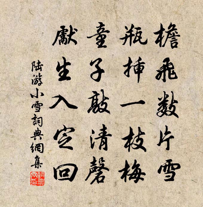 詩詞名句歷史字典書法欣賞書法字典國語詞典說文解字康熙字典古漢語字典標 題 作 者 詩 句 小雪作者:陸游 朝代:宋代小雪原文檐飛數片雪,瓶插一枝梅。童子敲清磬,先生入定回。詩詞問答問:小雪的作者是誰?答:陸游問:小雪寫於哪個朝代?答:宋代問:陸游的名句有哪些?答:陸游名句大全陸游小雪書法欣賞小雪書法作品詩詞推薦丘慶餘畫兔周文璞〔宋代〕家住棲賢雲,泉石恣幽討。寫出明視孫,眉目增媚好。卯日行踆踆,衣褐坐芳草。脫身文字禍,見機恨不早。仰候褚叔豪赴山陰和靖祠長戴表元〔宋代〕此老真迂闊,白頭方出山。一燈河洛後,千礎剡湖間。講鼓驚雲動,書船載月間。可無容席地,容我了躋攀。夏日七首張耒〔宋代〕野水彎環夏木森,清蟬晚噪碧雲深。扁舟兩槳誰家子,萬里江湖此日心。浣溪沙 紅橋懷古,和王阮亭韻納蘭性德〔清代〕無恙年年汴水流。一聲水調短亭秋。舊時明月照揚州。曾是長隄牽錦纜,綠楊清瘦至今愁。玉鉤斜路近迷樓。禽言陸游〔宋代〕老翁老尚健,打麥持作飯。終歲隴畝間,勞苦孰敢怨。人生為農最可願,得飽正如持左券。碓舂樵爨小甑香,豈不水龍吟譚處端〔元代〕欲修無上菩提,便合下手須頭段。莫令帶水,拖泥土粘,*些兒縈絆。生死明來,也全無在,自家決斷。把凡胎濁問訊東霞李師王洋〔宋代〕烘林日動雲霞雜,繞坐香通蘭惠分。一局仙棋春院閉,不教聲利世間聞。水調歌頭(李彭州炁生日)魏了翁〔宋代〕促織誰遣妝,唧唧不能休。攬衣起觀,四顧河漢淡如油。露下南山薈尉,風抹西湖菱芰,客感浩悠悠。尚此推不去蝶戀花(題未色褚仲良寫真)張炎〔宋代〕濟楚衣裳眉目秀。活脫梨園,子弟家聲舊。諢砌隨機開笑口。筵前戲諫從來有。戛玉敲金裁錦繡。引得傳情,惱得贈相士岳鬼眼白玉蟾〔宋代〕眉峰肩井額陂陀,此相曾經鬼眼過。知有命存聊爾耳,謂無天定盍如何。十常九事未如意,一滿三停屬甚科。佛說題天長縣蘇太尉廟王令〔宋代〕唐室無臣覆手移,坐看悍媼制庸兒。思量可惜當年死,卻是西來問鼎師。次韻何茂恭詠玉簪三絕喻良能〔宋代〕未開黃鈿紫冠小,誰與幽人作好秋。一笑相看兩不厭,翠雲堆里玉搔頭。偈頌九十三首釋梵琮〔宋代〕白雲無定,明月有期。欲出未出,似歸不歸。秋山呈錦繡,紅葉滿林飛。瞥不瞥,知不知。鏡里無塵閒處照,柴頭送光孫崇元讀書姜特立〔宋代〕吾兒毛骨已森然,會見排風上紫煙。但把文章博科第,便成陸地作神仙。胸中滔裕書多讀,筆下縱橫業要專。卜者紹興祀九宮貴神十首佚名〔宋代〕[太簇為徽]於赫九宮,天神之貴。煌煌彪列,下土是蒞。幽贊高穹,陰騭萬類。肅若舊典,有嚴祗事。為昌州月上人贊布袋釋紹曇〔宋代〕拄杖不能倚靠,穩跨布袋打坐。莫怪噴嚏不成,鼻孔元來無竅。解連環(姑蘇懷古)佚名〔宋代〕霽鬟新掠。正風回浪影,時搖城腳。嘆天涯、春草無倫,似凝佇當時,柳顰花弱。步錦珠沈,謾一眸、千年如昨。句張元乾〔宋代〕玄鯽隨鉤誠養親。如夢令吳潛〔宋代〕雨過遠山如洗。雲散落霞如綺。嫩綠與殘紅,又是一般春意。春意。春意。只怕杜鵑催里。【黃鐘】醉花陰_獨倚屏山把白賁〔元代〕獨倚屏山把玉纖屈,並鴛枕將歸期算徹。一自玉人別,瘦骨岩岩,趲過裙腰摺。【出隊子】粉香一捻,不思量難棄名句推薦欲勝人者,必先自勝;欲論人者,必先自論;欲知人者,必先自知。呂不韋《呂氏春秋·紀·季春紀》 料敵以遠,須謀於今;去賊以盡,其謀無忌。來俊臣《羅織經·謀劃卷第九》 今年歡笑復明年,秋月春風等閒度。白居易《琵琶行 / 琵琶引》 燕子不知人去也,飛認闌乾。韓疁《浪淘沙·莫上玉樓看》 淚眼問花花不語,亂紅飛過鞦韆去。歐陽修《蝶戀花·庭院深深深幾許》 星垂平野闊,月涌大江流。杜甫《旅夜書懷》 貂不足,狗尾續。房玄齡《晉書·列傳·第二十九章》 無數春筍滿林生,柴門密掩斷行人。杜甫《詠春筍》 爭名者於朝,爭利者於市。劉向《戰國策·秦一·司馬錯與張儀爭論於秦惠王前》 望望不見君,連山起煙霧。李白《金鄉送韋八之西京》