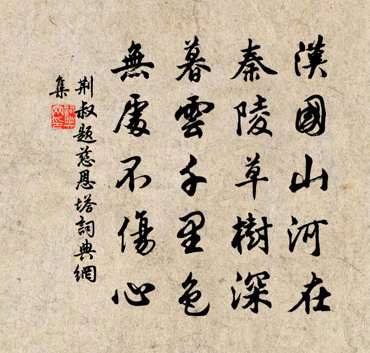 詩詞名句歷史字典書法欣賞書法字典國語詞典說文解字康熙字典古漢語字典標 題 作 者 詩 句 題慈恩塔作者:荊叔 朝代:唐代題慈恩塔原文漢國山河在,秦陵草樹深。暮雲千里色,無處不傷心。詩詞問答問:題慈恩塔的作者是誰?答:荊叔問:題慈恩塔寫於哪個朝代?答:唐代問:題慈恩塔是什麼體裁?答:五絕荊叔題慈恩塔書法欣賞題慈恩塔書法作品注釋全唐詩:卷774-17詩詞推薦慕容簿送題寶峰石刻並中秋詞以詩謝之舒邦佐〔宋代〕步屧尋僧到日西,亂山深處見新碑。卻驚天上披風手,亦卷波瀾入小詩。天台瀑布曹松〔唐代〕萬仞得名雲瀑布,遠看如織掛天台。休疑寶尺難量度,直恐金刀易剪裁。噴向林梢成夏雪,傾來石上作春雷。欲知謁金門翁元龍〔宋代〕鶯樹暖。弱絮欲成芳繭。流水惜花流不遠。小橋紅欲滿。原上草迷離苑。金勒晚風嘶斷。等得日長春又短。愁深山紀事二十四首梁啓超〔清代〕後顧茫茫虎穴身,忍將多難累紅裙。君看十萬頭顱價,遍地鉏麑欲噬人。謁金門(帶湖新月)韓淲〔宋代〕雲外月。畫出一痕清絕。梅已飄零桃未發。帶湖煙水闊。汀渚尚留微雪。不恨酒融歌歇。老我多情膠漫結。半醒空謝蕭和伯見訪戴復古〔宋代〕定交雖日淺,老眼見君深。急誼真如渴,能詩不肯吟。江湖尊白髮,土苴視黃金。野客無邊幅,相看話此心。睦州呂郎中郡中環溪亭方乾〔唐代〕為是仙才登望處,風光便似武陵春。閒花半落猶迷蝶,白鳥雙飛不避人。樹影興余侵枕簟,荷香坐久著衣巾。暫來懷古題雪十首李訴懷雪方鳳〔宋代〕有唐御極天所命,蠢爾孽臣作梟獍。克壯謀猷斷乃成,出師不愁天雪盛。銜枚夜渡張柴村,西平有子國有孫。懸弧羌奴鄭獬〔宋代〕豢飽則蹄齧,羌奴敢肆行。蚊蝱失驅逐,螻蟻遂縱橫。古先謀士帥,今誰可將兵。廟堂攬群策,還許訪書生。連日大雪獨坐有感虞儔〔宋代〕呼得蒼頭數橐金,旋沽村酒過牆陰。焦琴不鼓知音斷,凍筆頻呵作意吟。擾擾漫天空眩目,看看出日為寒心。憑君洗研洪咨夔〔宋代〕自洗洮州綠。,閒題柿葉紅。一塵空水月,百念老霜風。鈍菊淒猶蕾,顛桃艷已叢。斡流千萬變,誰實主鴻蒙。雙清樓曹水雲分韻得齋字史彌寧〔宋代〕湘水衡雲畫軸開,天將此本勘詩才。我無健句可題品。包寧江西曾撙齋。頌古一百首釋智愚〔宋代〕青山白雲,碧溪蘿月。畫虎成狸,只得一橛。送縉雲苗太守王維〔唐代〕手疏謝明主,腰章為長吏。方從會稽邸,更發汝南騎。按節下松陽,清江響鐃吹。露冕見三吳,方知百城貴。雪李洞〔唐代〕迢迢來極塞,連闕謂風吹。禪客呵金錫,征人擘凍旗。細填蟲穴滿,重壓鶴巢欹。有影晴飄野,無聲夜落池。正繁早起二首張耒〔宋代〕滄江 * 雨翻盆,將曉風聲戰亂雲。籬下寒雞鳴曉苦,老人先起自開門。七女峰白玉蟾〔宋代〕宋時松竹晉時苔,路轉山回洞戶開。流水也知塵世雜,依然流向此山來。兒寬徐鈞〔宋代〕射策明經亦巨儒,巧迎封禪意何如。相如未死猶知恥,卻了相如死後書。送廣禪人釋正覺〔宋代〕溫風促客下雲嶺,觸處無心即道游。得坐會當明變豹,出門須解倒騎牛。沖煙筇入青蘿徑,載月船回白鳥洲。中外偶題魏慶芝〔宋代〕庭夜酣紅杏,牆陰染碧苔。吟翁醉未醒,啼鳥去還來。名句推薦和氏之璧乎?價重千金,然以之間紡,曾不如瓦磚。劉向《說苑·雜言》 晚春盤馬踏青苔,曾傍綠陰深駐。晏幾道《御街行·街南綠樹春饒絮》 春宵苦短日高起,從此君王不早朝。白居易《長恨歌》 胡馬依北風,越鳥巢南枝。佚名《行行重行行》 握手一長嘆,淚為生別滋蘇武《留別妻》 扶桑已在渺茫中,家在扶桑東更東。韋莊《送日本國僧敬龍歸》 凡流言、流說、流事、流謀、流譽、流愬,不官而衡至者,君子慎之荀子《荀子·致士》 向淺洲遠渚,亭亭清絕。張炎《疏影·詠荷葉》 眾芳搖落獨暄妍,占盡風情向小園。林逋《山園小梅二首》 高岸為谷,深谷為陵。佚名《十月之交》