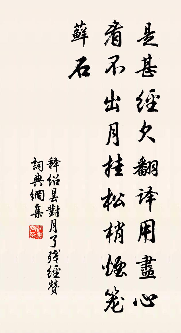 詩詞名句歷史字典書法欣賞書法字典國語詞典說文解字康熙字典古漢語字典標 題 作 者 詩 句 對月了殘經贊作者:釋紹曇 朝代:宋代對月了殘經贊原文是甚經,欠翻譯。用盡心,看不出,月掛松梢,煙籠蘚石。詩詞問答問:對月了殘經贊的作者是誰?答:釋紹曇問:對月了殘經贊寫於哪個朝代?答:宋代釋紹曇對月了殘經贊書法欣賞對月了殘經贊書法作品詩詞推薦水調歌頭(幕府諸公有和,再用韻謝之)李曾伯〔宋代〕敢問遼天月,歷幾億春秋。老娥盍相刮目,無一語相酬。似訝經年間闊,類笑衰翁潦倒,歲歲客他州。清照五湖闊蘇幕遮 勸李哥馬鈺〔元代〕羊兒皮,虎兒質。害物心機,盡夜無寧息。雖惡肯將兒子食。休逞威風,真性宜調習。親非親,識非識。雲水清閒挽秦國夫人李流謙〔宋代〕久矣鴻飛渚,翩然雁字峰。九重疏異渥,萬里合幽封。引柩烏銜壤,馴阡鹿護松。他時人下馬,有子是夔龍。頌古一百二十一首釋宗杲〔宋代〕古廟裡頭迴避得,紙錢堆畔暗嗟吁。閒神野鬼皆驚怕,只為渠儂識梵書。贈趙崇侍御(一作贈趙常六韻)方乾〔唐代〕貴達合逢明聖日,風流又及少年時。才因出眾人皆嫉,勢欲摩霄自不知。正直早年聞苦節,從容此日見清規。卻教禪人求贊四首釋宗杲〔宋代〕鄒搜斂似天烝棗,輕輕觸著便煩惱。身著如來三事衣,口中謗佛法僧寶。從來纖芥不與人,一毫不就他人討。驀然石帆夏日陸游〔宋代〕石帆山下雨冥冥,閒岸紗巾憩草亭。單復篝衣時脫著,甜酸園果半黃青。鰥魚無隊依蒲藻,病鶴長鳴鎩翅翎。自笑雨後陸游〔宋代〕一夜茅檐雨,晨興乃爾涼。禽魚皆遂性,草木自吹香。微潤生琴藨,纖塵避筆床。悠然北窗興,真欲傲羲皇。獨駿圖毛直方〔宋代〕連天苜蓿青茫茫,鹽車鼓車紛道傍。肉駿汗血不可常,權奇倜儻晦若藏。五之六之無留良,如此獨步何堂堂。日三仲鹹以一秋苦雨兩日忽晴以四韻見寄因次原韻王禹偁〔宋代〕愁霖百日思低迷,昨夜星辰似舊時。稼穡已傷憂客計,津梁全壞怯歸期。丹河浪減沙痕漲,錦嶺霜晴月影遲。喜霽游道場山次沈國錄韻張栻〔宋代〕玻瓈盆外起千鬟,路入空濛紫翠間。心遠最便天宇迥,眼明偏見野雲閒。寒泉宰木留千載,清磬疎鍾度兩山。我亦華亭百詠鶴坡許尚〔宋代〕索寞東郊遠,仙禽盡此藏。夢回明月夜,林杪響圓吭。游博羅香積寺蘇軾〔宋代〕二年流落蛙魚鄉,朝來喜見麥吐芒。東風搖波舞淨綠,初日泫露酣嬌黃。汪汪春泥已沒膝,剡剡秋谷初分秧。誰言食筍汪炎昶〔宋代〕乃□驚躍玻璃寒,骨被頑甲流腥涎。甦槁為穰功莫論,帝日報汝後澧蕃。或居渭水或淇園,一派逃人荒硯灣。劂後永遇樂辛棄疾〔宋代〕怪底花寒梅,一花枝雪裡,直恁愁絕。問訊無言,依稀似妒,天上飛英白。江山一夜,瓊瑤萬頃,此段如何妒得。偈頌十首釋曇密〔宋代〕菩提妙心作麽發,日應萬機元不差。回首瞥然輕覷著,大千沙界是皇家。【雙調】夜行船 秋懷佚名〔元代〕一夜秋聲入井梧,碧紗廚枕剩珊瑚。秦鳳東歸,楚雲西去,舊歡娛等閒辜負。 【風入松】翠屏燈影照人孤,花秋日雜興范成大〔宋代〕即事亦足樂,何必桃李塵!蒼筠如蒼玉,鄉是澗壑姿。朅來西窗下,死生付污泥。蟲緣有病葉,土瘦無新枝。太陽送越將歸會稽貫休〔唐代〕面如玉盤身八尺,燕語清獰戰袍窄。古岳龍腥一匣霜,江上相逢雙眼碧。冉冉春光方婉娩,黯然別我歸稽巘。他年西園早春二首宋祁〔宋代〕樽酒不常滿,年華祗自春。言歸雖薄澣,業已負良辰。野翠欣欣遍,林紅撲撲新。其如好風景,料理愛詩人。名句推薦善善不進,惡惡不退;賢者隱蔽,不肖在位;國受其害。黃石公《三略·上略》 空勞縴手,解佩贈情人。牛希濟《臨江仙·柳帶搖風漢水濱》 慷慨十年長劍在,登樓一笑暮山橫。崔允《花馬池詠》 玉梅消瘦,恨東皇命薄。汪元量《傳言玉女·錢塘元夕》 老吾老,以及人之老;幼吾幼,以及人之幼。孟子《孟子·梁惠王章句上·第八節》 喜得故人同待詔,擬沽春酒醉京華。高啟《清明呈館中諸公》 簾外雨潺潺,春意闌珊。李煜《浪淘沙令·簾外雨潺潺》 我見君來,頓覺吾廬,溪山美哉。辛棄疾《沁園春·和吳尉子似》 總是愁媒,欲訴誰消遣蘇軾《蝶戀花·蝶懶鶯慵春過半》 同欲者相憎,同憂者相親。劉向《戰國策·中山·犀首立五王》