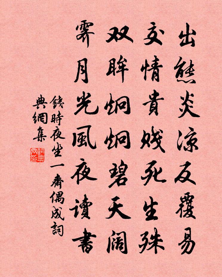 詩詞名句歷史字典書法欣賞書法字典國語詞典說文解字康熙字典古漢語字典標 題 作 者 詩 句 夜坐一齋偶成作者:錢時 朝代:宋代夜坐一齋偶成原文出態炎涼反覆易,交情貴賤死生殊。雙眸炯炯碧天闊,霽月光風夜讀書。詩詞問答問:夜坐一齋偶成的作者是誰?答:錢時問:夜坐一齋偶成寫於哪個朝代?答:宋代錢時夜坐一齋偶成書法欣賞夜坐一齋偶成書法作品詩詞推薦武陵春(藤州江月樓)向滈〔宋代〕長記酒醒人散後,風月滿江樓。樓外煙波萬頃秋。高檻冷颼颼。想見雲鬟香霧濕,斜墜玉搔頭。兩處相思一樣愁。留守待制視學石介〔宋代〕泮水淥猶淺,春芹葉始敷。旌旗久停住,衿佩儼相趍。庾亮親臨學,哀公不詬儒。茲為表則地,風教自王都。寄徐季益四首趙蕃〔宋代〕呂氏多人物,譬之珠玉淵。世官渠有命,家學定誰傳。籍甚群公譽,皆雲正字賢。掖垣君舊識,聊與話當年。秋日郊居陸游〔宋代〕兒童冬學鬧比鄰,據案愚儒卻自珍。授罷村書閉門睡,終年不著面看人。冷泉亭方回〔宋代〕金鞍驟紫陌,詎識林下勝。石苔為誰碧,我輩坐乃稱。絲毫無愧容,照此冷泉鏡。竹樹亦如我,不與春色競。匏尊贈道人劉得仁〔唐代〕長在城中無定業,賣丹磨鏡兩途貧。三山來往尋常事,不省曾驚市井人。連理枝楊維楨〔元代〕主家連理木,昨夜一枝零。野藤沿別樹,相托萬年青。北行第九十五文天祥〔宋代〕遊子無根株,世梗悲路澀。關山雪邊看,愁思胡笳夕。送王司馬之陝州(自太常丞授,工為詩)劉禹錫〔唐代〕暫輟清齋出太常,空攜詩卷赴甘棠。府公既有朝中舊,司馬應容酒後狂。案牘來時唯署字,風煙入興便成章。兩京括蒼溪漲樓鑰〔宋代〕雨余大溪觸山流,氣勢直欲凌沙洲。浮梁中分斷螮蝀,流沫更去行蛟虬。人家嘈嘈避新漲,雲稼苒苒添平疇。漁翁臨邛道士招魂歌艾性夫〔宋代〕錦襪生塵脫紅玉,瓊蟾夜抱金娥哭。芙蓉露瘦寒花鈿,鳷鵲樓空冷銀燭。輕鸞小鳳橫紫簫,彩雲密漾青霞綃。桂心成都運司西園亭詩海棠軒許將〔宋代〕海棠冠蜀花,此軒花尤冠。紅雲簇蕊細,淥水照葉嫩。倚妝宮粉聚,疊綺霞光散。雨淚點春風,應懷上林怨。攤破浣溪沙·手卷真珠李璟〔唐代〕手卷真珠上玉鉤,依前春恨鎖重樓。風裡落花誰是主,思悠悠。青鳥不傳雲外信,丁香空結雨中愁。回首綠波三楚聞北師克捷喜而成詠楊億〔宋代〕歲晏層冰合,煙塵起羯陲。文昌先命將,羽檄便徵師。天迥星狼滅,宵寒月魄虧。前軍臨瀚海,後騎縛閼氏。蘇北鉏菜陸游〔宋代〕江吳霜雪薄,終歲富嘉蔬。菘韭常相續,萵蔓亦有餘。家貧闕粱肉,身病忌鼀魚。幸有荒畦在,何妨日荷鋤。村飲陸游〔宋代〕無念無營飽即嬉,老翁真箇似嬰兒。昏鍾未動先酣枕,日上三竿是起時。宮詞宋白〔宋代〕掖庭宮女僅千人,有勅都教放出門。戀主頓忘幽憤意,促辭中使盡啼痕。汝墳秋同仙州王長史翰聞百舌鳥祖詠〔唐代〕秋天聞好鳥,驚起出簾帷。卻念殊方月,能鳴巳後時。遷喬誠可早,出谷此何遲。顧影慚無對,懷群空所思。淒涼沁園春戴復古〔宋代〕一曲狂歌,有百餘言,說盡一生。費十年燈火,讀書讀史,四方奔走,求利求名。蹭蹬歸來,閉門獨坐,贏得窮吟偈頌十六首釋如淨〔宋代〕不勞澄九鼎,流動百花新。木雞前樹報,月磨蘿鏡輪。名句推薦自古驕兵多致敗,從來輕敵少成功。羅貫中《三國演義·第六十九回》 惜恐鏡中春。不如花草新。張先《菩薩蠻·憶郎還上層樓曲》 至若救渴,飲之以漿;蠲憂忿,飲之以酒;盪昏寐,飲之以茶。陸羽《茶經·六之飲》 千點寒梅曉角中,一番春信畫樓東。楊慎《鷓鴣天·元宵後獨酌》 出師未捷身先死,長使英雄淚滿襟。杜甫《蜀相》 斜風細雨不須歸。蘇軾《浣溪沙·漁父》 桐花半畝,靜鎖一庭愁雨。周邦彥《瑣窗寒·寒食》 峰巒如聚,波濤如怒,山河表里潼關路。張養浩《山坡羊·潼關懷古》 水上遊人沙上女,回顧,笑指芭蕉林里住。歐陽炯《南鄉子·畫舸停橈》 老驥伏櫪,志在千里。曹操《龜雖壽 / 神龜雖壽》