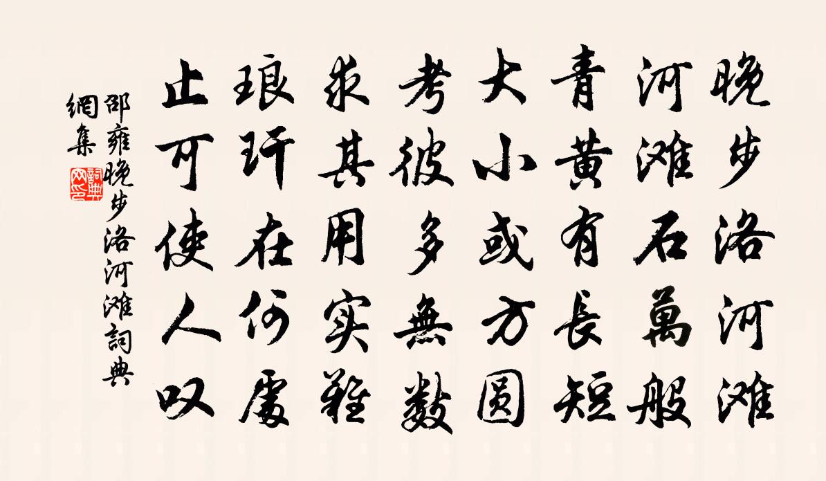 詩詞名句歷史字典書法欣賞書法字典國語詞典說文解字康熙字典古漢語字典標 題 作 者 詩 句 晚步洛河灘作者:邵雍 朝代:宋代晚步洛河灘原文晚步洛河灘,河灘石萬般。青黃有長短,大小或方圓。考彼多無數,求其用實難。琅玕在何處,止可使人嘆。詩詞問答問:晚步洛河灘的作者是誰?答:邵雍問:晚步洛河灘寫於哪個朝代?答:宋代邵雍晚步洛河灘書法欣賞晚步洛河灘書法作品詩詞推薦寄徹公楊衡〔唐代〕北風吹霜霜月明,荷葉枯盡越水清。別來幾度龍宮宿,雪山童子應相逐。寄浙漕王子文野以思君令人老五字為韻得詩五五邁〔宋代〕西山門下士,雜襲如魚鱗。惟我與子文,受愛異他人。送我長沙序,言言足書紳。贈君樵川詩,字字示寵珍。潛齋題園門時少章〔宋代〕林花落處憶初妍,半折妖紅似隔年。今日綠陰還漲眼,卻思花落又茫然。減字木蘭花姚述堯〔宋代〕天寒人靜。嘯倚胡床閒畫永。春信初回。報導南枝昨夜開。沈沈庭院。獨坐黃昏誰是伴。風過南牆。似覺天宮暗遞仲和時齋即事葛紹體〔宋代〕夾徑花開一丈紅,傍池新竹萬枝風。閒來笑語忘為客,杯酒淡煙明月中。頌古十三首釋德光〔宋代〕師之一字見還難,直下應須透祖關。縱使祖關開正眼,前頭更有萬重山。梅花呈孫奇父諸公胡宏〔宋代〕萬里春回過短牆,孤標亦似殿年芳。蕭疏月下天然瘦,澹宕風前自在香。寒色重時花正發,暖煙才禁實先嘗。越人李泌二首黎廷瑞〔宋代〕一副黃台話,離離詠種瓜。都來三十字,救得兩官家。長兒授館於杭每休暇過仲實家相與譚經析理間牟巘五〔宋代〕共飲方酣月滿樓,劇談無寐露侵裘。此宵此景應難值,吾婿吾兒亦罕儔。情誼渾如同一姓,風流不負兩中秋。絕憐辭酒賀鑄〔宋代〕魯酒一樽薄,吾愁萬斛多。塵埃斬馬劍,涕泗飯牛歌。髀肉生如許,顛毛黑幾何。功名可復道,身世兩蹉跎。侍宴長寧公主東莊應制鄭愔〔唐代〕公門襲漢環,主第稱秦玉。池架祥鱣序,山吹鳴鳳曲。拂席蘿薜垂,回舟芰荷觸。平陽妙舞處,日暮清歌續。別故人鄭思肖〔宋代〕拍馬又登程,余酣尚未醒。曙蟾消淡白,秋漢覆空青。江走游龍勢,山蟠睡虎形。飄零毋感歡,天地亦浮萍。送陳表道倅岳陽樓鑰〔宋代〕垂上青雲去,如何乘貳車。輕為千里別,時寄幾行書。剸劇才無滯,傳家學有餘。當塗足知己,應不費吹噓。姑惡邵定〔宋代〕姑惡,姑惡。姑不惡,新婦惡。不聞姑聲罵婦錯,但聞婦聲數姑虐。汝夫汝夫汝所嚴,汝姑又知天之天。高高在上月夜邵雍〔宋代〕雨霽風自好,秋深天未寒。移床就堦下,看月出林端。有酒欲共飲,無賓可同歡。他時遇良友,此景復求難。偈釋圓〔宋代〕新縫紙被烘來暖,一覺安眠到五更。聞得上方鐘鼓動,又添一日在浮生。月波樓鄭獬〔宋代〕古壕鑿出明月背,樓角飛來兔影中。野色更無山隔斷,天光直與水相通。溪藏畫舫青紋接,人住荷花碧玉叢。誰把又再作晁說之〔宋代〕世人不我與,自契黃龍心。竟復何遠近,一瞬萬古今。和李崧卿九日姜特立〔宋代〕重陽無菊悶書空,心似淵明興不同。聊且攜壺上東嶺,不妨欹帽對西風。百年盡付無何外,三逕誰如阿堵中。十月九日楊冠卿〔宋代〕淒涼少陵老,梓州九日詩。朝廷入夢想,弟妹天一涯。我亦困羇旅,千古同其悲。不忍嗅新菊,惟思詠江蘺。名句推薦無人知此意,歌罷滿簾風。陳與義《臨江仙·高詠楚詞酬午日》 可憐處處巢居室,何異飄飄托此身。杜甫《燕子來舟中作》 樓台處處迷芳草,風雨年年怨落花。曾棨《維揚懷古》 一水護田將綠繞,兩山排闥送青來王安石《書湖陰先生壁》 江海不擇小助,故能成其富。韓非及後人《韓非子·大體》 田舍清明日,家家出火遲。王建《寒食》 去年折贈行人遠,今年恨、依然縴手。吳文英《花心動·柳》 仁者,人也,親親為大。義者,宜也,尊賢為大。子思《中庸·第二十章》 一晌憑欄人不見,鮫綃掩淚思量遍。馮延巳《鵲踏枝·梅落繁枝千萬片》 已訴徵求貧到骨,正思戎馬淚盈巾。杜甫《又呈吳郎》