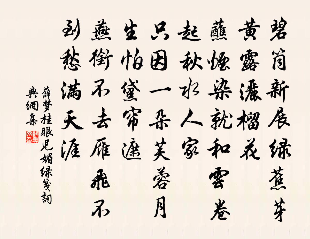 詩詞名句歷史字典書法欣賞書法字典國語詞典說文解字康熙字典古漢語字典標 題 作 者 詩 句 眼兒媚(綠箋)作者:薛夢桂 朝代:宋代眼兒媚(綠箋)原文碧筒新展綠蕉芽。黃露灑榴花。蘸煙染就,和雲捲起,秋水人家。只因一朵芙蓉月,生怕黛簾遮。燕銜不去,雁飛不到,愁滿天涯。詩詞問答問:眼兒媚(綠箋)的作者是誰?答:薛夢桂問:眼兒媚(綠箋)寫於哪個朝代?答:宋代問:眼兒媚(綠箋)是什麼體裁?答:詞薛夢桂眼兒媚(綠箋)書法欣賞眼兒媚(綠箋)書法作品詩詞推薦和吳警齋侍郎二首劉克莊〔宋代〕帝憫龍鍾許放還,夢魂尚記侍威顏。難陪貢禹王陽後,猶在申公轅固間。昔領群仙上蓬島,今為居士老香山。痴年寄洞元師鄭獬〔宋代〕一尊聊寄洞元師,既到山中春未遲。料得醉眠岩石上,晚風零落小桃枝。淮南夜泊黎廷瑞〔宋代〕低篷矮艇載詩翁,又泊淮南港汊東。月黑荒村行獨虎,雲深遠渚拍低鴻。詩書落落心如梗,天地悠悠鬢欲蓬。輾轉贈劉司戶蕡李商隱〔唐代〕江風揚浪動雲根,重碇危檣白日昏。已斷燕鴻初起勢,更驚騷客後歸魂。漢廷急詔誰先入,楚路高歌自欲翻。萬里浣溪沙趙磻老〔宋代〕懶畫娥眉倦整冠。筍苞來點鏡中鬟。承恩容易報恩難。鬒髮未饒青箬笠,素鱗行簇水晶盤。流觴元自不相干。擬古納蘭性德〔清代〕予生未三十,憂愁居其半。心事如落花,春風吹已斷。行當適遠道,作記殊汗漫。寒食青草多,薄暮煙冥冥。山桃題白蓮院東軒蔡襄〔宋代〕昔年文酒自為情,身外鴻毛萬事輕。暑醉每憐風引夢,夜歸多見月隨行。重尋蘭若余芳在,卻怪桑門老態生。點數五更一點月照窗幾以為曉也披衣視之雪厚至尺李石〔宋代〕雪片成孤立,蟾華與共游。從教驚蜀犬,曾是喘吳牛。蹲石依松瘦,寒溪映竹流。遙知明歲稔,攜酒上南樓。次韻王主簿同考試項安世〔宋代〕文陣樅樅劍戟業,喚回習氣老臧宮。分明天上三題草,消盡人間一世雄。聖處門庭開蕩蕩,春來風景樂融融。何年久雨秋懷二首劉學箕〔宋代〕孤雲野鶴情自在,碧水丹山人易安。哀鴻獨叫暮天闊,宿鷺雙飛秋雨寒。蔗林遮眼青到市,柏葉漫山紅隔水。不將鵲踏枝/蝶戀花仲殊〔宋代〕一霎雕欄疏雨罷。三月十三,曾是寒食夜。盡日暖香熏柏麝。西施醉起留歸駕。酒滿玻璃花艷冶。莫負春心,快飲趙妹自鹹陽寄華州石縫山芋來作絕句二首晁說之〔宋代〕秦中歡喜迎吾祖,知道官家不用兵。今日曾孫何所負,華山芋蕷自多情。岳陽樓李商隱〔唐代〕漢水方城帶百蠻,四鄰誰道亂周班。如何一夢高唐雨,自此無心入武關。冉溪柳宗元〔唐代〕少時陳力希公侯,許國不復為身謀。風波一跌逝萬里,壯心瓦解空縲囚。縲囚終老無餘事,願卜湘西冉溪地。卻學午憩東塘近白乾江西地盡於此楊萬里〔宋代〕日以秋還短,塗緣熱故長。也知茅店小,柰此竹風涼。更遠終然到,而吾有底忙。欲行猶小駐,咫尺便他卿。琴枕釋師範〔宋代〕巧出焦桐樣,淳含太古音。多因和夢聽,只作夜蟲吟。寄淮南友人李白〔唐代〕紅顏悲舊國,青歲歇芳洲。不待金門詔,空持寶劍游。海雲迷驛道,江月隱鄉樓。復作淮南客,因逢桂樹留。哭孫季蕃二首劉克莊〔宋代〕每歲鶯花要主盟,一生風月最關情。相君未識陳三面,兒女多知柳七名。自有菊泉供祭享,不消麥飯作清明。老身晚眺二首林季仲〔宋代〕秋色澹修渚,夕光明小樓。溪虛煙漠漠,天迥雁悠悠。短髮存堪數,黃花插自羞。青山本無事,斂黛為誰憂。枕傍有杜集看其行役諸詩有感復書趙蕃〔宋代〕既將取詩名,先應歷詩窮。不見杜陵老,飄轉一世中。世學汝不嗜,而顧思此工。豈惟人汝憎,造物且見入。無須名句推薦一番桃李花開盡,惟有青青草色齊。曾鞏《城南·雨過橫塘水滿堤》 嫦娥應悔偷靈藥,碧海青天夜夜心。李商隱《嫦娥》 登山則情滿于山,觀海則意溢於海劉勰《文心雕龍·神思》 鎮日無心掃黛眉。臨行愁見理征衣。夏竦《鷓鴣天·鎮日無心掃黛眉》 一笛當樓,謝娘懸淚立風前史達祖《玉蝴蝶·晚雨未摧宮樹》 仰天大笑出門去,我輩豈是蓬蒿人。李白《南陵別兒童入京》 不見去年人,淚濕春衫袖。歐陽修《生查子·元夕》 算韶華,又因循過了,清明時候。王雱《倦尋芳慢·露晞向晚》 華表月明歸夜鶴,嘆當時、花竹今如此吳文英《金縷歌·陪履齋先生滄浪看梅》 君子務修其內而讓之於外。荀子《荀子·儒效》