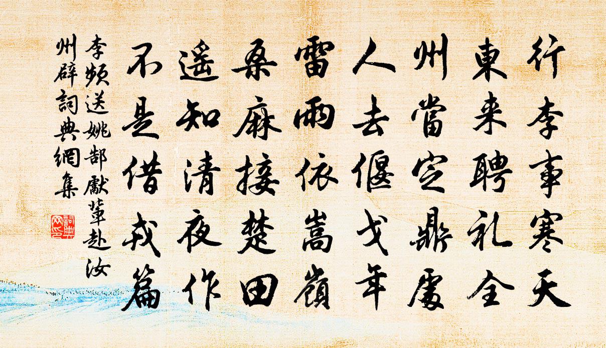 詩詞名句歷史字典書法欣賞書法字典國語詞典說文解字康熙字典古漢語字典標 題 作 者 詩 句 送姚郜先輩赴汝州辟作者:李頻 朝代:唐代送姚郜先輩赴汝州辟原文行李事寒天,東來聘禮全。州當定鼎處,人去偃戈年。雷雨依嵩嶺,桑麻接楚田。遙知清夜作,不是借戎篇。詩詞問答問:送姚郜先輩赴汝州辟的作者是誰?答:李頻問:送姚郜先輩赴汝州辟寫於哪個朝代?答:唐代問:送姚郜先輩赴汝州辟是什麼體裁?答:五律李頻送姚郜先輩赴汝州辟書法欣賞送姚郜先輩赴汝州辟書法作品注釋全唐詩:卷588-4詩詞推薦偶然作屈復〔清代〕百金買駿馬,千金買美人;萬金買高爵,何處買青春?送左禹赴江夏尉賀鑄〔宋代〕泛泛青翰舟,亭亭黃鶴樓。江山信清灑,人物想風流。美酒遣歸思,新詩題舊遊。有魚知不食,端作置書郵。又和後九首劉克莊〔宋代〕自遣病魔病豎,不乾藥上藥王。洗眼菊泉舊本,照懷蓉月新涼。望郡城酬舟中諸丈陶夢桂〔宋代〕歸路寧迂三兩程,落霞孤鶩近鄉城。水連南浦天然碧。秋入西山雨後清。鹿夢已醒諳世事,鷗盟獨在見交情。近來花降圖唐寅〔明代〕風暖香消翠帳柔,相逢偏喜得春稠。憐卿自是多情者,猶有多情在後頭。九日對菊有懷粹老在河上四首黃庭堅〔宋代〕月邀棋約屢登台,學省公廳只對街。九日菊花孤痛飲,百端人事可安排。和王晉卿(並敘)蘇軾〔宋代〕駙馬都尉王詵晉卿,功臣全彬之後也。元豐二年,予得罪貶黃岡,而晉卿亦坐累遠謫,不相聞者七年。予既召用,挽尤端明四首李曾伯〔宋代〕自入烏公府,受知三十秋。水魚承雅眷,風鶴記良籌。一意人才進,平居國事憂。絲桐宜束閣,誰似子期不。三絕句杜甫〔唐代〕前年渝州殺刺史,今年開州殺刺史。群盜相隨劇虎狼,食人更肯留妻子。二十一家同入蜀,惟殘一人出駱谷。自說謝人惠雲巾方舄二首蘇軾〔宋代〕燕尾稱呼理未便,剪裁雲葉卻天然。無心只是青山物,覆頂宜歸紫府仙。轉覺周家新樣俗,未容陶令舊名傳。鹿門笑堂釋妙倫〔宋代〕冷地無端錯喜歡,卻將鴟吻對門安。引它鐵作麵皮漢,千里聞風也破顏。水調歌頭(賦魏方泉望湖樓)吳文英〔宋代〕屋下半流水,屋上幾青山。當心千頃明鏡,入座玉光寒。雲起南峰未雨,雲斂北峰初霽,健筆寫青天。俯瞰古城堞白帝城宋肇〔宋代〕東雨霏霏白帝城,秋草未枯春草生。古來戰壘如雲橫,萬里瞿塘斷人行。至今三峽路崢嶸,時清不見更屯兵。荒涼頌證道歌證道歌釋印肅〔宋代〕去聖遠兮邪見深,祖師肚裹覓知音。兩個禪僧相借問,舊時佛法不如今。書與士瞻上人十首仇遠〔宋代〕倦遊嬾著小烏巾,短髮絲絲雪滿簪。信手拈書聊慰眼,轉頭忘事太無心。笑他杜老頻看鏡,愛我昭文不鼓琴。喜有題李氏敬聚堂家鉉翁〔宋代〕一矜字十年除得,一信字五年乃成。我贈君家一敬字,須知受用在平生。劫桑嘆高斯得〔宋代〕美哉豳郊道,風日清且熙。條桑紛冉冉,采蘩復祁祁。盛時不可再,亂世誠堪悲。守令既暗懦,凶黠何紛披。千林寓江陵能仁僧舍二首王炎〔宋代〕容膝非無地,安心即是家。焚香翻貝葉,汲水養梅花。無客同持酒,呼僧共煮茶。夜寒燒木佛,誰是老丹霞。林次中奉使契丹劉仲平出倅鄆州同舍十有六人秦觀〔宋代〕須句別駕偉儀刑,陵谷初無見坦平。七子建安推世藝,五經中秘擅家聲。南宮參掇端如夢,東觀分攜空復情。莫愛湖州歌九十八首 其九十四汪元量〔宋代〕曉望燕雲正雪天,閉門氈帳恣高眠。內家遺鈔三千錠,添賜三宮日用錢。名句推薦莫見長安行樂處,空令歲月易蹉跎。李頎《送魏萬之京》 用之在於機,顯之在於勢。姜子牙《六韜·文韜·兵道》 日月忽其不淹兮,春與秋其代序。屈原《離騷》 怪人不知理,知理不怪人。佚名《增廣賢文·下集》 譬猶使人負劍,而求其壽也。墨子《墨子·25章 節葬(下)》 金玉其外,敗絮其中劉基《賣柑者言》 傍鄰聞者多嘆息,遠客思鄉皆淚垂。李頎《聽安萬善吹觱篥歌》 挫其銳,解其紛,和其光,同其塵。湛兮,似或存。老子《老子·道經·第四章》 苦雨思白日,浮云何由卷。李白《玉真公主別館苦雨贈衛尉張卿二首》 路出寒雲外,人歸暮雪時。盧綸《李端公 / 送李端》