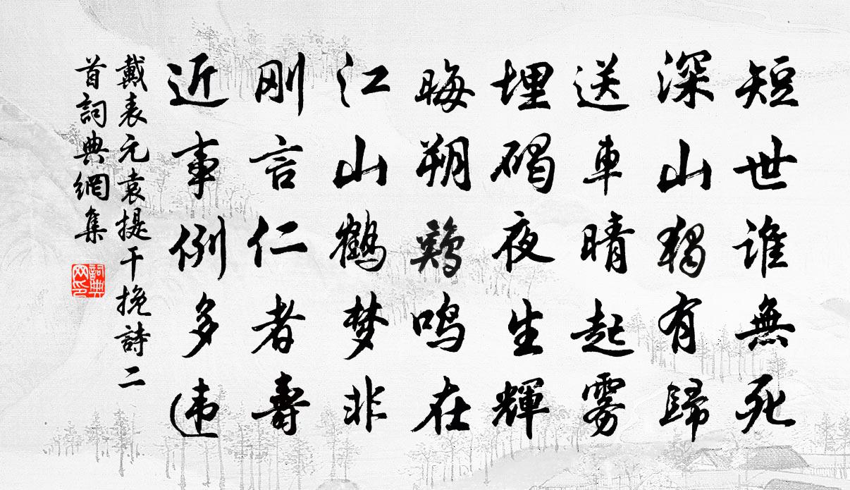 詩詞名句歷史字典書法欣賞書法字典國語詞典說文解字康熙字典古漢語字典標 題 作 者 詩 句 袁提乾輓詩二首作者:戴表元 朝代:宋代袁提乾輓詩二首原文短世誰無死,深山獨有歸。送車晴起霧。埋碣夜生輝。晦朔雞鳴在,江山鶴夢非。剛言仁者壽,近事例多違。詩詞問答問:袁提乾輓詩二首的作者是誰?答:戴表元問:袁提乾輓詩二首寫於哪個朝代?答:宋代戴表元袁提乾輓詩二首書法欣賞袁提乾輓詩二首書法作品詩詞推薦戲答王觀復酴醾菊二首黃庭堅〔宋代〕呂園未肯輕沽我,且寄田家砌下栽。他日秋花媚重九,清香知自故人來。題北窗陸游〔宋代〕不嗔人作腐儒看,斷簡堆中興未闌。更事愈懷憂國切,苦心始覺著書難。流泉激激人聲遠,修竹蕭蕭暑令寒。四海龍泉山中釋善珍〔宋代〕自墾屋頭三四畦,得閒時復事鉏犁。花粘蛛網礙蜂度,樹帶鷹巢無雀棲。嘯罷半山聞逸響,詩成絕壁見新題。老來小疾治藥偶書陸游〔宋代〕御戎虛上策,治疾闕全功。安得如神禹,常行無事中?即席重賦且約再游二首陳與義〔宋代〕詩情不與歲情闌,春氣猶兼水氣寒。怪我問花終不語,須公走馬更來看。共知浮世悲駒隙,即見平波散芡盤。得一嘉禾頌七章章四句吳泳〔宋代〕惟唐叔是景,獻諸天子。天子不有,以歸肇祀。萱草林景熙〔宋代〕近種鹿蔥碧,初抽鵠觜黃。千年入風雅,一草寄綱常。澹日空階影,余 * 佩香。此時憂正切,對爾可能忘。次韻宋秀才白玉蟾〔宋代〕晝弄朱曦夜弄蟾,知他何處地行仙。殿前昔奏三千字,腰下曾纏十萬錢。得句直疑無李白,草書真箇過張顛。有時玉樓春(至盱眙作)毛滂〔宋代〕長安回首空雲霧。春夢覺來無覓處。冷煙寒雨又黃昏,數盡一堤楊柳樹。楚山照眼青無數。淮口潮生催曉渡。西風送鑒上人釋普度〔宋代〕鑒在機先已是遲,電光石火亦難追。鷲峰點著便回去,終不重安眼上眉。句楊蟠〔宋代〕兩州城郭青煙起,千里江山白鷺飛。持課袁說友〔宋代〕夢接三乘境,乘勝一炷薰。風窗獨趺坐,鳥雀聽聲聞。目想金剛會,心存貝葉文。稍蠲煩惱毒,天雨看繽紛。夏夜露坐二首楊萬里〔宋代〕山翠都成黑,天黃忽復青。月肥過半璧,雲瘦不遮星。瓦鼓三四隻,村酤一兩瓶。人皆笑我醉,我獨笑渠醒。又漁父詞二首蒲壽宬〔宋代〕岩下無心雲自飛,塘邊足雨水初肥。龜曳尾,綠毛衣。桂隱紀詠檨蘋舟張鎡〔宋代〕玉立蜻蜓小,香欺漫港秋。百年清絕意,孤棹抵封侯。流夜郎至江夏陪長史叔及薛明府宴興德寺南閣李白〔唐代〕紺殿橫江上,青山落鏡中。岸回沙不盡,日映水成空。天樂流香閣,蓮舟颺晚風。恭陪竹林宴,留醉與陶公。拜嚴方范祠趙蕃〔宋代〕東都重風節,先生實啟之。有士蓋如此,不拯家國危。乃知大廈傾,未易一木支。我讀黨錮傳,涕流每交頤。往來贈徐山人李洞〔唐代〕徐生何代降坤維,曾伴園公采紫芝。瓦礫變黃憂世換,髭鬚放白怕人疑。山房古竹粗於樹,海島靈童壽等龜。知嘆嘉禾百詠列岫亭張堯同〔宋代〕吾州購物好,惟是欠青山。忽有洞庭色,來從一笑間。過三鄉望女幾山,早歲有卜築之志羊士諤〔唐代〕女幾山頭春雪消,路傍仙杏發柔條。心期欲去知何日,惆悵回車上野橋。名句推薦中軍置酒飲歸客,胡琴琵琶與羌笛。岑參《白雪歌送武判官歸京》 命由我作,福自己求。袁黃《了凡四訓·立命之學》 明歲秋風知再會,暫時分手莫相思。曹雪芹《殘菊》 聞君有兩意,故來相決絕。卓文君《白頭吟》 落日無情最有情,遍催萬樹暮蟬鳴。楊萬里《初秋行圃》 垂釣板橋東,雪壓蓑衣冷。釋敬安《題寒江釣雪圖》 見侮而不鬥,辱也!公孫龍《公孫龍子·跡府》 己不自信,何以信於人?張廷玉《明史·列傳·卷四十九》 明者防於無形,治者制其未亂魏徵《隋書·列傳·卷四》 碧海年年,試問取、冰輪為誰圓缺?納蘭性德《琵琶仙·中秋》