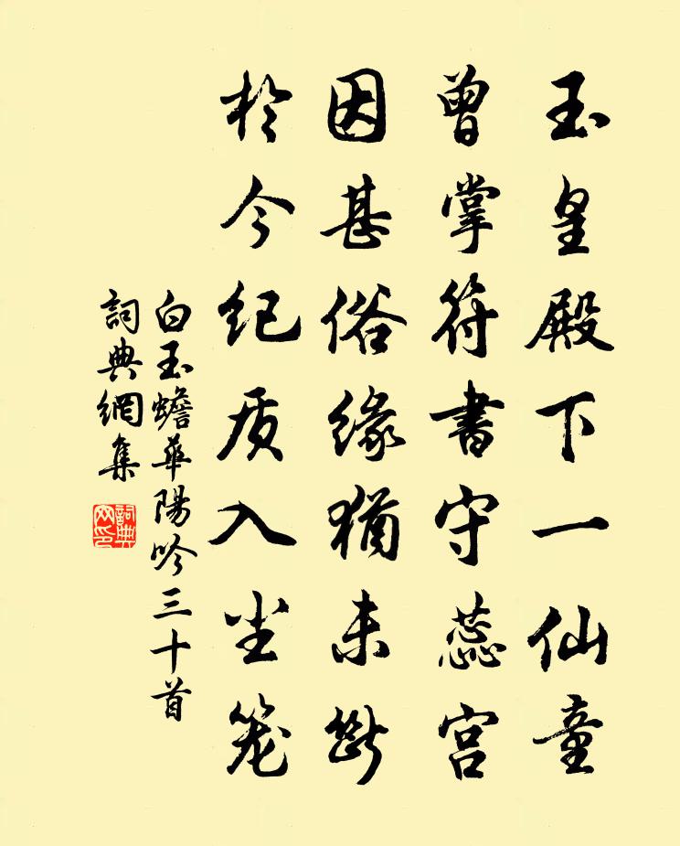 詩詞名句歷史字典書法欣賞書法字典國語詞典說文解字康熙字典古漢語字典標 題 作 者 詩 句 華陽吟三十首作者:白玉蟾 朝代:宋代華陽吟三十首原文玉皇殿下一仙童,曾掌符書守蕊宮。因甚俗緣猶未斷,於今紀質入塵籠。詩詞問答問:華陽吟三十首的作者是誰?答:白玉蟾問:華陽吟三十首寫於哪個朝代?答:宋代問:華陽吟三十首是什麼體裁?答:七絕白玉蟾華陽吟三十首書法欣賞華陽吟三十首書法作品詩詞推薦晨興陸游〔宋代〕小雨過郊墟,晨興一事無。殘榴重結蕊,新燕續生雛。書細猶能讀,行遲漸要扶。蔬畦恐蕪沒,且複課僮奴。自述陸游〔宋代〕睡美不知旦,氣衰先覺秋。有時浮小艇,隨意宿滄洲。未恨名風漢,惟求拜醉侯。更須多種竹,搔首送悠悠。浣溪沙劉辰翁〔宋代〕暮暮相望夕甫諧。針樓巧巧似身材。下頭無數老人媒。昨夜竹林那得見,朝來乾鵲是空回。人間五日後能來。絕句游開〔宋代〕黃陵廟前湘水春,春煙愁殺渡湘人。人隨歸雁去無跡,水遠山長歌又新。棘林釋智愚〔宋代〕海鳳飛來不敢棲,舊條新刺利如錐。茫茫出得出不得,只許拚身到者知。夫人閣四首蘇軾〔宋代〕節物荊吳舊,嬉遊禁掖閒。仙風隨畫箑,拜賜落人間。寄劉逸士尚顏〔唐代〕無愁無累者,偶向市朝游。此後乘孤艇,依前入亂流。高眠歌聖日,下釣坐清秋。道不離方寸,而能混俗求。春日田園雜興五首陳希聲〔宋代〕田園與在晚春頭,且說田蠶兩事休。榆夾雨酣新水滑,楝花風軟薄寒收。青楓蛾子摧桑月,綠轢鸝鶊報麥秋。但顧雪沈說〔宋代〕凍項縮如龜,茅檐諷雪詩。冷於初下日,好是未消時。樹重高枝折,窗明晚色遲。忽思溪上路,擬借蹇驢騎。留題太平寺強至〔宋代〕鄉落少人煙,精廬獨巋然。香花真佛界,棟宇始唐年。鳥啄齋餘食,僧參夜半禪。清涼數畝地,已是隔塵緣。憶江南王安石〔宋代〕城南城北萬株花,池面冰消水見沙。回首江南春更好,夢為蝴蝶亦還家。田鶴司空曙〔唐代〕散下渚田中,隱見菰蒲里。哀鳴自相應,欲作凌風起。水調歌頭夏元鼎〔宋代〕盡性之道。願方為世唾棄,曷能明子貢不傳之旨。荷來誠既切,竟以誕聖於北方壬癸之位,為水調一詞以謝,並呈偶書淨信院壁強至〔宋代〕繫舟曾訪遠公廬,游屐重來一紀餘。惟有湖山如往日,懶將前事問禽魚。嚴塘經亂書事鄭啟〔唐代〕塵生宮闕霧濛濛,萬騎龍飛幸蜀中。在野傅岩君不夢,乘軒衛懿鶴何功?雖知四海同盟久,未合中原武備空。星落偈頌一百零二首釋紹曇〔宋代〕頭上漫漫,腳上漫漫。拈掇不得,地闊天寬,老僧住持事繁。效趙學士體成口號十章獻開府太師司馬光〔宋代〕都人共喜太師回,比戶爭迎不得催。正值土樓灘水淺,大家出手挽船來。歲暮書事十二首張耒〔宋代〕牛羊已歸去,殘照滿山陂。霜雁田中靜,風鳶木杪悲。川原今自若,龍虎昔交馳。丘隴耕桑盡,千年不復知。和文與可洋州園亭三十詠其二十二菡萏軒蘇轍〔宋代〕開花濁水中,抱性一何潔。朱檻月明時,清香為誰發。病中寄武公望二首廖行之〔宋代〕四十餘年尚轉蓬,渠論南北與西東。但知愛子三遷教,不辦謀生一畝宮。北海可憐真意廣,步兵良苦漫途窮。人生名句推薦玉輪碾平芳草,半面惱紅妝。陳子龍《訴衷情·春遊》 遠牧牛,繞村四面禾黍稠。李涉《牧童詞》 青溪水,流得到紅橋。張景祁《小重山·幾點疏雅謄柳條》 外亂而內整,示飢而實飽,內精而外鈍。姜子牙《六韜·文韜·兵道》 燈前目力雖非昔,猶課蠅頭二萬言。陸游《讀書》 湖清霜鏡曉,濤白雪山來。李白《送友人尋越中山水》 靡蕪盈手泣斜暉,聞道鄰家夫婿歸。魚玄機《閨怨》 好學近乎知。力行近乎仁。知恥近乎勇。子思《中庸·第二十章》 凡兵戰之場,立屍之地,必死則生,幸生則死。吳起《吳子·治兵》 同聲相應,同氣相求。佚名《易傳·乾文言》