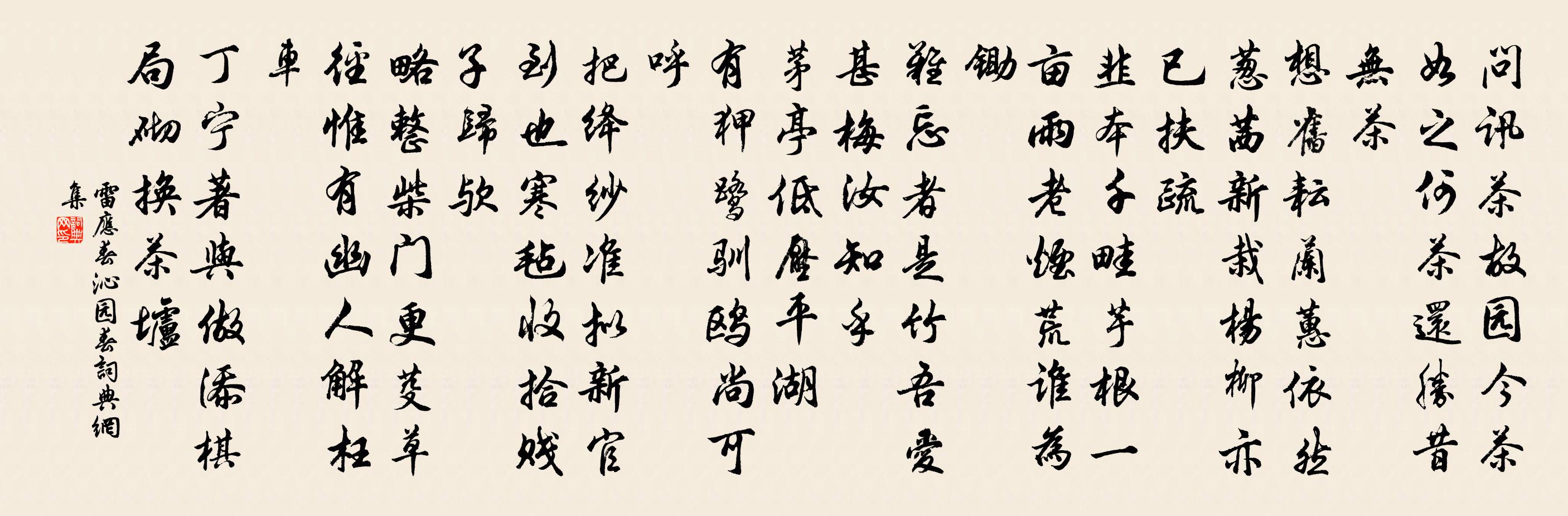 詩詞名句歷史字典書法欣賞書法字典國語詞典說文解字康熙字典古漢語字典標 題 作 者 詩 句 沁園春作者:雷應春 朝代:宋代沁園春原文問訊茶故園,今茶如之何,茶還勝昔無茶。想舊耘蘭蕙,依然蔥茜,新栽楊柳,亦已扶疏。韭本千畦,芋根一畝,雨老煙荒誰為鋤。難忘者,是竹吾愛甚,梅汝知乎。茅亭低壓平湖。有狎鷺馴鷗尚可呼。把絳紗準擬,新官到也,寒氈收拾,賤子歸歟。略整柴門,更芟草徑,惟有幽人解枉車。丁寧著,與做添棋局,砌換茶壚。詩詞問答問:沁園春的作者是誰?答:雷應春問:沁園春寫於哪個朝代?答:宋代問:沁園春是什麼體裁?答:詞雷應春沁園春書法欣賞沁園春書法作品詩詞推薦【般涉調】哨遍馬致遠〔元代〕張玉岩草書自唐晉傾亡之後,草書掃地無蹤跡。天再產玉岩翁,卓然獨立根基。甚綱紀?胸懷灑落,意氣聰明,才丙申泊東流縣黃庭堅〔宋代〕前日發大雷,真成料虎頭。今日伐鼓出,棹歌傲陽侯。滄江百折來,及此始東流。東流會賓客,建德椎羊牛。野語冬日雜興六首張耒〔宋代〕南壁蒼崖壯,窮冬井落閒。風聲先老樹,日色避諸山。落雁飢相向,啼烏夕自還。微微寒月影,蓬戶已深關。乞桃竹於令尹王洋〔宋代〕小結幽棲事靜便,為無花竹不成村。在群佰里鳴弦地,成我一方濯錦園。按鼓威名知破膽,乞花詩句是招魂。桃溪文約既行復作此送之李流謙〔宋代〕登山臨水遠送君,征鴻掠天不堪聞。臨岐握手惜此別,車已載脂仆在門。驪歌未殘心欲動,剪燭夜談如昨夢。茂林黃朝散輓詩朱長文〔唐代〕江湖嘗佩左符歸,一臥漳濱素願違。平日華旌過里巷,此時丹旐下岩扉。群峰拱揖開新穴,萬木森羅條舊圍。佇看立春日山行汪莘〔宋代〕遠山殘雪獻年華,翠黛千層蹙浪花。天上畫屏描不得,懶移皮屐下鄰家。奉答固道黃庭堅〔宋代〕平生湖海魚竿手,強學來操制錦刀。末俗相看終眼白,古人不見想山高。未乘春水歸行李,儻得閒官去坐曹。自是終南別業 / 初至山中 / 入山寄城中故人王維〔唐代〕中歲頗好道,晚家南山陲。興來每獨往,勝事空自知。行到水窮處,坐看雲起時。偶然值林叟,談笑無還期。題程修己竹障李昂〔唐代〕良工運精思,巧極似有神。臨窗忽睹繁陰合,再盼真假殊未分。林可山至葉茵〔宋代〕梅花山底伴雲閒,謾逐閒雲出故山。君慰我思君莫去,一時先遣白雲還。偈頌一百零四首釋紹曇〔宋代〕無憂樹下風如箭,九龍吐出水含毒。涓滴沾身痛入心。霎時吹面刀剜肉。不知悉達為何歷,才出母罹此酷。後代兒金陵覽古段石岡朱存〔唐代〕孫吳紀德舊刊碑,草沒蟠螭與伏龜。惆悵岡頭三段石,至今猶似鼎分時。郊廟歌辭享太廟樂章保大舞郭子儀〔唐代〕於穆文考,聖神昭章。肅勺群慝,含光遠方。萬物茂遂,九夷賓王。愔愔雲韶,德音不忘。舟中蘇泂〔宋代〕小睡醒來欲二更,村深那聽鼓鐘聲。舟中反覆無窮事,只道寒天不會明。復用前韻李彌遜〔宋代〕急雨殘紅絕可憐,花如雞肋雨如拳。千金儻贖花枝怨,不為囊空惜一錢。焦仲卿妻楊維楨〔元代〕生為仲卿婦,死與仲卿齊。廬江同樹鳥,不過別枝啼。農謠釋文珦〔宋代〕斗種播良田,可收三十石。天予人奪之,耕夫每無食。奉酬致宏贈別張嵲〔宋代〕此生將老竟何為,未信全關造物兒。十載宦遊無我拙,一生懷抱有君知。天邊故國人空老,江畔黃花誰與期。跨馬東城被盜得世字秦觀〔宋代〕野人無機心,觸事少防衛。所至輒酣寢,屢墮穿窬計。孤亭夜深墨,風死雨初霽。有盜穴壁來,攘取逮衾袂。微思名句推薦慟哭六軍俱縞素,衝冠一怒為紅顏。吳偉業《圓圓曲》 長安故人別後,料征鴻聲里,畫闌憑偏。王月山《齊天樂·夜來疏雨鳴金井》 西園何限相思樹,辛苦梅花候海棠。元好問《鷓鴣天·候館燈昏雨送涼》 枕前淚共階前雨,隔個窗兒滴到明。聶勝瓊《鷓鴣天·別情》 隱隱飛橋隔野煙,石磯西畔問漁船。張旭《桃花溪》 東風靜、細柳垂金縷。万俟詠《三台·清明應制》 快上西樓,怕天放、浮雲遮月。辛棄疾《滿江紅·中秋寄遠》 更無柳絮因風起,惟有葵花向日傾。司馬光《客中初夏》 洊雷,震;君子以恐懼修省。佚名《易傳·象傳下·震》 送子軍中飲,家書醉里題。岑參《磧西頭送李判官入京》