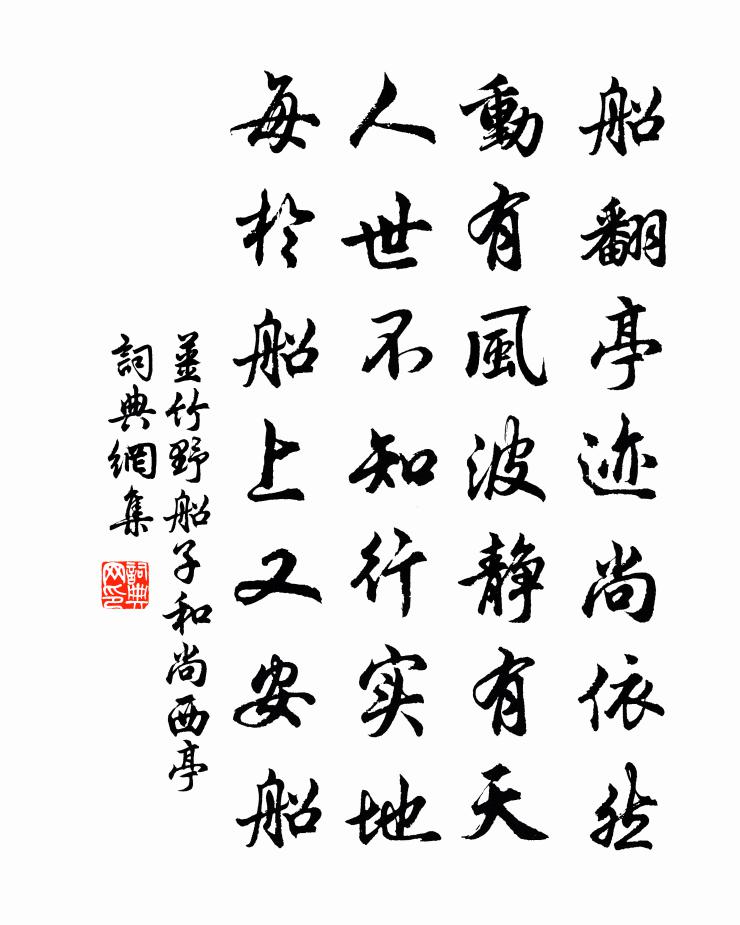 詩詞名句歷史字典書法欣賞書法字典國語詞典說文解字康熙字典古漢語字典標 題 作 者 詩 句 船子和尚西亭作者:姜竹野 朝代:宋代船子和尚西亭原文船翻亭跡尚依然,動有風波靜有天。人世不知行實地,每於船上又安船。詩詞問答問:船子和尚西亭的作者是誰?答:姜竹野問:船子和尚西亭寫於哪個朝代?答:宋代姜竹野船子和尚西亭書法欣賞船子和尚西亭書法作品詩詞推薦中秋月錢選〔宋代〕皎皎天邊白玉盤,年年此夕帶愁看。松枝積翠欺人老,桂影浮香入鬢寒。常記醉來多謬誤,又逢秋至輒悲酸。疏桐感春雜言歐陽修〔宋代〕鳩鳴兮屋上,雀噪兮檐間。百鳥感春陽,有如動機關。雄雌相呼和,日夕聒聒不得閒。砌下兩株樹,枯條有誰攀。湖西雜感詩釋智圓〔宋代〕福善禍淫言可信,吉凶由己語堪陳。乖仁背義都無恥,只記臨行揀日辰。句馮介〔宋代〕坐上擊甌清似玉,檻前流水碧如藍。宮詞王珪〔唐代〕萱草成窠杏子青,夜間禁漏曉聞鶯。吹回一覺照陽夢,賬外春風太薄情。端平二年端午帖子詞貴妃閣洪咨夔〔宋代〕佩襲芳蘭碧,釵明寶篆紅。深宮三十六,同被二南風。游黃山謝鳳〔宋代〕歷覽岧嶢接鬥牛,岩排雲樹翠陰稠。風生藥臼清香遠,日照丹岩紫氣浮。仙樂有聲聞晝夜,靈泉無火沸春秋。猶多幽誓范成大〔宋代〕天風厲兮山木黃,歲晼晚兮又早霜。虎號崖兮石飛下,山中人兮孰虞。予造軔兮挾輈,紛不可兮此淹留。靈曄兮遄夜琴白居易〔唐代〕蜀桐木性實,楚絲音韻清。調慢彈且緩,夜深十數聲。入耳淡無味,愜心潛有情。自弄還自罷,亦不要人聽。潭州席上贈舞柘枝妓殷堯藩〔唐代〕姑蘇太守青娥女,流落長沙舞柘枝。坐滿繡衣皆不識,可憐紅臉淚雙垂。藍田溪雜詠二十二首田鶴錢起〔唐代〕田鶴望碧霄,舞風亦自舉。單飛後片雪,早晚及前侶。林園即事寄舍弟紞(次荊州時作)王維〔唐代〕寓目一蕭散,銷憂冀俄頃。青草肅澄陂,白雲移翠嶺。後沔通河渭,前山包鄢郢。松含風裡聲,花對池中影。地多縉叔以詩遺酒次其韻梅堯臣〔宋代〕君嘗謂我性嗜酒,又復謂我耽於詩。一日不飲情頗惡,一日不吟無所為。酒能銷憂忘富貴,詩欲主盟張鼓旗。百觚陳學正惠詩酬以長句陳造〔宋代〕寒風折人粟生膚,局坐掩戶孰與娛。吾宗高義駕為迂,新詩爛粲慰槁枯。一百十二驪龍珠,春意誰遣生座隅。吾宗洞仙歌(游大滌賦)佚名〔宋代〕花泥絮浪,春懷如酒。書卷爐熏夢清晝。喚玉京穩攜手鬆喬,飛光里,笑傲白雲林岫。仙人猶狡獪,酒雪吹冰,聲靧櫛張鎡〔宋代〕澡灌新宜白氈巾,睡余臞面滌昏塵。三薰衣潤乘沉麝,一沃湯柔和芷辛。衰發任從清鏡脫,壯心不逐故書陳。清平長沙留別黃庭堅〔宋代〕折腳鐺中同淡粥,曲腰桑下把離杯。知君不是南遷客,魑魅無情須早回。江上晚眺董嗣杲〔宋代〕江北西風高,江南新酒熟。長笛吹梅花,月色滿營屋。鵲橋仙(送路勉道赴長樂)趙彥端〔宋代〕留花翠幕,添香紅袖,常恨情長春淺。南風吹酒玉虹翻,便忍聽、離弦聲斷。乘鸞寶扇,凌波微步,好在清池涼館江郎山和韻辛棄疾〔宋代〕三峰一一青如削,卓立千尋不可乾。正直相扶無倚傍,撐持天地與人看。名句推薦東風隨春歸,發我枝上花。李白《落日憶山中》 離恨又迎春,相思難重陳。和凝《菩薩蠻·越梅半拆輕寒里》 初驚河漢落,半灑雲天裡。李白《望廬山瀑布水二首》 葉潤林塘密,衣乾枕席清。杜甫《水檻遣心二首》 願得此身長報國,何鬚生入玉門關。戴叔倫《塞上曲二首·其二》 善之生如春,惡之死如秋,故民勸極力而樂盡情,此之謂上下相得。韓非及後人《韓非子·守道》 千步虹橋,參差雁齒,直趨水殿。柳永《破陣樂·露花倒影》 文章是山水化境,富貴乃煙雲幻形。王永彬《圍爐夜話·第一二二則》 大膽天下去得,小心寸步難行。馮夢龍《警世通言·卷二十一》 君子戒慎乎其所不睹,恐懼乎其所不聞。莫見乎隱,莫顯乎微,故君子慎其獨也。子思《禮記·中庸》