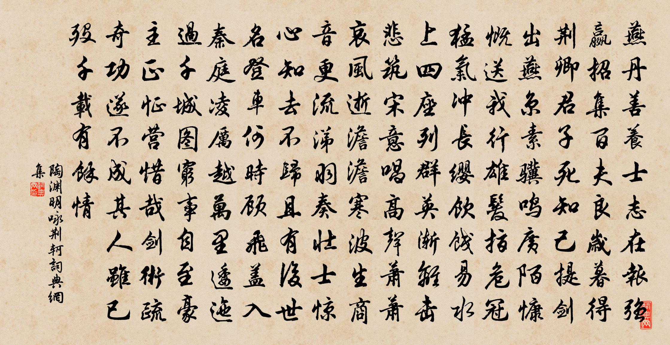 發思古之幽情,是為了現實。不過這“現實”亦不宜說得過窄過死(如一些論者所言,這首詩是詩人出於“忠晉報宋”而作),為什麼呢?首先,因為陶淵明反覆地說過:“少時壯且厲,撫劍獨行游。誰言行游近,張掖至幽州”(《擬古》之八);“憶我少壯時,無樂自欣豫。猛志逸四海,騫翮思遠翥”(《雜詩》之五)。這使我們看到在作者的生活、志趣和性格中,也早已具有著豪放、俠義的色彩。其次,詩人也曾出仕於晉,不過他說這是“誤落塵網中,一去十三年”(《歸田園居五首》),悔恨之情溢於言表,足見“晉”也並不是他的理想王國,當然“宋”亦如此。這些都是我們不必將《詠荊軻》的作意膠柱於“忠晉報宋”的理由。詩人一生“猛志”不衰,疾惡除暴、捨身濟世之心常在,詩中的荊軻也正是這種精神和理想的藝術折光。說得簡單一點,便是借歷史之舊事,抒自己之愛憎,這樣看是比較接近詩人心跡的吧。是的,這首詩的影響也正在此,此亦有詩為證:“陶潛詩喜說荊軻,想見《停雲》發浩歌。吟到恩仇心事涌,江湖俠骨恐無多。”(龔自珍《己亥雜詩》) (趙其鈞)