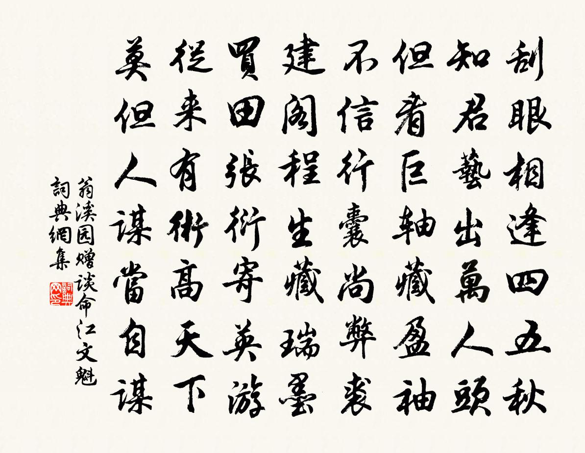 詩詞名句歷史字典書法欣賞書法字典國語詞典說文解字康熙字典古漢語字典標 題 作 者 詩 句 贈談命江文魁作者:翁溪園 朝代:宋代贈談命江文魁原文刮眼相逢四五秋,知君藝出萬人頭。但看巨軸藏盈袖,不信行囊尚弊裘。建閣程生藏瑞墨,買田張衍寄英游。從來有術高天下,莫但人謀當自謀。詩詞問答問:贈談命江文魁的作者是誰?答:翁溪園問:贈談命江文魁寫於哪個朝代?答:宋代翁溪園贈談命江文魁書法欣賞贈談命江文魁書法作品詩詞推薦送趙東閣罷官歸永嘉釋文珦〔宋代〕一年吟抱寄京華,幾度相逢說永嘉。夢入西山尋枸杞,約歸東閣看梅花。風霜推拉知何事,雨露生成自有涯。應笑無題陳造〔宋代〕多譽庸非蠲忿草,一謙良是辟兵符。先生謦欬忘雞口,俗子過逢動虎鬚。妙湛大師求頌釋正覺〔宋代〕妙則不粗,湛則不渾。妙湛而照,瑩然亡痕。雲山是主,水月無根。瘦坐一默,虛融六門。竅作風籟,華含春恩。和答潘端叔見寄孫應時〔宋代〕發白念少年,萬事風雨過。倦遊得來歸,一切付懶惰。獨抱杞天憂,傍徨意無奈。濠魚定何樂,幕燕渠敢賀。嘆君久雨三首曹勛〔宋代〕蝕余仍苦雨,猶爾晦陽暉。浩浩陂三尺,家家水半扉。汩陳非佛意,昏墊蓋天機。祈懇須冥造,當仁要達微。新建慈天錫莊請贊釋智愚〔宋代〕不期而會,不約而同。晴光爍爍,和氣融融。際遇兩朝聖主,中興徽廟禪叢。良田天錫平如砥,坐對靈苗歲歲豐。和淨因老師漁父詞釋子淳〔宋代〕洪鱗每自藏深派,今朝釣得真奇怪。鼓棹驚波桑田改,三災壞,恁時方稱生涯在。秋波媚·七月十六日晚登高興亭望長安南山陸游〔宋代〕秋到邊城角聲哀,烽火照高台。悲歌擊築,憑高酹酒,此興悠哉。多情誰似南山月,特地暮雲開。灞橋煙柳,曲江聽山中談虎賦二章黎廷瑞〔宋代〕東村西村稼如雲,欲穫未穫黃紛紛。鼠牙雀喙不可算,奈此野彘千百群。田頭結舍坐霜夜,敲犁擊杵聲相聞。五更登招寶山陳造〔宋代〕一鷲風煙上,三韓指點中。地隨山共盡,天與水無窮。夢蟻紛軒冕,騎魚可閬蓬。仙曹應拊掌,顧我簿書叢。正紀用暮春韻見貽復和三章郭印〔宋代〕燕坐群魔伏,君心自晏然。神仙真可學,道術豈無緣。健比凌雲鶴,清同飲露蟬。後天應不老,何必羨彭年。贈達齋術士二首姚勉〔宋代〕昔年瓮牖讀書詩,誰許蟾宮第一枝。今日誤恩才入手,便來爭說鳳凰池。端午夫人閣羅公升〔宋代〕黃金角黍照盤明,秋月弓灣鬥彩贏。應是君王方右武,內家仙子亦知兵。府試老人星見李頻〔唐代〕良宵出戶庭,極目向青冥。海內逢康日,天邊見壽星。臨空遙的的,竟曉獨熒熒。春後先依景,秋來忽近丁。垂休重遊雁山分得六題龍鼻水薛嵎〔宋代〕怪極生真想,飢凶禱請勤。半身鱗甲具,一勺渺瀰分。應谷聲如鬼,飛空石礙雲。精誠隨寓在,亦以感通聞。讀淵明詩陸游〔宋代〕淵明甫六十,遽覺前途迮,作詩頗感慨,自謂當去客。吾年久過此,霜雪紛滿幘,豈惟仆整駕,已迫牛負軛。奈何送臥雲道士(一作魚又玄,題雲題柳公權書度人經後)虞有賢〔唐代〕臥雲道士來相辭,相辭倏忽何所之。紫閣春深煙靄靄,東風花柳折枝枝。藥成酒熟有時節,寒食恐失松間期。冥鴻感皇恩毛滂〔宋代〕兩歲撫邦人,曾無恩意。別後何人更相記。題輿玉樹,愧與蒹葭相倚。殷勤猶念我,同吟醉。畫舸相追,孤城已閉西江月侯善淵〔元代〕杖上一瓢春醞,匣中三尺**。眉間寶鑑鎮妖邪。坐守更深半夜。金鼎燒成白雪,玉爐煉就黃芽。丹光瀲灩泛瓊華【十二月】 正月佚名〔元代〕年時節,元夜時,雲鬢插小桃枝。今年早,不見你,淚珠兒,滴滿了春衫袖兒。 二月 踏青去,二月時,則不名句推薦東武望餘杭,雲海天涯兩渺茫。蘇軾《南鄉子·和楊元素時移守密州》 寒禽與衰草,處處伴愁顏。司空曙《賊平後送人北歸》 無執滯心,才是通方士;有做作氣,便非本色人。王永彬《圍爐夜話·第八六則》 泰山嵯峨夏雲在,疑是白波漲東海。李白《早秋單父南樓酬竇公衡》 兩處春光同日盡,居人思客客思家。白居易《望驛台》 菊花信待重陽久,桂子香聞上界留。慧霖《閏中秋玩月》 榆柳蕭疏樓閣閒,月明直見嵩山雪。孟郊《洛橋晚望》 慊慊思歸戀故鄉,君為淹留寄他方。曹丕《燕歌行》 一年之計在於春,一日之計在於寅。佚名《增廣賢文·上集》 水波而上,盡其搖而復下,其勢固然者也。管仲《管子·君臣下》