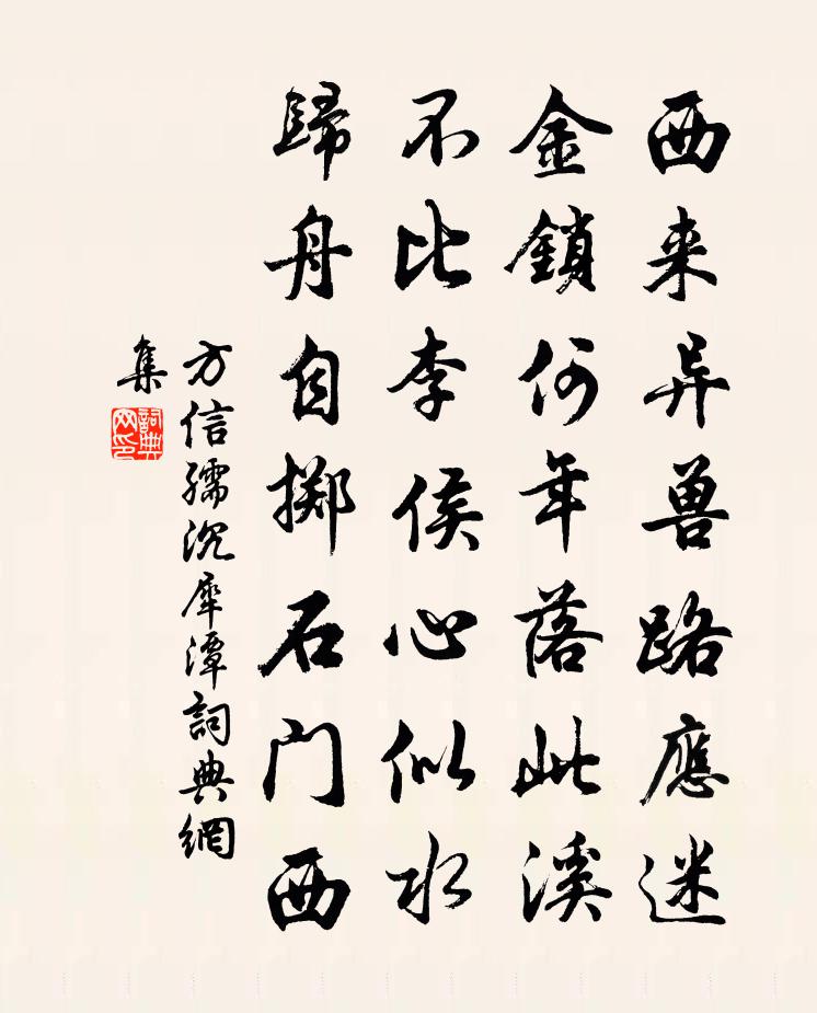 詩詞名句歷史字典書法欣賞書法字典國語詞典說文解字康熙字典古漢語字典標 題 作 者 詩 句 沉犀潭作者:方信孺 朝代:宋代沉犀潭原文西來異獸路應迷,金鎖何年落此溪。不比李侯心似水,歸舟自擲石門西。詩詞問答問:沉犀潭的作者是誰?答:方信孺問:沉犀潭寫於哪個朝代?答:宋代方信孺沉犀潭書法欣賞沉犀潭書法作品詩詞推薦鷓鴣天·鎮日無心掃黛眉夏竦〔宋代〕鎮日無心掃黛眉。臨行愁見理征衣。尊前只恐傷郎意,閣淚汪汪不敢垂。停寶馬,捧瑤卮。相斟相勸忍分離。不如春日雜興方岳〔宋代〕沖雨沖泥處處行,物情殊不可詩情。牡丹又是一年過,春事略無三日晴。先後筍爭滕薛長,東西鷗背晉齊盟。山居正仲思歸作篆畦今夜月十詩非篆畦月乃雁蒼月舒岳祥〔宋代〕篆畦今夜月,有待到三更。水鳥隔煙叫,山樵踏雪行。詩成嫌燭短,酒渴愛菹清。此際誰為伴,梅邊送影橫。來闍黎新亭作孟浩然〔唐代〕八解禪林秀,三明給苑才。地偏香界遠,心淨水亭開。傍險山查立,尋幽石逕回。瑞花長自下,靈藥豈須栽。碧網山下宿白居易〔唐代〕獨到山下宿,靜向月中行。何處水邊碓,夜舂雲母聲。景安和章來再次韻謝設醴四首陳造〔宋代〕道裝人映醉中姝,十二分行儼翠裾。遙想翻階麗清禁,似今群艷簉庭除。贈李十五丈別(李秘書文嶷)杜甫〔唐代〕峽人鳥獸居,其室附層顛。下臨不測江,中有萬里船。多病紛倚薄,少留改歲年。絕域誰慰懷,開顏喜名賢。孤陋和周繇見嘲(一作和周為憲廣陽公宴見嘲詩)段成式〔唐代〕才甘魚目並,藝怯馬蹄間。王謝初飛蓋,姬姜盡下山。縛雞方角逐,射雉豈開顏。亂翠移林色,狂紅照座殷。防梭挽鄭昂叔珪母蔡夫人二首王邁〔宋代〕絳幔談經日,熊丸苦時。屢修堂上拜,親炙母中師。每羨萱堂樂,今成薤露悲。一生同令共,共泣蓼莪詩。崔十八新池白居易〔唐代〕愛君新小池,池色無人知。見底月明夜,無波風定時。忽看不似水,一泊稀琉璃。不赴宴贈丘妓白玉蟾〔宋代〕舞拍歌聲妙不同,笑攜玉斚露春蔥。梅花體態香凝雪,楊柳腰肢瘦怯風。螺髻雙鬟堆淺翠,櫻唇一點弄嬌紅。白鷗不飲酒曾鞏〔宋代〕不飲酒,不善諧,少年醒眼看花開。況從多病久衰耗,自顧白髮垂氈毸。縱遇花時少情思,經春不曾銜酒杯。布穀送琴客李昌符〔唐代〕楚客抱離思,蜀琴留恨聲。坐來新月上,聽久覺秋生。夜靜騷人語,天高別鶴鳴。因君興一嘆,竟夕意難平。送查仲文三首項安世〔宋代〕先生江海乾,使者水曹郎。開絹印三道,懷人天一方。上江春水急,穿峽晚雲長。詩酒勤陶寫,中年屬易傷。淡黃柳·空城曉角姜夔〔宋代〕客居合肥南城赤闌橋之西,巷陌淒涼,與江左異。唯柳色夾道,依依可憐。因度此闋,以紓客懷。空城曉角,吹入九里山中 其三王冕〔元代〕九里溪頭晚雨晴,松風瑟瑟水泠泠。絕無過客問奇字,只有閒雲到野亭。每笑盛名傳坎壈,豈陳虛語說零丁?老年浣溪沙(再用韻並簡二千戶)何夢桂〔宋代〕金紫山前山萬重。山高雲密下蒼龍。春來好雨遍三峰。芳草郊原眠繭犢,垂楊營壘系花驄。趣歸行有紫泥封。初夏即事寄魯望皮日休〔唐代〕夏景恬且曠,遠人疾初平。黃鳥語方熟,紫桐陰正清。廨宇有幽處,私游無定程。歸來閉雙關,亦忘枯與榮。土室和襲美初冬偶作陸龜蒙〔唐代〕桐下空階疊綠錢,貂裘初綻擁高眠。小爐低幌還遮掩,酒滴灰香似去年。小舟過吳江風雨大作夜泊三家村翌日風回到家孫應時〔宋代〕短篷僅容坐,一滴不通雨。不料西南風,滂沛遽如許。盪搖首屢觴,跧彎背欲僂。筆經四橋側,心動不敢語。茫洋名句推薦多少天涯未歸客,盡借籬落看秋風。唐寅《菊花》 北斗七星高,哥舒夜帶刀。西鄙人《哥舒歌》 輕寒細雨情何限。不道春難管。秦觀《虞美人·碧桃天上栽和露》 若要俏,添重孝。馮夢龍《警世通言·卷三十五》 江帆幾片疾如箭,山泉千尺飛如電周德清《塞鴻秋·潯陽即景》 牛靿咤咤,田確確,旱塊敲牛蹄趵趵。元稹《田家詞 / 田家行》 愛敬盡於事親,而德教加於百姓,刑於四海孔子及其弟子《孝經·天子》 卻是有,年年塞雁,歸來曾見開時。晁沖之《漢宮春·梅》 燕子欲歸時節,高樓昨夜西風。晏殊《破陣子·燕子欲歸時節》 天門中斷楚江開,碧水東流至此回。李白《望天門山》