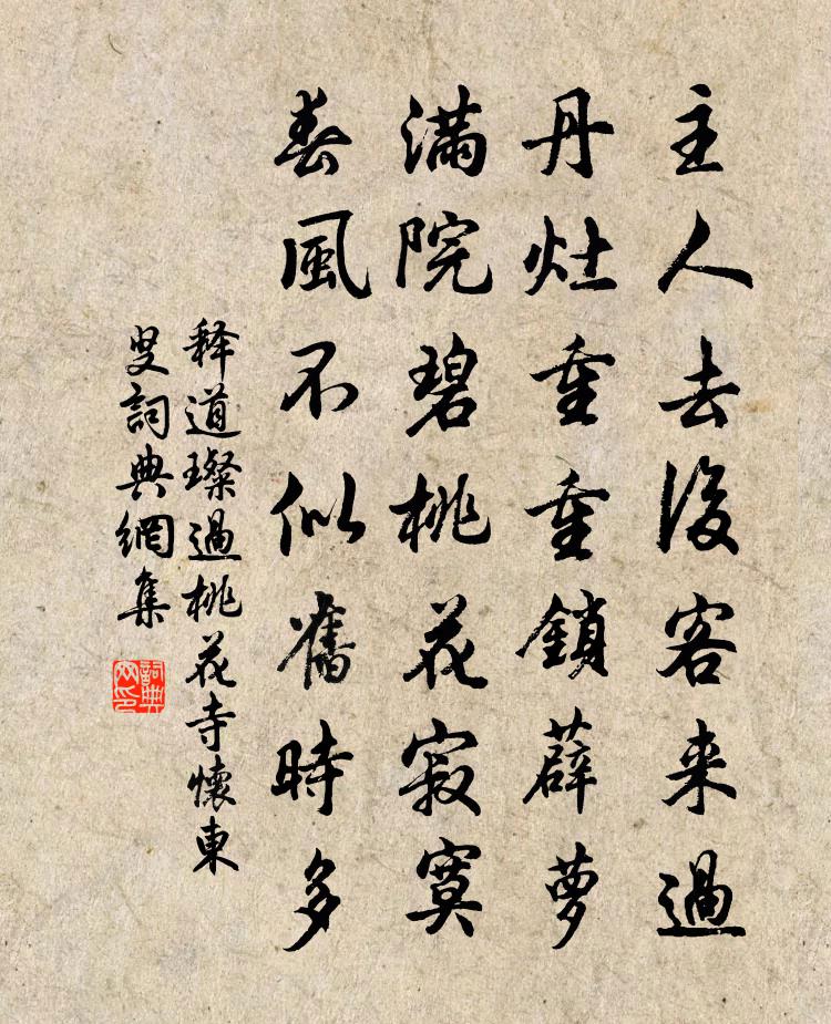 詩詞名句歷史字典書法欣賞書法字典國語詞典說文解字康熙字典古漢語字典標 題 作 者 詩 句 過桃花寺懷東叟作者:釋道璨 朝代:宋代過桃花寺懷東叟原文主人去後客來過,丹灶重重鎖薜蘿。滿院碧桃花寂寞,春風不似舊時多。詩詞問答問:過桃花寺懷東叟的作者是誰?答:釋道璨問:過桃花寺懷東叟寫於哪個朝代?答:宋代釋道璨過桃花寺懷東叟書法欣賞過桃花寺懷東叟書法作品詩詞推薦小亭閒止李曾伯〔宋代〕草草家林適,時時步屐過。跨流通略彴,枕岸擬{牧去攵加羊}牱。牆外千竿竹,亭陰數畝荷。年豐遂閒止,老境琅邪王歌佚名〔宋代〕新買五尺刀,懸著中樑柱。一日三摩娑,劇於十五女。鼓吹曲辭·芳樹沈佺期〔唐代〕何地早芳菲,宛在長門殿。夭桃色若綬,穠李光如練。啼鳥弄花疏,游蜂飲香遍。嘆息春風起,飄零君不見。元忠學士八兄耒離京師遠蒙追送許惠服丹法托張耒〔宋代〕無復顛狂似少時,逢君猶自說蛾眉。玉堂舊事君休念,兩袖啼痕又送誰。贈李頎王維〔唐代〕聞君餌丹砂。甚有好顏色。不知從今去。幾時生羽翼。王母翳華芝。望爾崑崙側。文螭從赤豹。萬里方一息。悲哉懷素上人草書歌任華〔唐代〕吾嘗好奇,古來草聖無不知。豈不知右軍與獻之,雖有壯麗之骨,恨無狂逸之姿。中間張長史,獨放蕩而不羈,以蛺蝶二首姜特立〔宋代〕水上蜻蜓木上蟬,醯雞飛舞瓮中天。如何爾獨多情思,結得千花百卉緣。雜曲歌辭·傷歌行莊南傑〔唐代〕兔走烏飛不相見,人事依稀速如電。王母夭桃一度開,玉樓紅粉千回變。車馳馬走鹹陽道,石家舊宅空荒草。秋雨答謝法曹劉克莊〔宋代〕二詩簡澹掃穠華,作者幾無以復加。璧十五城方定價,桃三千歲一開花。選騷意度卑唐體,晉宋文章讓謝家。莫道謫嶺南道中作李德裕〔唐代〕嶺水爭分路轉迷,桄榔椰葉暗蠻溪。愁沖毒霧逢蛇草,畏落沙蟲避燕泥。五月畬田收火米,三更津吏報潮雞。不堪歸鄉二首姜特立〔宋代〕憶昔東坡老,曾吟陌上花。我今歸故里,卉木正光華。韓同年新居餞韓西迎家室戲贈李商隱〔唐代〕籍籍征西萬戶侯,新緣貴婿起朱樓。一名我漫居先甲,千騎君翻在上頭。雲路招邀回彩鳳,天河迢遞笑牽牛。南朝贈林行簡見徐徑坂趙汝騰〔宋代〕紫霞洲上雨如絲,白髮衰翁有所思。吟付三山林敬則,爛柯國手尚觀棋。夜過盤石,隔河望永樂,寄閨中,效齊梁體岑參〔唐代〕盈盈一水隔,寂寂二更初。波上思羅襪,魚邊憶素書。月如眉已畫,雲似鬢新梳。春物知人意,桃花笑索居。螺江廟陳誼〔宋代〕廟裡杉松蕭颯風,廟前江水碧溶溶。憑闌不見當時事,落日遠山千萬重。緣識宋太宗〔宋代〕是非人我利名心,情偽言同海似深。浩渺無涯成理性,無為志大可勝任。千年歲月週遊在,萬卷詩書不易尋。世界賦秋鴻送劉衡州梅堯臣〔宋代〕秋鴻整羽翮,去就自因時。往春南方來,遂止天泉池。天泉水清泚,鴛鷺日追隨。蒲藻豈不樂,江湖信所宜。今朝送任尊師歸蜀覲親姚合〔唐代〕白雲修道者,歸去春風前。玉簡通仙籍,金丹駐母年。錦文江一色,酒氣雨相連。眾說君平死,真師易義全。再贈周國祥言相方回〔宋代〕紛紛世上少全人,鶴睫分光照始真。李相頭顱君莫笑,神仙猶現羽禽身。長沙開元寺昔與故長林許侍御題松竹聯句李群玉〔唐代〕牆陰數行字,懷舊慘傷情。薜荔侵年月,莓苔壓姓名。逝川前後水,浮世短長生。獨立秋風暮,凝顰隔郢城。名句推薦黃河之水天上來,奔流到海不復回。李白《將進酒》 禍褔無不自己求之者。孟子《孟子·公孫丑章句上·第四節》 清明過了,不堪回首,雲鎖朱樓。朱淑真《眼兒媚·風日遲遲弄輕柔》 飛雪過江來,船在赤欄橋側。呂渭老《好事近·飛雪過江來》 寒笛對京口,故人在襄陽。劉昚虛《暮秋揚子江寄孟浩然》 暗相思,無處說,惆悵夜來煙月。韋莊《應天長·別來半歲音書絕》 君子成人之美,不成人之惡;小人反是。孔子弟子《論語·顏淵篇》 菀菀黃柳絲,濛濛雜花垂。常建《春詞二首》 黃鳥翩翩楊柳垂,春風送客使人悲。高適《東平別前衛縣李寀少府 / 送前衛縣李宷少府》 風吹古木晴天雨,月照平沙夏夜霜。白居易《江樓夕望招客》