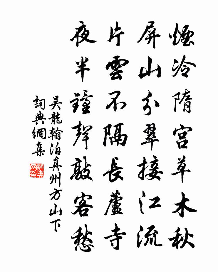 詩詞名句歷史字典書法欣賞書法字典國語詞典說文解字康熙字典古漢語字典標 題 作 者 詩 句 泊真州方山下作者:吳龍翰 朝代:宋代泊真州方山下原文煙冷隋宮草木秋,屏山分翠接江流。片雲不隔長蘆寺,夜半鐘聲敲客愁。詩詞問答問:泊真州方山下的作者是誰?答:吳龍翰問:泊真州方山下寫於哪個朝代?答:宋代吳龍翰泊真州方山下書法欣賞泊真州方山下書法作品詩詞推薦殘花胡宿〔唐代〕雨壓殘紅一夜凋,曉來簾外正飄搖。數枝翠葉空相對,萬片香魂不可招。長樂夢回春寂寂,武陵人去水迢迢。愁將玄元觀尋李先生不遇魏知古〔唐代〕羽客今何在,空尋伊洛間。忽聞歸苦縣,復想入函關。未作千年別,猶應七日還。神仙不可見,寂寞返蓬山。第九觀棋陸游〔宋代〕一枰翻覆戰枯棋,慶弔相尋喜復悲。失馬翁言良可信,牧豬奴戲未妨為。白蛇斷處真成快,黑幟空時又一奇。歛付病中止酒楊萬里〔宋代〕平生萬事輕,惟以酒自娛。當其愛酒時,一日不可無。老來因屬疾,不飲五月余。客飲我不羨,而況逢麴車。見杯韓魏公生日強至〔宋代〕勛名一代俱稱首,將相三朝愈飭躬。雅意自安台鼎外,群生長願化鈞中。破除白髮留賓醉,收拾黃金濟士窮。舊鄴同表甥趙康游種范李氏晁說之〔宋代〕百態范氏石,千尋種氏木。灌以邠李水,禽鳥識故國。使我從今去,魂夢常不足。化成院陸游〔宋代〕翠圍至化成,七里幾千盤,肩輿掀濘淖,嘆息行路難。緣坡忽入谷,蜒蜿蒼龍蟠。孤塔插空起,雙柟當夏寒。飛屐齊天樂(庚戈元夕都下遇趙立之)佚名〔宋代〕倦去休雨風還作,交相醒花蘇柳。字滿吟灰,痕添坐席,贏得新愁痴守。歸期未有。負小院移蘭,故園嘗韭。謾道偈頌二百零五首釋正覺〔宋代〕世夢短,劫壺寬,底人退步裡頭看。豹變文而霧重,龍不臥而潭寒。欲使人人雙眼冷,要須先瀝髑髏乾。題陸鴻漸上饒新開山舍孟郊〔唐代〕驚彼武陵狀,移歸此岩邊。開亭擬貯雲,鑿石先得泉。嘯竹引清吹,吟花成新篇。乃知高潔情,擺落區中緣。高帝徐鈞〔宋代〕土能生物有深功,金價何如可與同。不是君王無識別,只緣得土笑談中。寓擁葉精舍顧逢〔宋代〕禪房靜掩扃,長日勘傳燈。身健高飛鶴,心空入定僧。炭煙生濕癭,檐水滴晴冰。從此無依戀,相隨只瘦藤。送春吳錫疇〔宋代〕新綠迴環暗竹扉,靜中物物總天機。啼鶯戲蝶渾如舊,莫是春風尚未歸。夢中作四首曹勛〔宋代〕八景雲輿駕六龍,東方常御太和風。簫笳冉冉升黃道,冠劍重重拜木公。好事近朱敦儒〔宋代〕綠泛一甌雲,留住欲飛胡蝶。相對夜深花下,洗蕭蕭風月。從容言笑醉還醒,爭忍便輕別。只願主人留客,更重斟寒食日重遊李氏園(一作林)亭有懷韓偓〔唐代〕往年同在鸞橋上,見倚朱闌詠柳綿。今日獨來香徑里,更無人跡有苔錢。傷心闊別三千里,屈指思量四五年。料得送劉學士守衡陽兼還故里宋祁〔宋代〕名帖唐家十二時,囊封自乞阮鹹麾。三行牛酒過鄉墅,九向雲山駐使旗。蘭露夕薰歡潔膳,桂風秋遣怨叢枝。不應童子求頌釋師觀〔宋代〕山童山童,叉手當胸。高低普應,常在其中。任伯顯昨寄日柹不至續以膽瓶為貺劉子翬〔宋代〕石瀨分攜常慘慘,尺書沓至中彌感。槁柹不呈嫫母面,圓壺俄落雄兒膽。南窗吾伊俱不勤。汲泉養化聊任真。枝頭題僧子溫畫水墨蒲萄周弼〔宋代〕裊裊多應半熟時,落斜高掛冷攢枝。分明記得山窗下,一架寒藤帶雨垂。名句推薦佳節又重陽,玉枕紗廚,半夜涼初透。李清照《醉花陰·薄霧濃雲愁永晝》 好雨知時節,當春乃發生。杜甫《春夜喜雨》 每圓處即良宵,甚此夕偏饒,對歌臨怨。吳文英《玉漏遲·瓜涇度中秋夕賦》 袨服華妝著處逢,六街燈火鬧兒童。元好問《京都元夕》 江上旗亭,送君還是逢君處吳大有《點絳唇·送李琴泉》 胭脂雪瘦熏沉水,翡翠盤高走夜光。蔡松年《鷓鴣天·賞荷》 雨里雞鳴一兩家,竹溪村路板橋斜。王建《雨過山村》 多讀兩句書,少說一句話,讀得兩行書,說得幾句話。陳繼儒《小窗幽記·集醒篇》 茶性儉,不宜廣,廣則其味黯澹。陸羽《茶經·五之煮》 玉顏憔悴三年,誰復商量管弦。王建《宮中調笑·團扇》