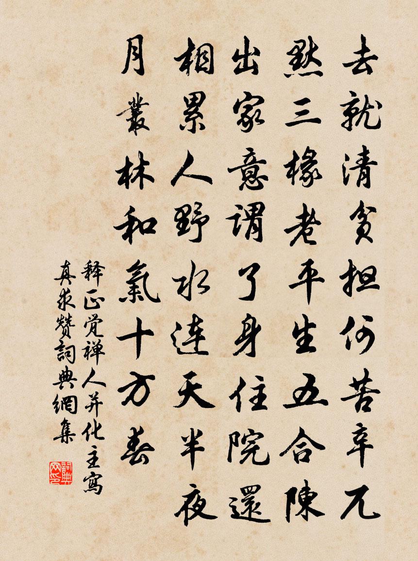 詩詞名句歷史字典書法欣賞書法字典國語詞典說文解字康熙字典古漢語字典標 題 作 者 詩 句 禪人並化主寫真求贊作者:釋正覺 朝代:宋代禪人並化主寫真求贊原文去就清貧,擔何苦辛。兀默三椽老,平生五合陳。出家意謂了身,住院還相累人。野水連天半夜月,叢林和氣十方春。詩詞問答問:禪人並化主寫真求贊的作者是誰?答:釋正覺問:禪人並化主寫真求贊寫於哪個朝代?答:宋代釋正覺禪人並化主寫真求贊書法欣賞禪人並化主寫真求贊書法作品詩詞推薦續嘉陵驛詩獻武相國薛濤〔唐代〕蜀門西更上青天,強為公歌蜀國弦。卓氏長卿稱士女,錦江玉壘獻山川。十一月二日與陸明府陳廣文黃使君吳都曹江廣喻良能〔宋代〕菊色猶黃處,梅花未發天。三山千里客,一笑六同年。公等多朱紱,予方乏坐氈。清談仍痛飲,應作畫圖傳。秋日渚宮即事吳融〔唐代〕漠漠澹雲煙,秋歸澤國天。風高還促燕,雨細未妨蟬。靜引荒城望,涼驚旅枕眠。更堪憔悴里,欲泛洞庭船。梅柟釋文珦〔宋代〕梅柟三四樹,手種近岩房。始見條抽綠,俄驚葉隕黃。物情殊易變,身世豈能常。且盡修心法,休傳卻死方。謝曾迪功松皮冠晁說之〔宋代〕松皮冠贈松山客,慚愧紅塵赤日中。好向浮雲傍歸路,定應剩聽入琴風。題九仙閣康鼎成〔宋代〕久學秦人避,空聞漢主求。丹爐無鳳髓,石室有龍湫。谷挾千峰雨,湖生六月秋。塵蹤應自息,長嘯下溪鷗。恭州報恩長老宣公以四偈見別用韻為謝晁公溯〔宋代〕海頭已白藏頭黑,老去心情總不堪。請唱德山歌一曲,卻能打鼓似關南。虞美人晏幾道〔宋代〕濕紅箋紙回紋字,多少柔腸事。去年雙燕欲歸時,還是碧雲千里、錦書遲。南樓風月長依舊,別恨無端有。倩誰橫寄李常伯滿粹翁王令〔宋代〕我思古人不可見,獨以兩眼紙上求。苦讀才疲即伏枕,亦冀夢寐從之游。每疑賢聖世間有,豈獨古出今則不。心之寓懷李山甫〔唐代〕萬古交馳一片塵,思量名利孰如身。長疑好事皆虛事,卻恐閒人是貴人。老逐少來終不放,辱隨榮後直須勻。勸君大木山李廌〔宋代〕十洲三神山,廣厚蟠地軸。不知高几尋,滄溟及其麓。游心如太空,視彼何芥粟。君家三木山,包裹一握足。銛銳感懷 其十王冕〔元代〕芳草擁幽翠,嘉樹郁層陰。山光到窗戶,禽鳥和好音。閱茲清景逾,古懷獨沈吟。沈吟奚以為?攄情委鳴琴。贈房盧氏琯王維〔唐代〕達人無不可。忘己愛蒼生。豈復少十(一作千)室。弦歌在兩楹。浮人日已歸。但坐事農耕。桑榆郁相望。邑里多王炎弼安吉丞廳真清軒和沈文伯韻曾協〔宋代〕青山窗如君子,窗臭味我族窗類。向來傲官府,正自惡俗吏。主人清且賢,菽水無虛偽。胸次塵滓盡,端可肖人意河西送李十七高適〔唐代〕邊城多遠別,此去莫徒然。問禮知才子,登科及少年。出門看落日,驅馬向秋天。高價人爭重,行當早著鞭。蠻中醉 [一作張籍詩,題作《蠻中》。]杜牧〔唐代〕瘴塞蠻江入洞流,人家多在竹棚頭。青山海上無城郭,唯見松牌出象州。黃溪周弼〔宋代〕匆匆寧不恨飄零,轉更分岐過別汀。世事總如迂曲路,年華都付短長亭。冢桃褪蘂無人色,社櫟盤根作鬼形。心自陳履常惠詩有曾門一老之句不肖二十五歲謁見張耒〔宋代〕南豐冢木已蕭蕭,猶有門人守一瓢。文彩自應傳壺奧,典刑猶可想風標。紛紛但見侏儒飽,寂寂誰歌隱士招。十載過嘉興道中接待寺丁丑十二月赴逮揚州遇雪留方回〔宋代〕疇昔留此寺,亦茲臘雪天。天寒了不異,俯仰十一年。是時尚守郡,赴逮趨淮壖。不知坐何事,自省無尤愆。家有頌古一百首釋智愚〔宋代〕野犴鳴,獅子吼。喪盡生涯,不容天口。名句推薦倚篷窗無寐,引杯孤酌。張元乾《滿江紅·自豫章阻風吳城山作》 可惜一溪風月,莫教踏碎瓊瑤。蘇軾《西江月·頃在黃州》 明日客程還幾許,沾衣況是新寒雨。納蘭性德《蝶戀花·又到綠楊曾折處》 月既不解飲,影徒隨我身。李白《月下獨酌四首·其一》 路人借問遙招手,怕得魚驚不應人。胡令能《小兒垂釣》 王侯將相寧有種乎?司馬遷《史記·陳涉世家》 凝恨對殘暉,憶君君不知。韋莊《菩薩蠻》 千山鳥飛絕,萬徑人蹤滅。柳宗元《江雪》 今日聽君歌一曲,暫憑杯酒長精神。劉禹錫《酬樂天揚州初逢席上見贈》 萬一禪關砉然破,美人如玉劍如虹。龔自珍《夜坐二首》