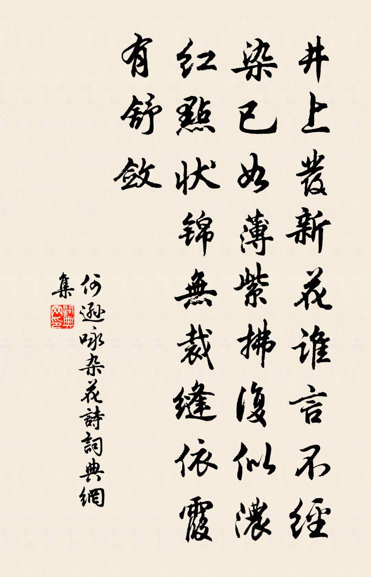 詩詞名句歷史字典書法欣賞書法字典國語詞典說文解字康熙字典古漢語字典標 題 作 者 詩 句 詠雜花詩作者:何遜 朝代:南北朝詠雜花詩原文井上發新花。誰言不經染。已如薄紫拂。復似濃紅點。狀錦無裁縫。依霞有舒斂。詩詞問答問:詠雜花詩的作者是誰?答:何遜問:詠雜花詩寫於哪個朝代?答:南北朝問:何遜的名句有哪些?答:何遜名句大全何遜詠雜花詩書法欣賞詠雜花詩書法作品詩詞推薦鐘山春遊任希夷〔宋代〕青樓醽醁客中聖,碧苑鞦韆人半仙。春滿江南佳麗地,綠楊芳草思娟娟。暑中客懷董嗣杲〔宋代〕飄蓬於此趣何迂,破卻牢愁是酒壺。世上利名休羨有,胸中丘壑不應無。秋侵客鬢從添白,春滿侯門亦謾朱。無地寒園即目詩庾信〔南北朝〕寒園星散居。搖落小村墟。遊仙半壁畫。隱士一床書。子月泉心動。陽爻地氣舒。雪花深數尺。冰床厚尺余。蒼鷹寒食臥疾喜李少府見尋王昌齡〔唐代〕弱冠早登龍,今來喜再逢。何知春月柳,猶憶歲寒松。煙火臨寒食,笠歌達曙鍾。喧喧鬥雞道,行樂羨朋從。正月九日雪霰後大雨范成大〔宋代〕黃昏檐溜垂瀑,清曉屐聲滿門。湖光萬頃何似?小沼先吹縠紋。舞鶴四絕岳珂〔宋代〕九皋仙子老芝田,小立清池阿那邊。忽作霓裳羽衣舞,天機未信只魚鳶。秋冬之間鄂渚絕市無蟹今日偶得數枚吐沫相濡黃庭堅〔宋代〕怒目橫行與虎爭,寒沙奔火禍胎成。雖為天上三辰次,未免人間五鼎烹。書況陸游〔宋代〕自從請老鏡湖濱,萬事不關林下人。鴉去鴉歸還過日,花開花落又經春。官微也過千重浪,身在依然一幅巾。晨突次朱天球贈吳茂先韻吳則禮〔宋代〕暮年挈挈儂與君,端覺高歌有鬼神。平生王恭無長物,此事逼人殊咄咄。戲談韁馬缺鼻牛,夫子大是孫殷流。休言初出金門,尋王侍御不遇,詠壁上鸚鵡李白〔唐代〕落羽辭金殿,孤鳴咤繡衣。能言終見棄,還向隴西飛。琮上人以詩惠茶筍史彌寧〔宋代〕解道碧雲句,三生湯惠休。試春輟鷹爪,斸雨餉獵頭。夢境可容到,饞涎那複流。舌端吾薦取,倘不負珍投。偈頌一百三十六首釋惟一〔宋代〕四葉紅蓮,一音宣演。其語巧妙,其義深過錯。前印威音,一點不差,後證彌勒,不差一點。離四句,絕百非,即簡友人吳則禮〔宋代〕江頭洲渚晚陽斜,宿雁已復取圓沙。老子尚堪巾屨在,憑君著意問梅花。秋夜會宿李永宅憶江南舊遊耿湋〔唐代〕偶宿俱南客,相看喜盡歸。湖山話不極,歲月念空違。子夜高梧冷,秋陰遠漏微。那無此良會,惜在謝家稀。新開小室陸游〔宋代〕並檐開小室,僅可容一幾。東為讀書窗,初日滿窗紙。衰眸頓清澈,不畏字如螘。琅然弦誦聲,和答有稚子。餘年天台福聖觀張無夢〔宋代〕天台瀑布落青天,觀在天台瀑布邊。道士只今燒藥處,仙翁曾是種芝田。龍居古洞遺殘雨,鶴出高巢點破煙。暫別少年行宋祁〔宋代〕君不見漢家五陵諸少年,白馬驪駒大道邊。紫綸裁帽映兩紐,黃金錯帶佩雙鞬。經過主第賜綠幘,歸宴前堂羅曲筵上平西王哲〔元代〕向終南,成遭遇,做風狂。便遊歷、海上嘉祥。閒閒得得,任從詞曲作詩章。自然神*,共交結、認正心香。真清隱居危固〔宋代〕高士隱居處,迢迢綠水灣。數間玉川屋,七里子陵灘。出入是非外,醉醒文字間。千鍾天子祿,不肯換清閒。芙蕖王安石〔宋代〕芙蕖耐夏復宜秋,一種今年便滿溝。南盪東陂無此物,但隨深淺見游鯈。名句推薦夢後樓台高鎖,酒醒簾幕低垂。晏幾道《臨江仙·夢後樓台高鎖》 玉樓金闕慵歸去,且插梅花醉洛陽朱敦儒《鷓鴣天·西都作》 白雲回望合,青靄入看無。王維《終南山》 勞歌一曲解行舟,紅葉青山水急流。許渾《謝亭送別》 生當復來歸,死當長相思。蘇武《留別妻》 人情已厭南中苦,鴻雁那從北地來。王勃《蜀中九日 / 九日登高》 山遠近,路橫斜,青旗沽酒有人家。辛棄疾《鷓鴣天·陌上柔桑破嫩芽》 凡傷寒之病,多從風寒得之。始表中風寒,入里則不消矣。張仲景《傷寒論·傷寒例》 倚竹不勝愁,暗想江頭歸路王之道《如夢令·一晌凝情無語》 斷送一生憔悴,只銷幾個黃昏。趙令畤《清平樂·春風依舊》