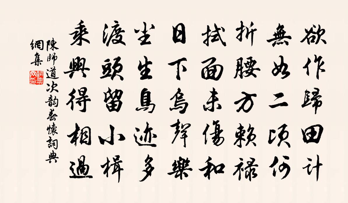 詩詞名句歷史字典書法欣賞書法字典國語詞典說文解字康熙字典古漢語字典標 題 作 者 詩 句 次韻春懷作者:陳師道 朝代:宋代次韻春懷原文欲作歸田計,無如二頃何。折腰方賴祿,拭面未傷和。日下烏聲樂,塵生鳥跡多。渡頭留小楫,乘興得相過。詩詞問答問:次韻春懷的作者是誰?答:陳師道問:次韻春懷寫於哪個朝代?答:宋代問:陳師道的名句有哪些?答:陳師道名句大全陳師道次韻春懷書法欣賞次韻春懷書法作品詩詞推薦喜見家山答守之二首錢時〔宋代〕喜見家山喜見晴,乾坤都屬舞雩春。家山自是山無數,認得春風定可人。琴操十首。別鵠操韓愈〔唐代〕(商陵穆子,娶妻五年無子。父母欲其改娶,其妻聞之,中夜悲嘯,穆子感之而作。本詞云:將乖比翼隔天端,山進聖訓宋度宗〔宋代〕寵頒御墨十行新,天賜光華被小臣。家學傳心當謹守,恩深何以報君親。省中晚步讀宛陵詩項安世〔宋代〕午夢睡新足,西溪微暑侵。高堂通爽氣,綠樹愛繁陰。甃潤冷侵舄,簾虛風入襟。獨攜梅老集,終日伴沉吟。次韻孫長文泊姑蘇館范成大〔宋代〕讀書窗下一燈殘,忽有詩來為暖寒。聞道扁舟春共載,雪雲雖冷不相干。朝謁建隆寺宋庠〔宋代〕郡國高皇朝,天龍釋帝居。兵銷擒布後,台聳畏軒餘。賓榻成蓮坐,戎韜入貝書。守臣榮就望,屏息拜前除。江城子張先〔宋代〕小圓珠串靜慵拈。夜厭厭。下重簾。曲屏斜燭,心事入眉尖。金字半開香穗小,愁不寐,恨西蟾。蝶戀花晏幾道〔宋代〕碾玉釵頭雙鳳小,倒暈工夫,畫得宮眉巧。嫩麯羅裙勝碧草,鴛鴦繡字春衫好。三月露桃芳意早,細看花枝,人面拜玄英先生畫像謝翱〔宋代〕來此得公真,塵埃避隱淪。水生溪榜夕,苔臥野衣春。雨冢侵吳甸,荒祠侑漢人。微吟值衰世,為爾獨傷神。和竹軒張史君來字韻二首王邁〔宋代〕金鳳傳呼紫馬來,壺山真面氣佳哉。朝天有路鹿呈瑞,應物無心鷗不猜。黍穋熟時農洗甑,芰荷香客銜杯。官穹職天香王觀〔宋代〕霜瓦鴛鴦,風簾翡翠,今年早是寒少。矮釘明窗,側開朱戶,斷莫亂教人到。重陰未解,雲共雪、商量不了。青帳則堂文天祥〔宋代〕北入京城,賈餘慶迎逢賣國。既令學士降詔,俾天下州郡歸附之。又各州付一省劄,惟樞密則堂、家先生鉉翁於省偈頌六十五首釋普濟〔宋代〕鐵蒺藜椎,轉弄轉危。丹霞燒木佛,院主落鬚眉。南山爐添今日火,作者不同歸。詠興五首。四月池水滿白居易〔唐代〕四月池水滿,龜游魚躍出。吾亦愛吾池,池邊開一室。人魚雖異族,其樂歸於一。且與爾為徒,逍遙同過日。爾無明叔惠示二頌雲見七佛偈似有有警覺乃是向道黃庭堅〔宋代〕平生討經論,苦行峻廉隅。偽契已無分,買山雲自俱。身為郎廟宰,夢作種田夫。欲辨身兼夢,還如鼓與桴。念奴嬌錢處仁〔宋代〕勛門積慶,為皇家此日,重生賢輔。崧岳儲神須信道,非特當年申甫。清白傳芳,高明馳譽,材更兼文武。黑頭年答梁大夫斷求息緣以躋高蹠兼簡清臣大夫韓維〔宋代〕人生會有本,本得求自忘。緣來與之俱,源壯流亦長。趨高顧為下,在得良已亡。金仙不吾欺,莊生助之揚。嗟我再次韻高斯得〔宋代〕神仙不求三朵花,顏色不求陰麗華。但願時清風日好,娛此無裘痴鈍老。花光雲錦柳麴塵, * 不用孔方兄。止過子隱堂為蕭寺題陳舜俞〔宋代〕東城蕭寺荒煙內,底事旌旗與客來。六代豪華歸茂草,少年風節有高台。門前好鳥鳴佳木,徑里閒僧掃綠苔。強為聖井亭張鎡〔宋代〕重到虛亭意豁然,望高容易覺秋天。山邊曠野全無水,樹雜輕煙日有田。極目幾時忘去路,西風何日送歸船。殘蟬名句推薦雨後寒輕,風前香軟,春在梨花。仲殊《柳梢青·吳中》 長風萬里送秋雁,對此可以酣高樓。李白《宣州謝朓樓餞別校書叔雲 / 陪侍御叔華登樓歌》 孫郎微笑,坐來聲噴霜竹黃庭堅《念奴嬌·斷虹霽雨》 楊柳千條拂面絲,綠煙金穗不勝吹。溫庭筠《題柳》 更落盡梨花,飛盡楊花,春也成憔悴。汪元量《鶯啼序·重過金陵》 山一程,水一程,身向榆關那畔行,夜深千帳燈。納蘭性德《長相思·山一程》 桂花香霧冷,梧葉西風影。高觀國《菩薩蠻·何須急管吹雲暝》 總是愁媒,欲訴誰消遣蘇軾《蝶戀花·蝶懶鶯慵春過半》 得其所利,必慮其所害;樂其所成,必顧其所敗。劉向《說苑·敬慎》 鵲橋波里出,龍車霄外飛。任希古《和長孫秘監七夕》