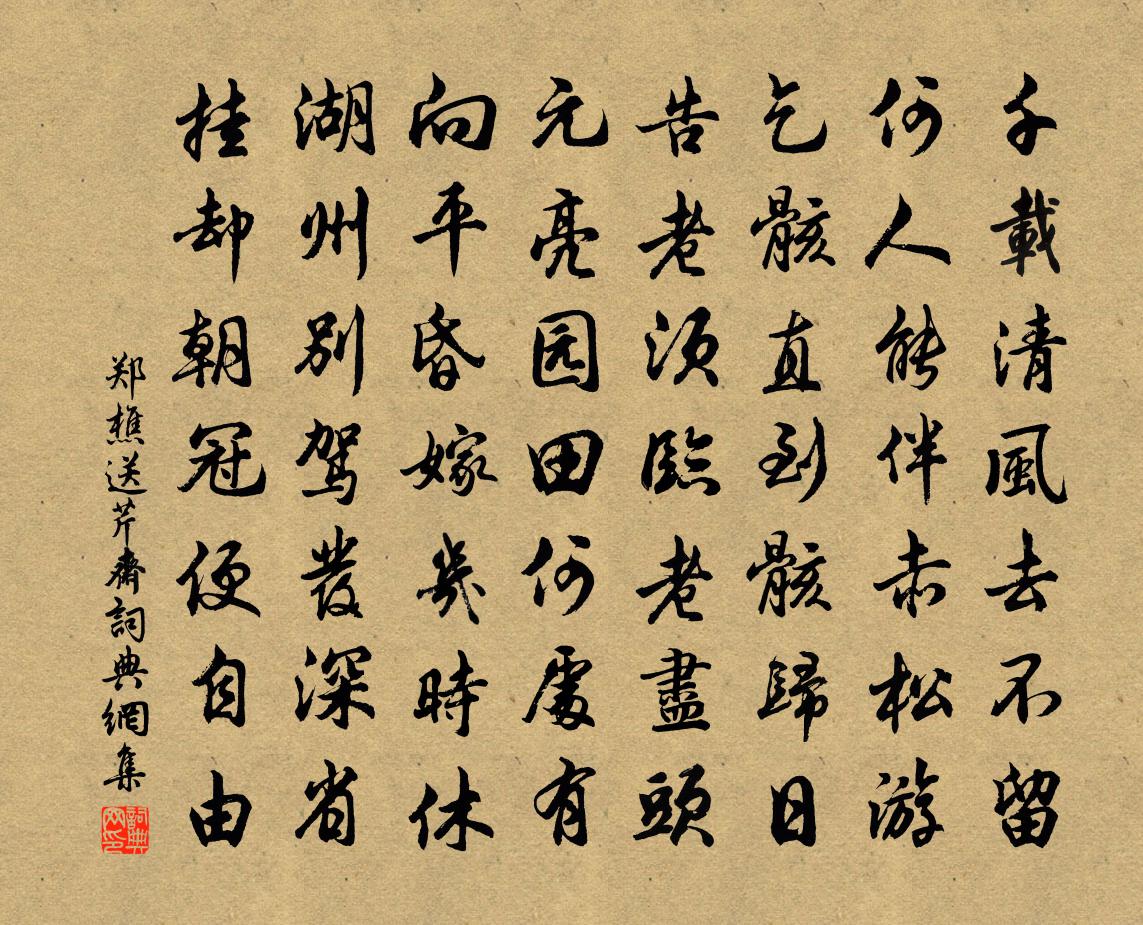 詩詞名句歷史字典書法欣賞書法字典國語詞典說文解字康熙字典古漢語字典標 題 作 者 詩 句 送芹齋作者:鄭樵 朝代:宋代送芹齋原文千載清風去不留,何人能伴赤松游。乞骸直到骸歸日,告老須臨老盡頭。元亮園田何處有,向平昏嫁幾時休。湖州別駕發深省,掛卻朝冠便自由。詩詞問答問:送芹齋的作者是誰?答:鄭樵問:送芹齋寫於哪個朝代?答:宋代鄭樵送芹齋書法欣賞送芹齋書法作品詩詞推薦梁父吟張耒〔宋代〕豪俊昔未遇,白日無光輝。隆中臥龍客,長嘯視群兒。九州英雄爭著鞭,黃星午夜照中原。君看慷慨有心者,乃是送康判官往新安(一作皇甫冉詩)劉長卿〔唐代〕不向新安去,那知江路長。猿聲近廬霍,水色勝瀟湘。驛路收殘雨,漁家帶夕陽。何須愁旅泊,使者有輝光。湖州歌九十八首 其六十四汪元量〔宋代〕牙檣暫住獻州城,鷺去鷗來管送迎。臥笑宮人擲骰子,金錢痴咒卜輸贏。行遇小雨馮時行〔宋代〕小雨暗兩岸,孤舟撐一篙。清同寒鷺迥,愁與暝雲高。已判亂波色,時饒點鬢毛。三農有重賦,為汝喜如膏。詠史詩驌驦陂胡曾〔唐代〕行行西至一荒陂,因笑唐公不見機。莫惜驌驦輸令尹,漢東宮闕早時歸。幽居即事陸游〔宋代〕山崦可伐薪,稻隴可負耒,但令二事集,一飽已有在。霜林兩株橘,春圃數畦菜,仁哉造物心,乞我曾不愛。炊烹九日奉懷子濟兄李洪〔宋代〕霜天寥落雁行孤,九日還能行樂無。料想山風吹醉帽,也應溪女解攜壺。賞心樂事今難偶,弟勸兄酬嘆莫俱。籬下絕句張伯端〔宋代〕鑒形閉氣思神法,初出艱難後坦途。倏忽雖能游萬國,奈何棄舊卻移居。以詩句詠梅點綴裙腰粉不掃方蒙仲〔宋代〕慎勿掃蒼苔,芳英堪藉地。丘壑足風流,欠得脂粉氣。家園小酌陸游〔宋代〕旋作園廬指顧成,柳陰已復著啼鶯。百年更把幾杯酒,一月元無三日晴。鷗鷺向人殊耐久,山林與世本無營。小詩次韻高子文李若水〔宋代〕歸計茫然殊未涯,倦遊日久似無家。十年燈火有何效,贏得眼前生眩花。贊歷代天師第二代嗣師諱衡字靈真白玉蟾〔宋代〕光和初載大丹成,有甚工夫事漢靈。夜半玉輿飛紫露,春風春雨滿陽平。朝天堤李翔〔宋代〕兩山吞浪白如煙,忽見橋樑接岸邊。已是築成堤上路,不須重喚渡頭船。千年野鶴歸華表,百尺長虹駕巨川。歲物鳳州柳曾極〔宋代〕蜀主函封遣使時,芳根元自鳳州移。柔荑醽醁今安在,唯有青絲拂地垂。次韻權季玉枕上偶成方回〔宋代〕邇日屢聞親藥鼎,客懷沈鬱與誰論。細參素問心無病,勤剔青燈眼未昏。九折政思為孝子,七襄未用乞天孫。察君雪夜候迎使客楊萬里〔宋代〕六花不放一塵生,晴後猶餘十日凝。新月未光輸與雪,夜風盡冷只留冰。候迎銀漢槎頭客,挑盡玉蟲窗下燈。紙帳鷓鴣天張掄〔宋代〕鶴馭來從玉席前。笑談勳業照凌煙。心游物外都無礙,春在壺中別有天。香似霧,酒如泉。華堂冰雪映神仙。靈椿觀長安城圖陸游〔宋代〕許國雖堅鬢已斑,山南經歲望南山。橫戈上馬嗟心在,穿塹環城笑虜孱。日暮風煙傳隴上,秋高刁斗落雲間。三秦陪丞相游石子澗黃庶〔宋代〕賓吏親攜澗底行,潺湲風遞似相迎。只應山鬼知公意,乞雨新添瀑布聲。澗下禽魚識上台,聽泉履跡遍蒼苔。岩邊虞美人·疏梅月下歌金縷晏幾道〔宋代〕疏梅月下歌金縷,憶共文君語。更誰情淺似春風,—夜滿枝新綠、替殘紅。蘋香已有蓮開信,兩槳佳期近。採蓮時名句推薦惆悵南朝事,長江獨至今。劉長卿《秋日登吳公台上寺遠眺》 嗚呼!楚雖三戶能亡秦,豈有堂堂中國空無人陸游《金錯刀行》 北斗酌美酒,勸龍各一觴。李白《短歌行》 公天下之身,公天下之物,其唯至人矣!列子及其弟子《列子·楊朱》 離愁漸遠漸無窮,迢迢不斷如春水。歐陽修《踏莎行·候館梅殘》 一語不入意,從君萬曲梁塵飛。李白《夜坐吟》 陰晴圓缺都休說,且喜人間好時節。徐有貞《中秋月·中秋月》 早須清黠虜,無事莫經秋岑參《送人赴安西》 正是浴蘭時節動。菖蒲酒美清尊共。歐陽修《漁家傲·五月榴花妖艷烘》 燕支落漢家,婦女無華色。李白《塞上曲》