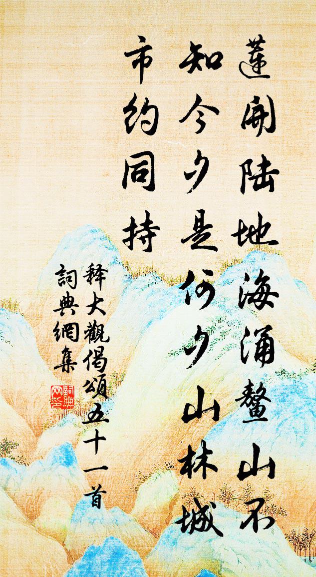 詩詞名句歷史字典書法欣賞書法字典國語詞典說文解字康熙字典古漢語字典標 題 作 者 詩 句 偈頌五十一首作者:釋大觀 朝代:宋代偈頌五十一首原文蓮開陸地,海涌鰲山。不知今夕是何夕,山林城市約同持。詩詞問答問:偈頌五十一首的作者是誰?答:釋大觀問:偈頌五十一首寫於哪個朝代?答:宋代釋大觀偈頌五十一首書法欣賞偈頌五十一首書法作品詩詞推薦癸亥春張嵲〔宋代〕荒村渺渺不知春,三見籬邊物態新。漸習魚蝦解蠻語,自疑元是魏塘人。深秋過源宗上人房(房一作方丈)李頻〔唐代〕到日值搖落,相留山舍空。微寒生夜半,積雨向秋終。度講多來雁,經禪少候蟲。方從聽話後,不省在愁中。近承琮上人問訊甚勤老懶不能作書以偈答之晁公溯〔宋代〕十年不到吳溪上,聞道禪龕更斬新。得見山中此松老,後來誰是住庵人。出城至呂公亭按視修堤陸游〔宋代〕翠靄橫山澹日升,孤亭聊借曲欄憑。霜威漸重江初縮,農事方休役可興。重阜護城高歷歷,千夫在野築登登。寓公姑蘇靈岩寺陳善〔宋代〕山僧不好古,改作任所欲。洞荒徑已迷,廊空響誰續。端午內中帖子詞夫人閣王珪〔唐代〕綠艾初垂戶,青菰已劍觴。人歸宮殿午,偏覺晝陰長。寄題天台國清寺齊梁體陸龜蒙〔唐代〕峰帶樓台天外立,明河色近罘罳濕。松間石上定僧寒,半夜楢溪水聲急。燈花徐夤〔唐代〕點蠟燒銀卻勝栽,九華紅艷吐玫瑰。獨含冬夜寒光拆,不傍春風暖處開。難見只因能送喜,莫挑唯恐墮成灰。貪膏蠶婦吟謝枋得〔宋代〕子規啼徹四更時,起視蠶稠怕葉稀。不信樓頭楊柳月,玉人歌舞未曾歸。長寧公主宅流杯景龍文館〔唐代〕憑高瞰迥足怡心,菌閣桃源不暇尋。余雪依林成玉樹,殘霙點岫即瑤岑。挽王房州伯洪林表民〔宋代〕崇牙出鎮古邊頭,名與龔黃地一流。方見勒碑歌善政,忽驚罷市哭仁侯。燕飛古巷人千里,梅落寒溪月一樓。前事西湖二詠其一觀捕魚蘇轍〔宋代〕西湖花不放長竿花入,群魚空作淘河食。漁人攘臂下前汀,蕩漾清波浮兩腋。藕梢菱蔓不容花,箔作長圍徒手得。偈五首釋道行〔宋代〕黃梅雨,麥秋寒。恁麽會,太無端。時節因緣佛性義,大都須是髑髏乾。採蓮子·船動湖光灩灩皇甫松〔唐代〕船動湖光灩灩秋,貪看年少信船流。無端隔水拋蓮子,遙被人知半日羞。贊三十六祖頌釋印肅〔宋代〕闍夜多因地,昔為自在天。一契無作性,大用得言前。表弟周明道工於傅神而山水亦佳,久別來訪,楊萬里〔宋代〕儂家有軸郭熙山,墮在水溪雪嶺間。有弟新來眼如月,為儂洗手拾將還。十二峰松巒閻伯敏〔宋代〕舟船搖搖大巫前,松前絲蘿望 * 。屏風角軒恰匝背,心在山頭人倚船。奉題林稚春菊花枕子歌林亦之〔宋代〕故人所說菊花枕,似把冰丸月下飲。秋水一雙明炯炯,數在青囊第一品。狂風江上吹蒹葭,此物往往得之嵇康阮籍櫻桃答李商隱〔唐代〕眾果莫相誚,天生名品高。何因古樂府,惟有鄭櫻桃。放鵲梅堯臣〔宋代〕鵲為禽之靈智兮,胡蹈機而不知。為席皁以困束兮,固性命之將危。喜遠人之至止兮,始屢驗以如期。向何預覺兮名句推薦機不密,禍先行。馮夢龍《醒世恆言·卷二十》 殘日東風,不放歲華去。吳文英《祝英台近·除夜立春》 敗葉填溪水已冰,夕陽猶照短長亭。納蘭性德《浣溪沙·敗葉填溪水已冰》 眾人助之以力,近者結之以成,遠者譽之以名,尊者載之以勢。韓非及後人《韓非子·功名》 蟬噪林逾靜,鳥鳴山更幽。王籍《入若耶溪》 無數春筍滿林生,柴門密掩斷行人。杜甫《詠春筍》 年時俯仰過,功名宜速崇。張華《壯士篇》 山遠翠眉長。高處淒涼。菊花清瘦杜秋娘。吳文英《浪淘沙·九日從吳見山覓酒》 好人之所惡,惡人之所好,是謂拂人之性,災必逮夫身。曾子《大學·第十一章》 寵辱不驚,肝木自寧陳繼儒《小窗幽記·集靈篇》