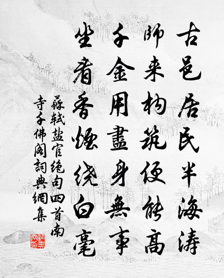 詩詞名句歷史字典書法欣賞書法字典國語詞典說文解字康熙字典古漢語字典標 題 作 者 詩 句 鹽官絕句四首南寺千佛閣作者:蘇軾 朝代:宋代鹽官絕句四首南寺千佛閣原文古邑居民半海濤,師來構築便能高。千金用盡身無事,坐看香菸繞白毫。詩詞問答問:鹽官絕句四首南寺千佛閣的作者是誰?答:蘇軾問:鹽官絕句四首南寺千佛閣寫於哪個朝代?答:宋代問:蘇軾的名句有哪些?答:蘇軾名句大全蘇軾鹽官絕句四首南寺千佛閣書法欣賞鹽官絕句四首南寺千佛閣書法作品詩詞推薦次虞憲日近即事五絕洪咨夔〔宋代〕梅桃結子綠陰濃,饒與葵榴自在紅。只有道根須猛進,未甘上下二之中。謁金門(和從周宣教韻祝千歲壽,請呼段、馬二生歌之)周必大〔宋代〕梅乍吐。趁壽席、香風度。人與此花俱獨步。風流天付與。好在青雲歧路。願共作、和羹侶。歸訪赤松辭萬戶。鶯離堆行范成大〔宋代〕殘山狠石雙虎臥,斧跡鱗皴中鑿破。潭淵油油無敢唾,下有猛龍跧鐵鎖。自從分流注石門,西州粳稻如黃雲。刲羊題王師尹宜晚樓仇遠〔宋代〕高卷書簾雨氣寒,螺屏擁髻赴滄灣。去天一握屋上屋,斜日幾重山外山。地展畫圖增暮景,風吹笑語落人間。棲鴉沁園春(問杜鵑)陳人傑〔宋代〕為問杜鵑,抵死催歸,汝胡不歸。似遼東白鶴,尚尋華表,海中玄鳥,猶記烏衣。吳蜀非遙,羽毛自好,合趁東風臨江仙趙長卿〔宋代〕元約三年。文卿不忍舍主,厥母不容與議,堅索之去。今失於一農夫,常常寄聲,或片紙數字問訊。仙源有感,遂小齋晚興楊萬里〔宋代〕不會鄰家養鴿兒,清晨齊放晚齊歸。網絲到處縈人鬢,欲打蜘蛛揀最肥。頌古一百二十一首釋宗杲〔宋代〕打破鬼門關,日輪正當午。一箭中紅心,大地無寸土。題簡寂觀許堅〔唐代〕嘗恨真風千載隱,洞天還得恣游遨。松楸古蹟一壇靜,鸞鶴不來青漢高。茅氏井寒丹亦化,玄宗碑斷夢曾勞。分明荒亭晚坐王禹偁〔宋代〕荒亭秋日沉,獨坐白頭吟。為郡殊無味,歸田素有心。鵲翻楓葉亂,蛬響菊叢深。微物休相聒,幽懷老不禁。夜興陸游〔宋代〕夜出茆堂自撤扃,烏藤與我兩伶俜。涼蟾吐暈圍千丈,老木移陰可一庭。隔浦呼嗚聞宿鳥,傍檐開闔數流螢。放翁奉和柳相公中書言懷包佶〔唐代〕運籌時所貴,前席禮偏深。羸駕歸貧宅,欹冠出禁林。鳳巢方得地,牛喘最關心。雅望期三入,東山未可尋。秋日綿溪吳龍翰〔宋代〕萬頃寒潭鏡面平,數聲征雁叫霜晴。滿林落葉秋風老,山路黃昏人少行。酬致政楊祭酒見寄李逢吉〔唐代〕初還相印罷戎旃,獲守皇居在紫煙。妄比酇侯功蔑爾,每懷疏傅意悠然。應將半俸沾閭里,料入中條訪洞天。十載妙空出示諸公詩卷次元韻李處權〔宋代〕已著芭蕉喻此身,木人花鳥豈知春。他家定自無生滅,此物何嘗有故新。美玉不羞論瓦礫,明珠終解照泥塵。相逢菩薩蠻佚名〔宋代〕銜泥雙燕來還去。臨終偈釋祖珍〔宋代〕生本無生,死本無死。生死二途,了無彼此。和漁具十絕牟巘五〔宋代〕披時響蕭騷,臥處堆偪仄。傲然煙雨中,安知有睢澤。舟次湖口追憶任明府李石〔宋代〕重來又十年,山水故悽然。獨雁仍為旅,雙鳧已作仙。濁流分蜀派,青色聚淮煙。石上罾魚者,猶言縣令賢。謝炭齊己〔唐代〕正擁寒灰次,何當惠寂寥。且留連夜向,未敢滿爐燒。必恐吞難盡,唯愁撥易消。豪家捏為獸,紅迸錦茵焦。名句推薦此路無知己,明珠莫暗投。高適《送魏八》 記得舊時,探梅時節。老來舊事無人說。呂本中《踏莎行·雪似梅花》 暗燈涼簟怨分離,妖姬,不勝悲。閻選《河傳·秋雨》 與朋友交遊,須將他們好處留心學來,方能受益;對聖賢言語,必要我平時照樣行去,才算讀書。王永彬《圍爐夜話·第二則》 人間夢隔西風,算天上、年華一瞬。吳文英《惜秋華·七夕》 漁舟逐水愛山春,兩岸桃花夾古津。王維《桃源行》 躞蹀御溝上,溝水東西流卓文君《白頭吟》 何時更杯酒,再得論心胸。李白《魏郡別蘇明府因北游》 無限傷心夕照中,故國淒涼,剩粉余紅。夏完淳《一剪梅·詠柳》 天降下民,作之君,作之師。惟曰其助上帝,寵之。孟子《孟子·梁惠王章句下·第三節》
