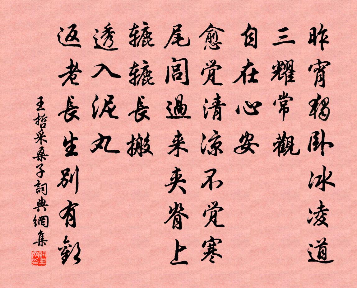 詩詞名句歷史字典書法欣賞書法字典國語詞典說文解字康熙字典古漢語字典標 題 作 者 詩 句 採桑子作者:王哲 朝代:元代採桑子原文昨宵獨臥冰凌道,三耀常觀。自在心安。愈覺清涼不覺寒。尾閭過來夾脊上,轆轆長搬。透入泥丸。返老長生別有歡。詩詞問答問:採桑子的作者是誰?答:王哲問:採桑子寫於哪個朝代?答:元代問:採桑子是什麼體裁?答:詞王哲採桑子書法欣賞採桑子書法作品詩詞推薦木假山記蘇洵〔宋代〕 木之生,或櫱而殤,或拱而夭;幸而至於任為棟樑,則伐;不幸而為風之所拔,水之所漂,或破折或腐;幸而震山岩李若水〔宋代〕翠石黏雲濕,寒岩帶蘚深。樹函懷古意,水印讀書心。經濟神猶在,幽棲逕可尋。青氈吾舊物,稅駕臥山陰。詠史詩夷門胡曾〔唐代〕六龍冉冉驟朝昏,魏國賢才杳不存。唯有侯嬴在時月,夜來空自照夷門。逢王建有贈張籍〔唐代〕年狀皆齊初有髭,鵲山漳水每追隨。使君座下朝聽易,處士庭中夜會詩。新作句成相借問,閒求義盡共尋思。經今牡丹舒岳祥〔宋代〕東風常帶三分冷,春日自有一種香。百花合和不可揀,中人如酒令人狂。馬塍賣花只貪早,野翁自愛開遲好。看花陪諸公攜酒山家用壁間韻三首汪炎昶〔宋代〕小試登臨腳,嵐光飾嫩情。跨虛橋緩渡,避險路迂行。端被狂為累,虛將飲得名。醉鄉前日近,可稍認途程。旬沐二首宋祁〔宋代〕待詔官非急,還家體不勤。里無休汝騎,窗有上羲人。密樹稍迎夏,晚花猶及春。幽懷誰與晤,杯酒強相親。衛節度赤驃馬歌岑參〔唐代〕君家赤驃畫不得,一團旋風桃花色。紅纓紫鞚珊瑚鞭,玉鞍錦韉黃金勒。請君鞲出看君騎,尾長窣地如紅絲。自矜寄子野仇遠〔宋代〕西窗隱几讀南華,頗悟亡羊與戰蝸。住久不知身是客,歸休誰謂女無家。向陽野竹先抽筍,待雪官梅欲試花。我愛贈庸齋劉克莊〔宋代〕挾策端平偶見遺,不旋踵已遇嘉熙。雖聞棲楚叩墀語,不見陽城伏合時。下殿君能和富范,上房吾願讓夷夔。或疑病起游近村陸游〔宋代〕老人摧頹絕造請,門設常關草生徑。一年三百六十日,三百五十九日病。一日不病出忘歸,繞村處處扣柴扉。水東次張以道韻張鎡〔宋代〕無愁便是樂無涯,看破紛紛眼裡花。旋洗杯盂將酒試,重糊窗戶把風遮。丹房火鼎頻添水,衣櫃香爐就焙茶。判卻晚過盤石寺禮鄭和尚岑參〔唐代〕暫詣高僧話,來尋野寺孤。岸花藏水碓,溪水映風爐。頂上巢新鵲,衣中帶舊珠。談禪未得去,輟棹且踟躕。偈頌一百零二首釋紹曇〔宋代〕明月可中庭,雁影沉寒水。烹金爐冷歲華深,九鼎遺言猶在耳。深深撥著,宿火通紅。不假一槌成大器,刈禾鐮子水調歌頭(題張晉英提舉玉峰樓)辛棄疾〔宋代〕木末翠樓出,詩眼巧安排。天公一夜,削出四面玉崔嵬。疇昔此山安在,應為先生見挽,萬馬一時來。白鳥飛不盡句宋成〔宋代〕湘是相分義,漓為離別名。菩薩蠻辛棄疾〔宋代〕淡黃弓樣鞋兒小。腰肢只怕風吹倒。驀地管弦催。一團紅雪飛。曲終嬌欲訴。定憶梨園譜。指日按新聲。主人朝玉詩王粲〔魏晉〕鷙鳥化為鳩。遠竄江漢邊。遭遇風雲會。託身鸞鳳間。天姿既否戾。受性又不閒。邂逅見逼迫。俛仰不得言。韋處士郊居雍陶〔唐代〕滿庭詩境飄紅葉,繞砌琴聲滴暗泉。門外晚晴秋色老,萬條寒玉一溪煙。用梁漕韻陳天麟〔宋代〕千里岷峨外,三年漢漾西。急流衛水馬,腐壤伏樗雞。伐樹驚遭宋,聞韶喜在齊。何時燈火夜,重與拆紅泥。名句推薦天門中斷楚江開,碧水東流至此回。李白《望天門山》 寧不知傾城與傾國。佳人難再得。李延年《李延年歌》 昨夜西風凋碧樹,獨上高樓,望盡天涯路。晏殊《蝶戀花·檻菊愁煙蘭泣露》 潮打三更瓜步月,雨荒十里紅橋火。鄭燮《滿江紅·思家》 虛靜無事,以暗見疵。韓非及後人《韓非子·主道》 午窗睡起鶯聲巧,何處喚春愁?朱淑真《眼兒媚·風日遲遲弄輕柔》 登高壯觀天地間,大江茫茫去不還。李白《廬山謠寄盧侍御虛舟》 不才明主棄,多病故人疏。孟浩然《歲暮歸南山 / 歸故園作 / 歸終南山》 惠子曰:子非魚,安知魚之樂?佚名《莊子與惠子游於濠梁》 無聊成獨臥,彈指韶光過。納蘭性德《菩薩蠻·新寒中酒敲窗雨》
