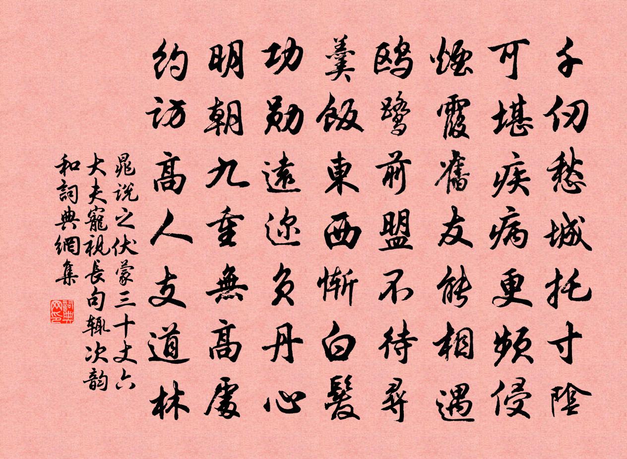 詩詞名句歷史字典書法欣賞書法字典國語詞典說文解字康熙字典古漢語字典標 題 作 者 詩 句 伏蒙三十丈六大夫寵視長句輒次韻和作者:晁說之 朝代:宋代原文千仞愁城托寸陰,可堪疾病更頻侵。煙霞舊友能相遇,鷗鷺前盟不待尋。羹飯東西慚白髮,功勳遠邇負丹心。明朝九重無高處,約訪高人支道林。詩詞問答問:《伏蒙三十丈六大夫寵視長句輒次韻和》的作者是誰?答:晁說之問:該詩寫於哪個朝代?答:宋代書法欣賞伏蒙三十丈六大夫寵視長句輒次韻和書法作品詩詞推薦漳州白蓮僧宗要見遺紙扇每扇各書一首蔡襄〔宋代〕不掩歌唇向畫堂,不須名筆作花房。直應攜去林泉好,轉覺林泉興味長。陪李北海宴歷下亭杜甫〔唐代〕東藩駐皂蓋,北渚凌青荷。海內此亭古,濟南名士多。雲山已發興,玉佩仍當歌。修竹不受暑,交流空涌波。蘊真月峽重九感懷李曾伯〔宋代〕落帽尋盟鬢久皤,今朝於此上嵯峨。雲收谷淨山新霽,風定沙平水不波。對菊使人懷古爾,思蓴如我感時何。明年和晏相公夜歸遇雪宋祁〔宋代〕孝王台下糅花飛,草草歸驂驟碧啼。斗作暝寒凌冒絮,更回餘舞拂鄣泥。城連迥闕迷蒼鳳,人度長橋壓素霓。頹玉松嶺吳芾〔宋代〕君愛山間十八公,儼然風操出樊籠。四時已占青青色,更有松黃勝萬紅。花果楊萬里〔宋代〕野花山果絕芳馨,借問行人不識名。蜂蝶行糧猿鶴飯,一生口分兩無爭。苦熱曾鞏〔宋代〕憶國中伏時,怫鬱炎氣升。赫日已照灼,赤雲助軒騰。積水殆將沸,清風豈能興。草木恐焚燎,窗扉似炊蒸。冰雪重陽後有作李新〔宋代〕白酒賢人趣,黃花道貌妝。物情殊未厭,時節不加長。自是良辰往,何妨後會張。試看人化鬼,不異露為霜。風入松(為謝省齊賦林壑清趣)周密〔宋代〕枇杷花老洞雲深。流水冷冷。藍田誰種玲瓏玉,土華寒、暈碧雲根。佳興秋英春草,好音夜鶴朝禽。閒聽天籟靜看細言雍裕之〔唐代〕蚊眉自可托,蝸角豈勞爭。欲效絲毫力,誰知螻蟻誠。和俞教授見寄並非韻黃庚〔宋代〕天邊日月似梭飛,百歲光陰難預期。有酒不妨留野客,無錢何惜典春衣。江山猶記登臨處,身世都非少壯時。晚影偁上人乾造延壽院乞頌釋正覺〔宋代〕叢林百丈有清規,特設堂安老病師。隱几虛心還自照,炷香孤坐絕他思。妙窮正念空三世,淨洗余昏月一墀。底意迎仙道中二首李彌遜〔宋代〕壺山孤秀似西山,道上歸人洗眼看。到我西山山有伴,不知誰伴此山閒。秋日聞蟬陸游〔宋代〕斷角斜陽觸處愁,長亭搔首晚悠悠。世間最是蟬堪恨,送盡行人更送秋。十喻詩 靈空詩蕭衍〔南北朝〕物情性異所異性。世心性同所同性。狀如薪遇火。亦似草行風。迷惑三界裡。顛倒六趣中。五愛性洞遠。十相法靈蕭宅二三子贈答詩二十首蝦蟆請客盧仝〔唐代〕凡有水竹處,我曹長先行。願君借我一勺水,與君晝夜歌德聲。送饒州張使君姚合〔唐代〕鄱陽勝事聞難比,千里連連是稻畦。山寺去時通水路,郡圖開處是詩題。化行應免農人困,庭靜惟多野鶴棲。飲罷人日登南陽驛門亭子懷漢川諸友孟浩然〔唐代〕朝來登陟處,不似艷陽時。異縣殊風物,羈懷多所思。剪花驚歲早,看柳訝春遲。未有南飛雁,裁書欲寄誰。寄題太和胡氏福榮堂周必大〔宋代〕福備天教百順並,應須富貴又長生。九霄慶澤沾身潤,五色綸章照眼明。翁媼歲時稱壽禮,兒孫晝夜讀書聲。來春景德以後祀五方帝十六首佚名〔宋代〕象分離位,德配炎精。景風協律,化神含生。百嘉茂育,仍順高明。神無常享,享於克誠。名句推薦嗟險阻,嘆飄零。關山萬里作雄行。劉克莊《玉樓春·戲林推》 學不可以已。荀子《荀子·勸學》 冬宜密雪,有碎玉聲。王禹偁《黃岡竹樓記》 閒門向山路,深柳讀書堂。劉昚虛《闕題》 嗜欲不能勞其目,淫邪不能惑其心佚名《黃帝內經·上古天真論》 斜日更穿簾幕,微涼漸入梧桐。晏殊《破陣子·燕子欲歸時節》 富觀其所與,貧觀其所取,達觀其所好,窮觀其所為王通《中說·卷二·天地篇》 審其名實,慎其所謂。公孫龍《公孫龍子·名實論》 轉禍而為福,因敗而為功。劉向《戰國策·燕一·燕文公時》 問汝平生功業,黃州惠州儋州。蘇軾《自題金山畫像》