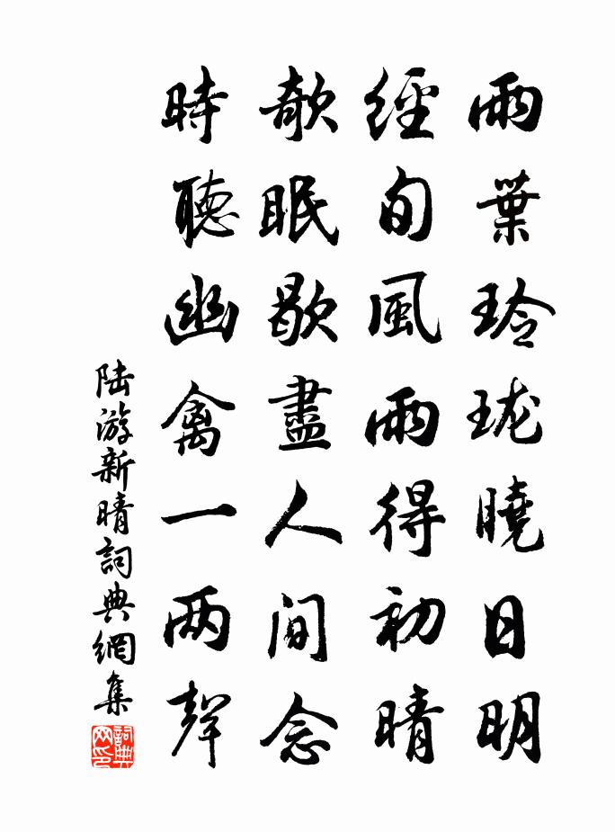 詩詞名句歷史字典書法欣賞書法字典國語詞典說文解字康熙字典古漢語字典標 題 作 者 詩 句 新晴作者:陸游 朝代:宋代新晴原文雨葉玲瓏曉日明,經旬風雨得初晴。欹眠歇盡人間念,時聽幽禽一兩聲。詩詞問答問:新晴的作者是誰?答:陸游問:新晴寫於哪個朝代?答:宋代問:陸游的名句有哪些?答:陸游名句大全陸游新晴書法欣賞新晴書法作品詩詞推薦得故人楊備書宋祁〔宋代〕款款南雲信,相存安穩不。比年常屬疾,茲地幸為州。浩蕩親知隔,奔騰日月遒。暴公初有刺,孫叔竟無謀。黑白七夕二首·其二德容〔唐代〕織女牽牛送夕陽,臨看不覺鵲橋長。最傷今夜離愁曲,遙對天涯愈斷腸。景福院黃執中〔宋代〕娟娟竹影薄,決決溪流淺。風生秋意回,野塘天容遠。示子孫陸游〔宋代〕累葉為儒業不隳,定知賢傑有生時。學須造次常於是,道豈須臾或可離?我老已無明日計,心存猶惜寸陰移。巍巍石瓮寺儲光羲〔唐代〕遙山起真宇,西向盡花林。下見宮殿小,上看廊廡深。苑花落池水,天語聞松音。君子又知我,焚香期化心。閨怨周在〔明代〕江南二月試羅衣,春盡燕山雪尚飛。應是子規啼不到,故鄉雖好不思歸。自規陸游〔宋代〕老疾今俱至,艱難亦備更。箇中無障蔽,何處欠光明?一日能用力,三年亦有成。修身在我爾,勉勉盡餘生。蘆蕭崱〔宋代〕江客因貧識荻芽,一清鏖退雜魚暇。燒來味挾蠔邊雨,掘得身離雁外沙。春饌且供行釜菜,秋妝莫管釣舡花。食根崇勝寺後,有竹千餘竿,獨一根秀出,人呼惠洪〔宋代〕高節長身老不枯,平生風骨自清癯。愛君修竹為尊者,卻笑寒松作大夫。未見同參木上座,空餘聽法石於菟。戲將贈王覯蘇軾〔宋代〕何人生得寧馨子,今夜初逢掣筆郎。莫怪圍棋忘瓜葛,已能作賦繼靈光。竹溪直院盛稱起予草堂詩之善暇日覽之多有可劉克莊〔宋代〕午杵誰敲臼,山童髻兩髽。偶因聲隔竹,不覺意思茶。北牖沉沉靜,南牆故故遮。微聞孤杵響,初試一旗斜。門掩相和歌辭。怨詩劉義〔唐代〕君莫嫌醜婦,醜婦死守貞。山頭一怪石,長作望夫名。鳥有並翼飛,獸有比肩行。丈夫不立義,豈如鳥獸情。郊外即事七首袁燮〔宋代〕舟中無事閱陳編,千古高風挹聖賢。奔走徒勞竟何補,興懷舊隱思悽然。南鄉子李之儀〔宋代〕春後雨余天。婭奼黃鸝勝品弦。榴葉千燈初報暑,階前。只有茶甌味最便。身世幾蹁躚。自覺年來更可憐。欲問此高開國輓詩魏了翁〔宋代〕並游英俊半歸泉,何事夫君又弱焉。廉退風標留萬口,勤勞心事入塵編。團團故步八千石,落落浮名四十年。除地寒食游香山喻良能〔宋代〕杖藜隨所適,花柳自村村。野岸桃臨水,人家竹映門。香泥飛燕子,芳草思王孫。著處堪沈醉,春醪正滿樽。送崔秀才二首梅堯臣〔宋代〕少年游太學,著盡篋中衣。獨劍自為伴,無家何處歸。秋蓬隨野轉,寒鵲遶林飛。霄漢有知己,行行寧久微。松江晚泊吳融〔唐代〕吳台越嶠兩分津,萬萬檣烏簇夜雲。吟盡長江一江月,更無人似謝將軍。次韻杜無逸西園獨坐九絕句傅察〔宋代〕聖德覆天下,歡然萬物春。北窗微笑傲,似是羲皇人。琴曲歌辭。宛轉行張籍〔唐代〕華屋重翠幄,綺席雕象床。遠漏微更疏,薄衾中夜涼。爐氳暗裴回,寒燈背斜光。妍姿結宵態,寢臂幽夢長。宛轉名句推薦聽人以言,樂於鐘鼓琴瑟。荀子《荀子·非相》 道由白雲盡,春與青溪長。劉昚虛《闕題》 相思一夜梅花發,忽到窗前疑是君。盧仝《有所思》 但箭雁沈邊,梁燕無主。劉辰翁《蘭陵王·丙子送春》 松月生夜涼,風泉滿清聽。孟浩然《宿業師山房期丁大不至 / 宿業師山房待丁大不至》 十分不耐煩,乃為人大病王永彬《圍爐夜話·第五四則》 單者易折,眾則難摧魏收《魏書·列傳·卷八十九》 夜飲東坡醒復醉,歸來仿佛三更。家童鼻息已雷鳴。蘇軾《臨江仙·夜飲東坡醒復醉》 晴野鷺鷥飛一隻,水葓花發秋江碧。皇甫松《天仙子·躑躅花開紅照水》 勝敗兵家事不期,包羞忍恥是男兒。杜牧《題烏江亭》