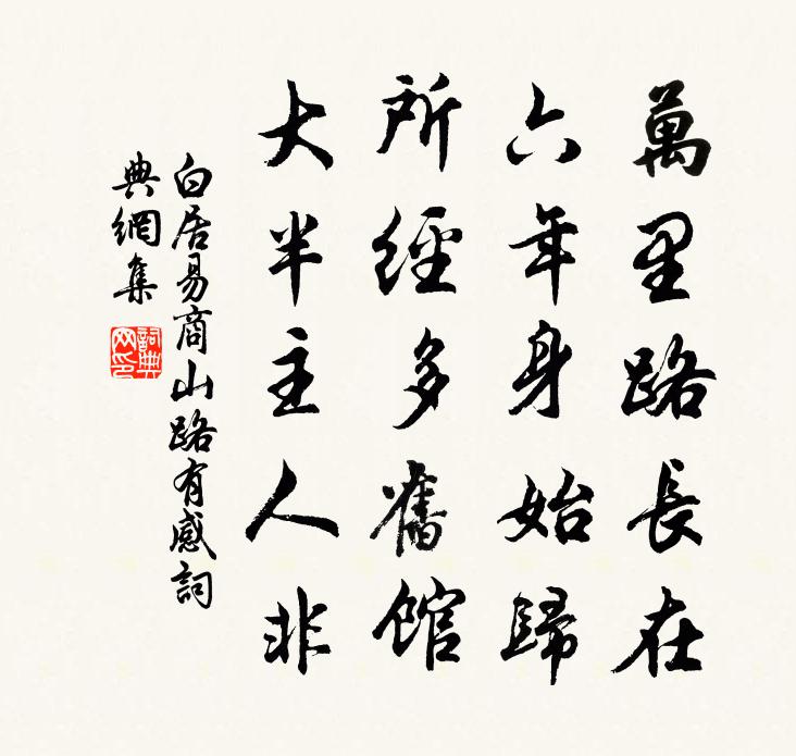 詩詞名句歷史字典書法欣賞書法字典國語詞典說文解字康熙字典古漢語字典標 題 作 者 詩 句 商山路有感作者:白居易 朝代:唐代商山路有感原文萬里路長在,六年身始歸。所經多舊館,大半主人非。詩詞問答問:商山路有感的作者是誰?答:白居易問:商山路有感寫於哪個朝代?答:唐代問:白居易的名句有哪些?答:白居易名句大全白居易商山路有感書法欣賞商山路有感書法作品詩詞推薦契重張載〔宋代〕契重金蘭屈指誰,偶然傾蓋接英輝。疏慵唱和應嫌晚,久淡封題莫厭稀。致主每思烹鼎說,剪戎何日檄書飛。安仁崖邊積雪取食清甚次敬夫韻林用中〔宋代〕崖邊瓊玖吐清光,偶到山間得味嘗。一段奇香今已會,冰牙冷齒裂人腸。遣騎問訊范明州參政,報章寄二絕句和韻謝之楊萬里〔宋代〕南海人從東海歸,新詩到日恰梅時。捻梅細比新詩看,未必梅花瘦似詩。東陽方韶卿惠古意七篇久不得和五月二十六日戴表元〔宋代〕作詩如挽船,學力乃篙櫓。向來牛耳盟,諸老肯多許。玄暉雲樹荒,仲宣江海阻。之子歸來歸,相思慰風雨。庭前梨桃二花方盛為暴風所吹感事成篇強至〔宋代〕梨白桃紅才可嘉,風前亂雪趁殘霞。提壺有口只喚酒,鳴鴃何心專妒花。九陌樂游非往昔,五陵豪氣漫塵沙。清樽謁新漢州範文叔度正〔宋代〕來紆廣漢紱,卻近子云居。風月誰同會,林泉樂有餘。卑詞老中允,分宅卜橫渠。後來端有望,吾道竟何如。山居十二首淳藏王〔宋代〕幽嚴靜坐來馴虎,古潤經行自狎鷗。不時忘機能絕念,大都投老得心休。山家李檝〔宋代〕日長無客到山家,蘚暈封苔一逕斜。睡美不知中夜雨,起來驚落半岩花。自上元後閒作五首張耒〔宋代〕燈火人家夜不收,三更明月過南樓。風煙隨處自能樂,何事客心還獨愁。薌林五十詠松湖楊萬里〔宋代〕已訝松生市,更將湖入城。如何造物者,百巧供先生。古老許惠李北海石室碑以詩促之黃庭堅〔宋代〕往時李北海,翰墨妙天下。石室蒼苔世未知,公獨得本今無價。肉字不肥藏兔鋒,郎官壁刊佳處同。願公倒篋速持旅中有感復有前韻陳棣〔宋代〕擿埴憑誰為指南,囊空羞澀不容探。年光有限堂堂去,世事無心細細參。故舊白頭驚未識,比隣青眼喜相諳。此生送月蓬道人南遊寄呈陽岩侍讀直院侍郎六言三劉克莊〔宋代〕首從淇奧君子,數到越王潞公。世僅有一兩個,君毋□八十翁。謝迤侍御送鶴王禹偁〔宋代〕兩朵春雲墮世間,霜台乞與縣僚看。骨含仙氣生來瘦,羽插天風過處寒。唳別繡衣聲寂寞,舞隨藍綬意闌珊。今朝詠萍劉繪〔南北朝〕可憐池內萍,葐蒀紫復青。巧隨浪開合,能逐水低平。微根無所綴,細葉詎須莖?飄泊終難測,留連如有情。和劉後村梅花百詠方蒙仲〔宋代〕香奩陋體實堪哀,慚謝諸公費挽推。鐵石心腸元作賦,浮華詎足定人才。和柳子玉官舍十首茴香黃庶〔宋代〕鄰家爭插紅紫歸,詩人獨行嗅芳草。叢邊幽蠹更不凡,蝴蝶紛紛逐花老。七夕祖詠〔唐代〕閨女求天女,更闌意未闌。玉庭開粉席,羅袖捧金盤。向月穿針易,臨風整線難。不知誰得巧,明旦試相看。九吟詩來賢吳昌裔〔宋代〕杖桂松花酒一瓢,手挼柏子雜香燒。山空露冷吟招隱,掉首諸賢不受招。南園陸游〔宋代〕曉鶯催系柳邊舟,老陌東風拂面柔。客里又驚春事晚,夢中重續栝蒼游。歡情飲量年年減,古寺名園處處留。卻羨名句推薦樹柤梨橘柚者,食之則甘,嗅之則香;樹枳棘者,成而刺人。故君子慎所樹。韓非及後人《韓非子·外儲說左下》 勿言草卉賤,幸宅天池中沈約《詠新荷應詔》 柏台霜威寒逼人,熱海炎氣為之薄。岑參《熱海行送崔侍御還京》 鴻雁向西北,因書報天涯。李白《千里思》 蜀國曾聞子規鳥,宣城還見杜鵑花。李白《宣城見杜鵑花 / 子規》 楚雖三戶能亡秦,豈有堂堂中國空無人!陸游《金錯刀行》 江春不肯留歸客,草色青青送馬蹄。劉長卿《送李判官之潤州行營》 日照新妝水底明,風飄香袂空中舉。李白《採蓮曲》 香爐初上日,瀑水噴成虹。孟浩然《彭蠡湖中望廬山》 賭勝馬蹄下,由來輕七尺。李頎《古意》
