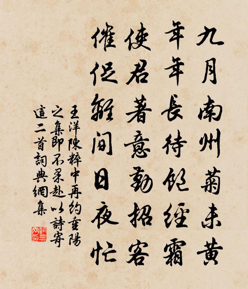 詩詞名句歷史字典書法欣賞書法字典國語詞典說文解字康熙字典古漢語字典標 題 作 者 詩 句 陳粹中再約重陽之集即不果赴以詩寄這二首作者:王洋 朝代:宋代原文九月南州菊未黃,年年長待飽經霜。使君著意勤招客,催促離間日夜忙。詩詞問答問:《陳粹中再約重陽之集即不果赴以詩寄這二首》的作者是誰?答:王洋問:該詩寫於哪個朝代?答:宋代書法欣賞陳粹中再約重陽之集即不果赴以詩寄這二首書法作品詩詞推薦櫻桃樹韋莊〔唐代〕記得初生雪滿枝,和蜂和蝶帶花移。而今花落游蜂去,空作主人惆悵詩。晚秋野望劉滄〔唐代〕秋盡郊原情自哀,菊花寂寞晚仍開。高風疏葉帶霜落,一雁寒聲背水來。荒壘幾年經戰後,故山終日望書回。歸途雪中晏殊〔宋代〕平台千里渴商霖,內史憂民望最深。衣上六花非所好,畝間盈尺是吾心。杜以詩和答依元韻贈之強至〔宋代〕子美沒已久,正風幾替陵。上天憂道喪,遠裔以詩承。駑足輒追駿,鷃心聊慕鵬。微之重堂奧,努力願同登。自平陽館赴郡暢當〔唐代〕晨興平陽館,見月沈江水。溶溶山霧披,肅肅沙鷺起。奉恩謬符竹,伏軾省頑鄙。何當施教化,愧迎小郡吏。寥落夸紅槿徐凝〔唐代〕誰道槿花生感促,可憐相計半年紅。何如桃李無多少,並打千枝一夜風。庭堅得邑太和六舅按節出同安邂逅於皖公溪口黃庭堅〔宋代〕江都克家才,萬卷書插架。願言渠出仕,從舅問耕稼。誰雲瀕老境,此子即長夜。歸歟淼前期,蒔橘鋤甘蔗。賀葉樞密得孫姜特立〔宋代〕鸞鳳難為種,尋常羽族繁。共期公入相,又見子生孫。衣缽傳親手,箕裘付後昆。韋平今遠矣,袞袞屬高門。題彭州陽平化徐氏〔唐代〕尋真游勝境,巡禮到陽平。水遠波瀾碧,山高氣象清。殿嚴孫氏貌,碑暗系師名。夜月登壇醮,松風森磬聲。菩薩蠻·堵蓮紅亂風翻雨張孝祥〔宋代〕堵蓮紅亂風翻雨。雨翻風亂紅蓮渚。深處宿幽禽。禽幽宿處深。淡妝秋水鑒。鑒水秋妝淡。明月思人情。情人思月遠將歸胡仲弓〔宋代〕不勘圖經認地名,亦知此去近桐城。行人未至心先至,羞勝離家第一程。秋日湖上憩水仙祠釋紹嵩〔宋代〕萬木已西風,千山景象通。岸拖秋草綠,日抹半山紅。穴蟻苔痕靜,詩人眼界空。水仙來往處,脈脈興何窮。和二十二弟龜山寺三絕晁說之〔宋代〕海岸石龜恨未平,時時入海自馮陵。此山磐礡清淮上,寶塔分功更就曾。所感吟邵雍〔宋代〕人生無定準,事體有多端。客宦危疑處,家書子細看。既曾憂險阻,方信喜平安。男子平生事,須於痛定觀。太府李萃卿輓詞張耒〔宋代〕妙譽馳場屋,家風在搢紳使華推厚德,卿月上通津。齒德時方重,山丘跡已陳。長年先友淚,懷感獨沾巾。清平樂陳德武〔宋代〕三三兩兩。夜夜教人想。偷入霜綃斜隙帳。直到珊瑚枕上。玉人夢繞江南。輸他一餉肥甘。莫恨我心兒毒,只因你送黃灝宋祁〔宋代〕橫步文林二十春,華顛初得半通綸。江邊又濯滄浪水,堂上寧招骯髒人。未分塵纓慚蕙帳,不緣羊酪棄羹蒪。思家清平樂趙汝迕〔宋代〕初鶯細雨。楊柳低愁縷。煙浦花橋如夢裡。猶記倚樓別語。小屏依舊圍香。恨拋薄醉殘妝。判卻寸心雙淚,為他花琴曲歌辭。別鶴王建〔唐代〕主人一去池水絕,池鶴散飛不相別。青天漫漫碧水重,知向何山風雪中。萬里雖然音影在,兩心終是死生同。池邊送李憲被召舊與其先侍郎游從陸游〔宋代〕早謁龍門鬢未秋,暮年乃復接英游。海瀕已幸見公子,瓜壟仍煩訪故侯。霖雨即陪諸老進,德星肯為一方留?西城名句推薦初報邊烽照石頭,旋聞胡馬集瓜州。陸游《送七兄赴揚州帥幕》 乖僻自是,悔誤必多;頹惰自甘,家道難成。朱柏廬《朱子家訓·全文》 蕭條亭障遠,悽慘風塵多庾信《擬詠懷二十七首·其二十六》 斟酌乎質文之間,而隱括乎雅俗之際,可與言通變矣。劉勰《文心雕龍·通變》 春風又綠江南岸,明月何時照我還?王安石《泊船瓜洲》 念佳人、音塵別後,對此應解相思。晁端禮《綠頭鴨·詠月》 織婦何太忙,蠶經三臥行欲老。元稹《織婦詞》 何用慰相思,裁書寄關右。李益《送諸暨王主簿之任》 浮雲遮月不分明,誰挽長江一洗放天青?董士錫《虞美人·韶華爭肯偎人住》 白日來深殿,青雲滿後塵杜甫《寄李十二白二十韻》