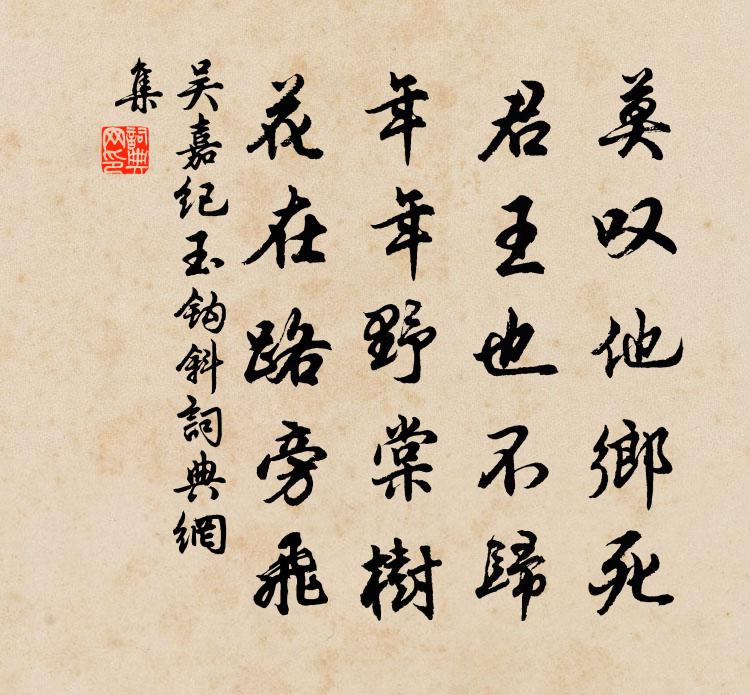 詩詞名句歷史字典書法欣賞書法字典國語詞典說文解字康熙字典古漢語字典標 題 作 者 詩 句 玉鉤斜作者:吳嘉紀 朝代:清代玉鉤斜原文莫嘆他鄉死,君王也不歸。年年野棠樹,花在路旁飛。詩詞問答問:玉鉤斜的作者是誰?答:吳嘉紀問:玉鉤斜寫於哪個朝代?答:清代問:玉鉤斜是什麼體裁?答:五絕吳嘉紀玉鉤斜書法欣賞玉鉤斜書法作品詩詞推薦奉和元日賜群臣柏葉應制趙彥昭〔唐代〕器乏雕梁器,材非構廈材。但將千歲葉,常奉萬年杯。花心動長筌子〔元代〕百歲光陰,似飄風浮漚,電雷轟掣。返照速修,急景難留,不覺鬢莘如雪。萬緣羈絆何時了,謾昏曉、寸心愁結。句張嘉貞〔唐代〕河魚未上凍,江蟄已聞雷。(見《緯略》)匡人一首劉克莊〔宋代〕匡人不識夫子,往往發其笥中。但有深衣古履,元無寶玉大弓。誡子何夢桂〔宋代〕魯語誨時羽,商書稱時敏。一字該二義,學者盍重省。又日新其德,成湯常自儆。三月不違仁,顏子獨深領。今日趙季茂通判惠詩走筆奉和十篇岳珂〔宋代〕置散分之宜,半生衡泌詩。神情一無系,山水兩相知。流詠雙魚寄,賞音孤竹吹。士篇聊報況,惟此尚堪為。題淮陰侯廟十首邵雍〔宋代〕一身作亂宜從戳,三族全夷似少恩。漢道是時初雜霸,蕭何王佐殆非尊。東壩崔敦禮〔宋代〕前夜湖山月,今朝瀨水船。飄零良自苦。浩蕩有誰憐。雲合前村雨,風收別浦煙。乘涼趣歸櫂,咫尺是金淵。挽崔舍人李處全〔宋代〕雅望高簪履,昌言動冕旈。五花方判事,萬戶合封侯。未換黃金帶,俄成白玉樓。匆匆大槐國,起滅等浮漚。分定吳潛〔宋代〕丁年曾授此東州,懇懇箋天得罷休。七上八下忽九閏,十洲三島終一游。人言官貴體當重,自笑兒痴病未瘳。只為古意三首張耒〔宋代〕橘犀如半月,何日是圓時。如何一種味,卻有兩人知。崑山龔立道昱有月石硯屏斗南君玉諸人皆有詩孫應時〔宋代〕窗間明月鎮長在,此寶如今更有無。看取光輝生筆硯,可無文字繼歐蘇。為黃仲宣賦山中四章章四句方回〔宋代〕山中之暮,豈不風雨。心與一燈,耿耿千古。秋懷十首微雲淡河漢疏雨滴梧桐為韻楊冠卿〔宋代〕寒蟬初停號,客燕催將歸。吾亦客一世,去此復焉依。斂袵聽物變,著書明化機。深參漆園史,渠語甚精微。揚州送伯齡過江盧仝〔唐代〕伯齡不厭山,山不養伯齡。松顛有樵墮,石上無禾生。不忍六尺軀,遂作東南行。諸侯盡食肉,壯氣吞八紘。不唧踏莎行晁端禮〔宋代〕罵女嗔男,呼奴喝爪。新來司戶多心躁。家中幸自好熙熙,眉兒皺著乾煩惱。飽喜飢嗔,多愁早老。古人言語分明得林正父察院書問訊甚勤以長句寄謝陸游〔宋代〕折柳湖南別尚新,書來已見柳搖春。故情有此膠投漆,薄俗從渠越視秦。長劍拄頤那復夢,短衣掩脛未全貧。有詩奉和聖制中春麟德殿會百僚觀新樂權德輿〔唐代〕仲春藹芳景,內庭宴群臣。森森列乾戚,濟濟趨鉤陳。大樂本天地,中和序人倫。正聲邁鹹濩,易象含羲文。玉俎阮郎歸趙眘〔宋代〕留連春意晚花稠。雲疏雨未收。新荷池面葉齊抽。涼天醉碧樓。能達理,有何愁。心寬萬事休。人生還似水中漚。上四明守黃侍郎辭延福釋智愚〔宋代〕石休久矣臥雲林,六十銀絲兩鬢侵。海上浮杯心已息,掬溪容我竊棠陰。名句推薦女子今有行,大江溯輕舟。韋應物《送楊氏女》 名不正,則言不順;言不順,則事不成孔子弟子《論語·子路篇》 無常亂之國,無不可理之民者。吳兢《貞觀政要·卷五· * 平》 陶令不知何處去, 桃花源里可耕田 * 《七律·登廬山》 紫泉宮殿鎖煙霞,欲取蕪城作帝家。李商隱《隋宮》 玉碗冰寒滴露華,粉融香雪透輕紗。晏殊《浣溪沙·玉碗冰寒滴露華》 翻空白鳥時時見,照水紅蕖細細香。蘇軾《鷓鴣天·林斷山明竹隱牆》 山下蘭芽短浸溪,松間沙路淨無泥。瀟瀟暮雨子規啼。蘇軾《浣溪沙·游蘄水清泉寺》 騎牛遠遠過前村,短笛橫吹隔隴聞。黃庭堅《牧童詩》 歸裝漸理君知否?笑指廬山古澗藤。陸游《自詠示客》
