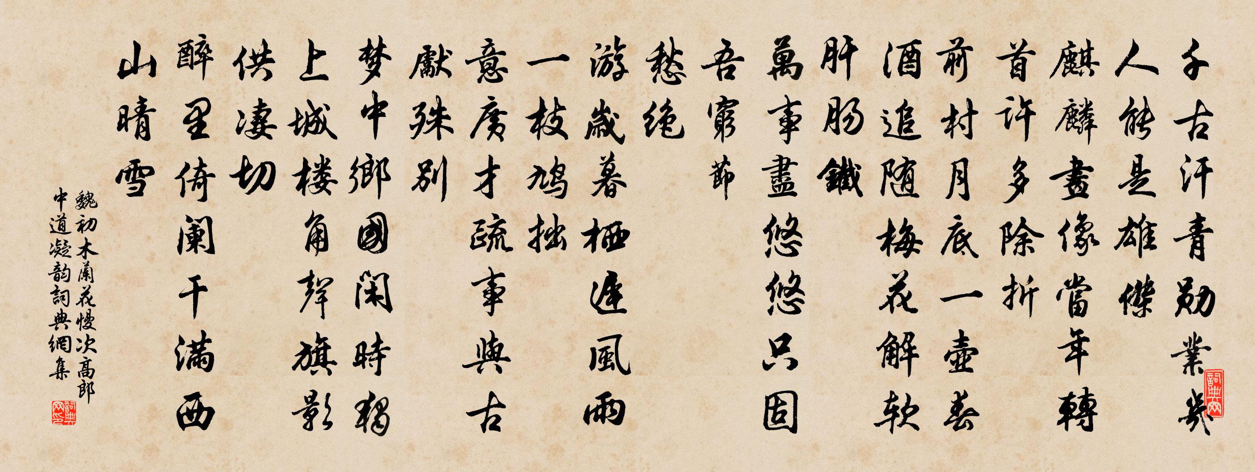 詩詞名句歷史字典書法欣賞書法字典國語詞典說文解字康熙字典古漢語字典標 題 作 者 詩 句 木蘭花慢 次高郎中道凝韻作者:魏初 朝代:元代木蘭花慢 次高郎中道凝韻原文千古汗青,勳業幾人,能是雄傑。麒麟畫像當年,轉首許多除折。前村月底,一壺春酒追隨,梅花解軟肝腸鐵。萬事盡悠悠,只固吾窮節。愁絕。游歲暮,棲遲風雨,一枝鳩拙。意廣才疏,事與古先殊別。夢中鄉國,閒時獨上城樓,角聲旗影供淒切。醉里倚闌乾,滿西山晴雪。詩詞問答問:木蘭花慢 次高郎中道凝韻的作者是誰?答:魏初問:木蘭花慢 次高郎中道凝韻寫於哪個朝代?答:元代問:木蘭花慢 次高郎中道凝韻是什麼體裁?答:詞魏初木蘭花慢 次高郎中道凝韻書法欣賞木蘭花慢 次高郎中道凝韻書法作品詩詞推薦除夕與家人飲梅堯臣〔宋代〕莫嫌寒漏盡,春色來應早。風開玉砌梅,薰歇金爐草。稚齒喜成人,白頭嗟更老。年華個裡催,清鏡寧長好。病題二首徐鉉〔唐代〕性靈書慵懶百無書能,唯被朝參遣夙興。聖主優容恩未答,丹經疏闊病相陵。脾傷對客偏愁書,眼暗看書每愧燈。摸魚子趙必岊〔宋代〕倚西風、招鴻送燕,年華今已如客。青奴一餉貪涼夢,昨夜酒紅無力。愁似織。聽鳴葉寒蟬,話到情無極。舞衣春寄楊德逢王安石〔宋代〕山樊老憚暑,獨寤無所適。湖陰宛在眼,曠若千里隔。遙聞青秧底,復作龜兆坼。占歲以知子,將勤而後食。穿溝次韻十絕發書樓鑰〔宋代〕故人惟賴幾行書,今日誰能更訪吾。舊日熱心今就冷,向來已自得揶揄。東窗梅影上有寒雀往來楊萬里〔宋代〕梅花寒雀不須摹,日影描窗作畫圖。寒雀解飛花解舞,君看此畫古今無。歲暮江軒寄盧端公趙嘏〔唐代〕積水生高浪,長風自北時。萬艘俱擁棹,上客獨吟詩。路以重湖阻,心將小謝期。渚雲愁正斷,江雁重驚悲。笑憶輞川集二十首宮槐陌裴迪〔唐代〕門前宮槐陌,是向欹湖道。秋來山雨多,落葉無人掃。宛丘作宋祁〔宋代〕宛丘真善地,承詔幸班春。鈴下聽無訟,日邊來有人。吟餘多感客,睡足本慵身。蟣虱休相賀,吾今湯沐頻。長思仙侯善淵〔元代〕既為人。勿因循。百歲光陽有幾能。虛勞染世塵。好修真。養元神。兩耀交光碾玉輪。 * 一點純。八月十二日夜偕客賞木犀八首陳造〔宋代〕衰懷對客便超然,病骨枝梧勝去年。未作槌腰摩腹想,尚堪淥蟻翠蛾前。犬梅堯臣〔宋代〕常隨輕騎獵,不獨朱門守。鷹前任指蹤,雪下還狂走。人思上蔡遲,書寄華亭後。莫將呼作龍,粱肉才經口。已亥雜詩 52龔自珍〔清代〕齒如編貝漢東方,不學咿嚘況對揚。屋瓦自驚天自笑,丹毫圓折露華瀼。和慎思詩呈同院諸公蔡肇〔宋代〕諸彥聯翩入,斯文迤邐回。滔滔引溟漲,爛爛繚岩隈。此地身拘窘,他時心往來。倡酬真有味,雇我獨非才。歐陽永叔寄琅琊山李陽冰篆十八字並永叔詩一梅堯臣〔宋代〕我坐許昌塵土中,山翠泉聲違眼耳。公雖被謫守滁陽,日少郡事窮山水。東南有風西北來,忽得書詩連數紙。並寄卜運算元張幼謙〔宋代〕去時不由人,歸怎由人也。羅帶同心結到成,底事教┾舍。心是十分真,情沒些兒假。若道歸遲打棹篦,甘受三千贈桂琴隱先生傅子云韻桂柔夫〔宋代〕君是軼群者,當知不可羈。淵源象山學,聲價鯉庭詩。要路足將策,高雲翅肯垂。餘波幸沾丐,活我出污池。復湖陸游〔宋代〕世事相尋敗與成,湖中畚鍤浩縱橫。共知陂壞行當復,敢恨台高既已傾。天鏡忽看孤月墮,樵風長送片帆輕。下臨過泗上喜見張嘉父二首蘇軾〔宋代〕眉間冰雪照淮明,筆下波瀾老欲平。直得全生如許妙,不知形諜已多名。偈頌七十六首釋師範〔宋代〕去年不在家,虛過重陽節。今年既在家,須要強施設。淡水煮冬瓜,真箇滋味別。不知滋味者,卻似嚼生鐵。名句推薦知足之心,可用之以處境,不可用之以讀書。王永彬《圍爐夜話·第一五九則》 手種黃柑二百株,春來新葉遍城隅。柳宗元《柳州城西北隅種柑樹》 野花不種年年有,煩惱無根日日生。馮夢龍《警世通言·卷二十》 雲盡月如練,水涼風似秋。歐陽詹《荊南夏夜水樓懷昭丘直上人云夢李莘》 故國山川,故園心眼,還似王粲登樓。周密《一萼紅·登蓬萊閣有感》 試問閒愁都幾許?賀鑄《青玉案·凌波不過橫塘路》 君者,舟也;庶人者,水也。水則載舟,水則覆舟。荀子《荀子·哀公》 野梅燒不盡,時見兩三花劉基《古戍》 仍憐故鄉水,萬里送行舟。李白《渡荊門送別》 雨中百草秋爛死,階下決明顏色鮮。杜甫《秋雨嘆三首》
