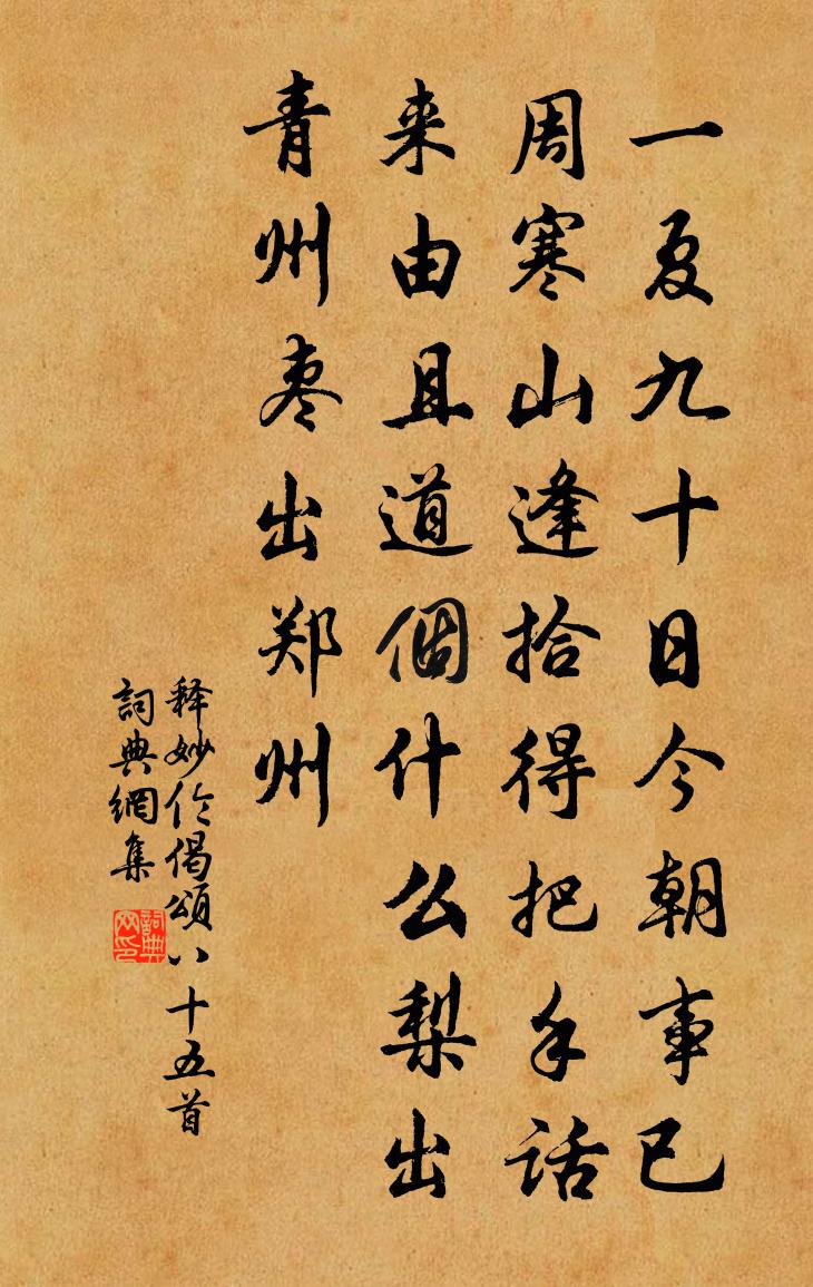 詩詞名句歷史字典書法欣賞書法字典國語詞典說文解字康熙字典古漢語字典標 題 作 者 詩 句 偈頌八十五首作者:釋妙倫 朝代:宋代偈頌八十五首原文一夏九十日,今朝事已周。寒山逢拾得,把手話來由。且道個什麼,梨出青州,棗出鄭州。詩詞問答問:偈頌八十五首的作者是誰?答:釋妙倫問:偈頌八十五首寫於哪個朝代?答:宋代釋妙倫偈頌八十五首書法欣賞偈頌八十五首書法作品詩詞推薦憶江南·江南憶白居易〔唐代〕江南憶,其次憶吳宮。吳酒一杯春竹葉,吳娃雙舞醉芙蓉,早晚復相逢。賀孫知從改章服唐仲友〔宋代〕蚤歲蹉蛇晚節全,舉觴猶自吸長川。紫泥優渥逢熙事,朱紱榮華慰暮年。強效瓊杯喔慶語,欲將鐵杖壽真仙。明堂偶倚柴隨亨〔宋代〕西風獨憑闌乾處,可是愁中鬢易華。老木不生秋後葉,孤燈空結夜來花。中原落日無歸雁,故國青山有去鴉。欲向暮雲辭白玉蟾〔宋代〕雲行太虛中,薄暮何冥冥。仰望青松梢,上有白雪翎。千岸舞落葉,萬樹羅翠屏。流水咽寒澗,湛露濡香蘅。幽人讀坡詩鄭剛中〔宋代〕公詩如春風,著物便新好。春風常自然,初不費雕巧。又如荊山玉,不問與多少,傳流落人間,皆作希世寶。吾得初及第歸題淨慈寺壁二絕劉渙〔宋代〕彤扉新授紫皇宣,品作蓬壺二等仙。今日訪師無限意,應憐憔悴勝當年。在伯教授為考試之行不知其地漫成五詩送之趙蕃〔宋代〕已孤萬古中秋月,為約黃花九日杯。但得交情常舊雨,不辭尊酒理新醅。和郭功父韻送芝道人游隱靜蘇軾〔宋代〕觀音妙智力,應感隨緣度。芝師訪東坡,寧辭萬里步。道義偶相契,十年同去住。行窮半世間,又欲浮杯渡。我願次沈倅韻呈王漕陳造〔宋代〕王家流慶水傾東,不獨烏衣紀數公。天畀臧孫當有後,人遲汲直未居中。鳳巢袞袞九文羽,鵬路搖搖萬里風。隔坐雜言送黎六郎(壽陽公之子)韋應物〔唐代〕冰壺見底未為清,少年如玉有詩名。聞話嵩峰多野寺,不嫌黃綬向陽城。朱門嚴訓朝辭去,騎出東郊滿飛絮。河南到白水有感陳著〔宋代〕吾氣已衰颯,茲行增慘淒。近山雲易雨,積水路如溪。寒食紙錢樹,舊遊莎草畦。頹牆獨立久,百感付鵑啼。和子瞻題風水洞蘇轍〔宋代〕風送江湖滿洞天,洞門可聽人無緣。土囊郁怒聲初散,石齒聱牙勢未前。樂奏洞庭真跌宕,歌傳帝所亦清便。何人安陽好/憶江南韓琦〔宋代〕安陽好,形勢魏西州。曼衍山川環故國,昇平歌吹沸高樓。和氣鎮飛浮。籠畫陌,喬木幾春秋。花外軒窗排遠岫,辭酒賀鑄〔宋代〕魯酒一樽薄,吾愁萬斛多。塵埃斬馬劍,涕泗飯牛歌。髀肉生如許,顛毛黑幾何。功名可復道,身世兩蹉跎。和張伯常賀遷資政司馬光〔宋代〕不駕使車開漢關,不棲岩穴鍊金丹。豈無開徑三人友,分著垂緌五寸冠。道中贈桓司馬季珪詩何遜〔南北朝〕晨纜雖同解。晚洲阻共拾。猶如征鳥飛。差池不可及。本願申覊旅。何言異翔集。君渡北江時。詎今南浦泣。句張孜〔唐代〕著牙賣朱紫,斷錢賒舉選。華山秀作英雄骨,黃河瀉出縱橫才。夢破青霄春,煙霞無去塵。若夸郭璞五色筆,江淹記蕭大山父子樂雷發〔宋代〕仙桂靈椿各典刑,飄飄姿韻激天鯨。家傳八葉鹽梅種,詩接三蘇父子名。四海盡將看縣譜,一堂那許與文盟。塵埃次韻石七三六言七首黃庭堅〔宋代〕為君試講古學,此事可牋天公。君看花梢朝露,何如松上霜風。句張釜〔宋代〕出郭西湖近。名句推薦六翮飄颻私自憐,一離京洛十餘年。高適《別董大二首》 攀出牆朵朵花,折臨路枝枝柳。關漢卿《一枝花·不伏老》 枯枝無醜葉,涸水吐清泉李白《長歌行》 落葉人何在,寒雲路幾層。李商隱《北青蘿》 春風十里揚州路,卷上珠簾總不如。杜牧《贈別》 彩舟載得離愁動。無端更借樵風送。賀鑄《菩薩蠻·彩舟載得離愁動》 年年社日停針線。怎忍見、雙飛燕。黃公紹《青玉案·年年社日停針線》 執一者至貴也,至貴者無敵。呂不韋《呂氏春秋·覽·離俗覽》 吹笳暮歸野帳,雪壓青氈。陸游《漢宮春·初自南鄭來成都作》 仁則榮,不仁則辱。今惡辱而居不仁,是猶惡濕而居下也。孟子《孟子·公孫丑章句上·第四節》