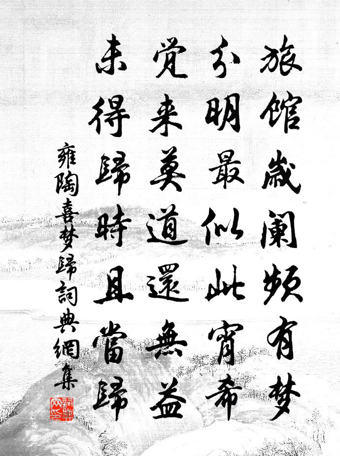 詩詞名句歷史字典書法欣賞書法字典國語詞典說文解字康熙字典古漢語字典標 題 作 者 詩 句 喜夢歸作者:雍陶 朝代:唐代喜夢歸原文旅館歲闌頻有夢,分明最似此宵希。覺來莫道還無益,未得歸時且當歸。詩詞問答問:喜夢歸的作者是誰?答:雍陶問:喜夢歸寫於哪個朝代?答:唐代問:喜夢歸是什麼體裁?答:七絕雍陶喜夢歸書法欣賞喜夢歸書法作品注釋全唐詩:卷518-61詩詞推薦鸂鶒李群玉〔唐代〕錦羽相呼暮沙曲,波上雙聲戛哀玉。霞明川靜極望中,一時飛滅青山綠。雨中花/夜行船張孝祥〔宋代〕一舸凌風,斗酒酹江,翩然乘興東遊。欲吐平生孤憤,壯氣橫秋。浩蕩錦囊詩卷,從容玉帳兵籌。有當時橋下,取和張君美韻二首吳芾〔宋代〕志大空憂國,途窮欲問天。功名羞短褐,蹭蹬惜流年,死友留天末,生涯寄海邊。相逢是何日,回首重依然。和十一侍郎韓維〔宋代〕地傳槐大井泉深,昔侍先庭此鎮臨。奉使共成三世澤,思親遠滄百年心。懷金豈足驕顏氏,抱瓮徒勞拙漢陰。抖擻野路見棠梨紅葉為斜日所照尤可愛宋祁〔宋代〕葉葉棠梨戰野風,滿枝哀意為秋紅。無人解賞如丹意,拋在荒城斜照中。感寓二首梁德裕〔唐代〕彩雲呈瑞質,五色發人寰。獨作龍虎狀,孤飛天地間。隱隱臨北極,峨峨象南山。恨在帝鄉外,不逢枝葉攀。幽澗襄樊失守彭秋宇〔宋代〕六年援絕困重圍,到此無謀更出奇。慵慨如張雖有愧,孤窮似李亦堪悲。列城寒月驚鴻散,夷路西風哨馬馳。機速挽林學錄五言二首劉克莊〔宋代〕昔報尊公訃,奔喪萬里程。生居諸子下,身代二兄行。負骨嘆純孝,分財見不爭。九原面先舅,應問白頭甥。古意畢耀〔唐代〕璇閨繡戶斜光入,千金女兒倚門立。橫波美目雖往來,羅袂遙遙不相及。聞道今年初避人,珊珊掛鏡長隨身。願得傷春黃庚〔宋代〕東皇別我太匆匆,急景相催鬢已翁。杜宇一聲花結局。人生消得幾春風。次韻晉侄招予及同年飲許月卿〔宋代〕戀闕重陽不入都,菊英雖好不乾渠。樽前丞相方行酒,花外堯夫恰小車。羯末封胡延客醉,雷陳張范預期酤。他年制乾判院初度載臨謹以梅起興賦三絕句為斯文度正〔宋代〕冰魂玉岳映霜林,四月飛成點點金。遙想清香能止渴,應知此意可為霖。雞唱歌項安世〔宋代〕莫歌雞唱曉,老淚不禁彈。昔為祖士雅,今作杜齊安。句周式〔宋代〕珠簾繡戶遲遲日,柳絮梨花寂寂春。仲天貺、王元直自眉山來見余錢塘,留半歲,蘇軾〔宋代〕海角煩君遠訪,江源與我同來。剩作數詩相送,莫教萬里空回。鷓鴣天郭應祥〔宋代〕鸞誥雙雙婦與姑。家尊榮宦到中都。暫時花縣飛鳧舃,新看芝庭捧鶴書。梅欲放,柳將舒。誕辰先占一陽初。清心和鄭相演楊尚書蜀中唱和詩姚合〔唐代〕天福坤維厚,忠賢擁節旄。江同渭濱遠,山似傅岩高。元氣符才格,文星照筆毫。五言全麗則,六義出風騷。聖日減字木蘭花趙長卿〔宋代〕半窗斜月。茅店蕭條燈已滅。床下蛩聲。聲動淒涼不忍聽。終宵無寐。覆去翻來真箇是。屈指歸期。應是梅花爛熳騶虞佚名〔先秦〕彼茁者葭,壹發五豝,於嗟乎騶虞!彼茁者蓬,壹發五豵,於嗟乎騶虞!寄玉溪林逢吉六首戴復古〔宋代〕心腹相知會面稀,一春未有盍簪期。西窗風雨愁眠夜,夢到君家賦小詩。名句推薦遙知未眠月,鄉思在漁歌。杜荀鶴《送人游吳》 蓮子已成荷葉老。青露洗、蘋花汀草。李清照《怨王孫·湖上風來波浩渺》 春思亂,芳心碎。惠洪《千秋歲·半身屏外》 天下從事者,不可以無法儀。無法儀而其事能成者,無有。墨子《墨子·04章 法儀》 拆桐花爛熳,乍疏雨、洗清明。柳永《木蘭花慢·拆桐花爛熳》 木蘭舟上,何處吳娃越艷:藕花紅照臉。孫光憲《河傳·風颭》 平明日出東南地,滿磧寒光生鐵衣。李益《度破訥沙二首·其二 / 塞北行次度破訥沙》 喜遇重陽,更佳釀今朝新熟。宋江《滿江紅·喜遇重陽》 想得玉人情,也合思量我。孫光憲《生查子·窗雨阻佳期》 常恐秋風早,飄零君不知。盧照鄰《曲池荷》